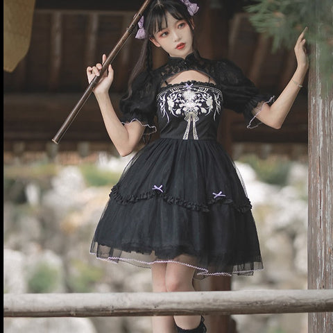 チャイニーズ華ロリ鳳凰プリント シースルーと金リボン 長袖ドレス