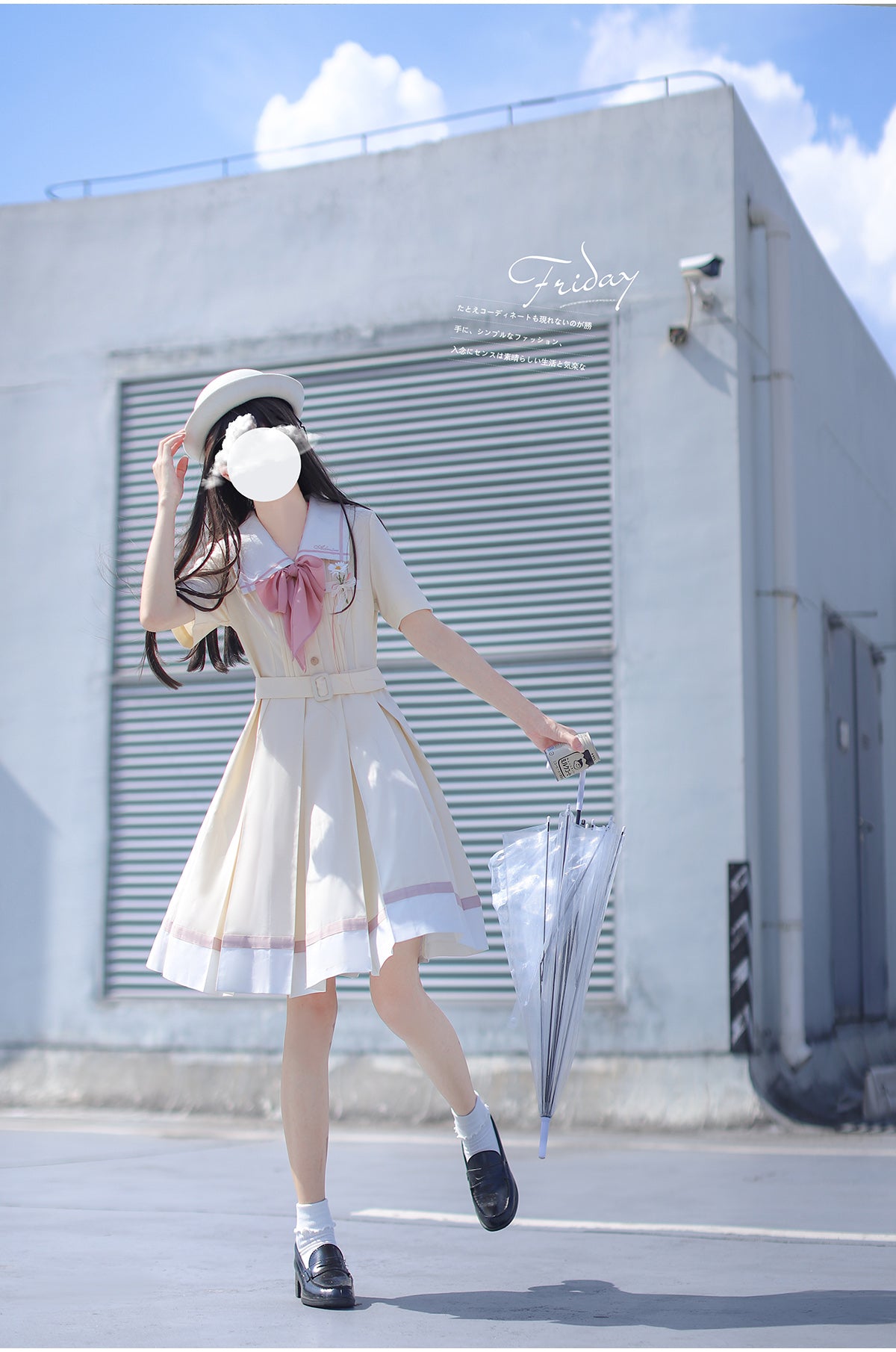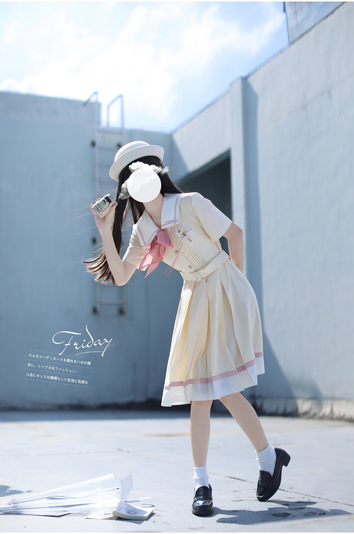 セーラー襟とプリーツスカートが清楚な印象を与えてくれます。帽子を合わせた制服風の着こなしもおすすめです。