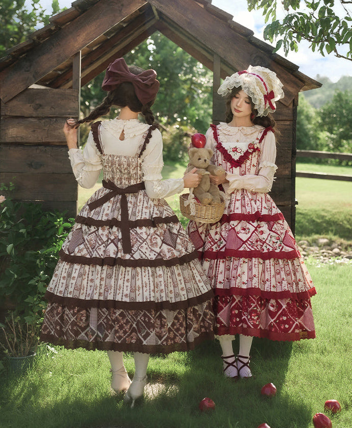 こっくりしたレッドやブラウンにお花のプリントが秋冬にぴったりなジャンパースカート。布ベルトとリボン付き。