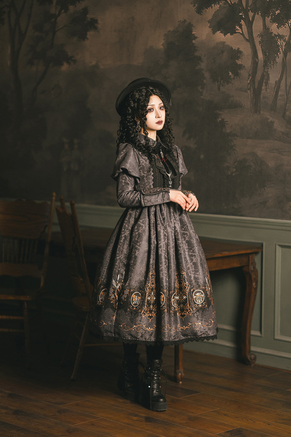 ゴシックな雰囲気のプリントで仕立てられたワンピース。ジャボタイと布ベルト付。