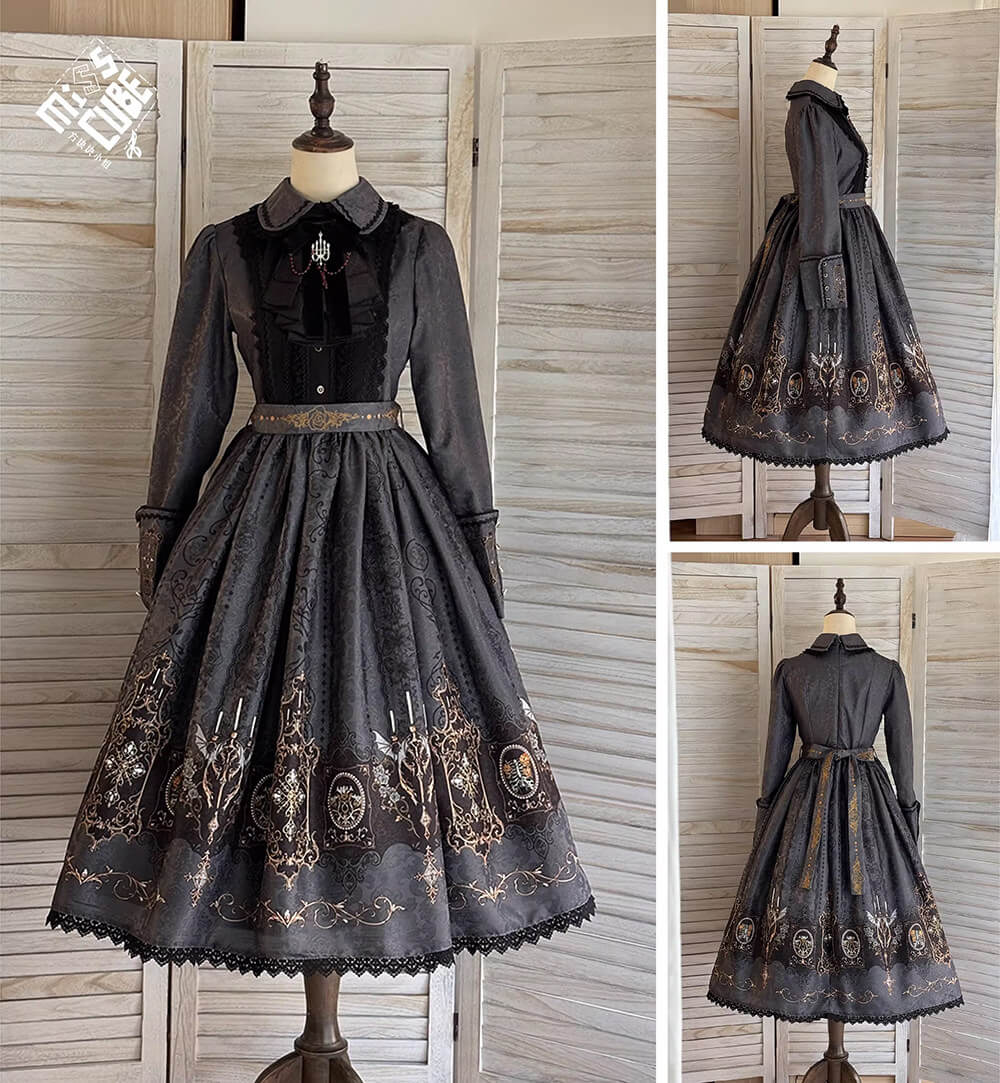 ゴシックな雰囲気のプリントで仕立てられたワンピース。ジャボタイと布ベルト付。