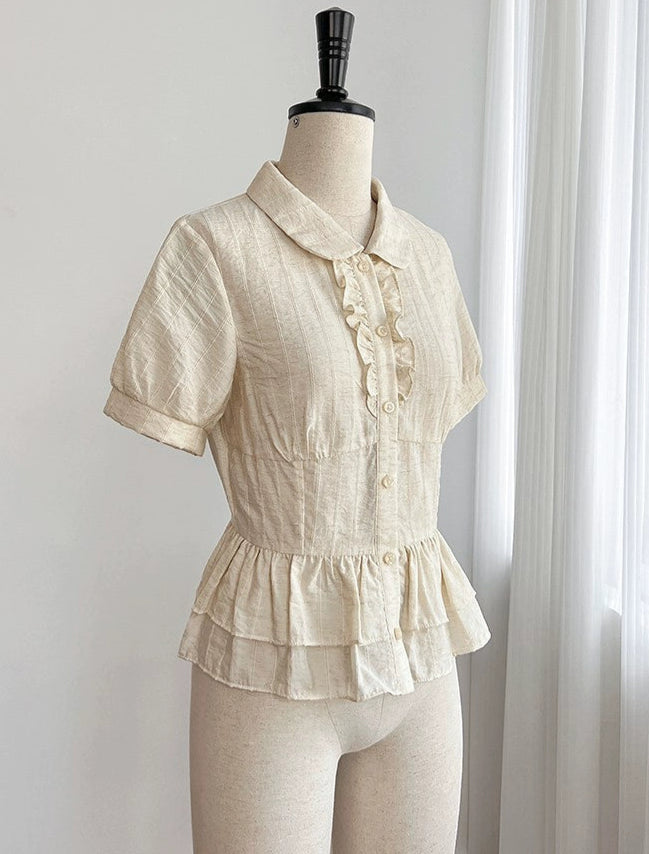 生成色が優しい雰囲気の半袖ブラウス。同シリーズのジャンパースカートとのコーデがおすすめです。