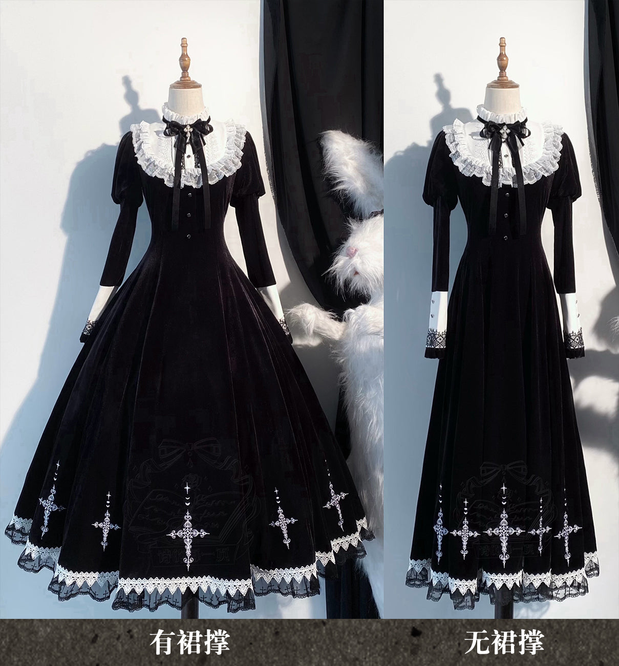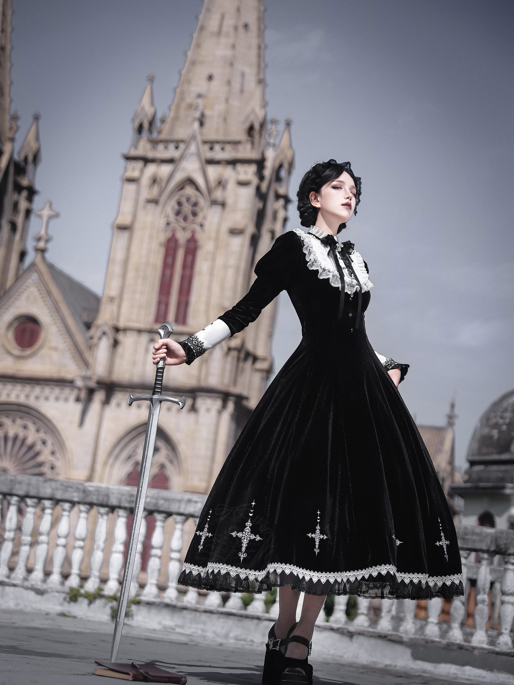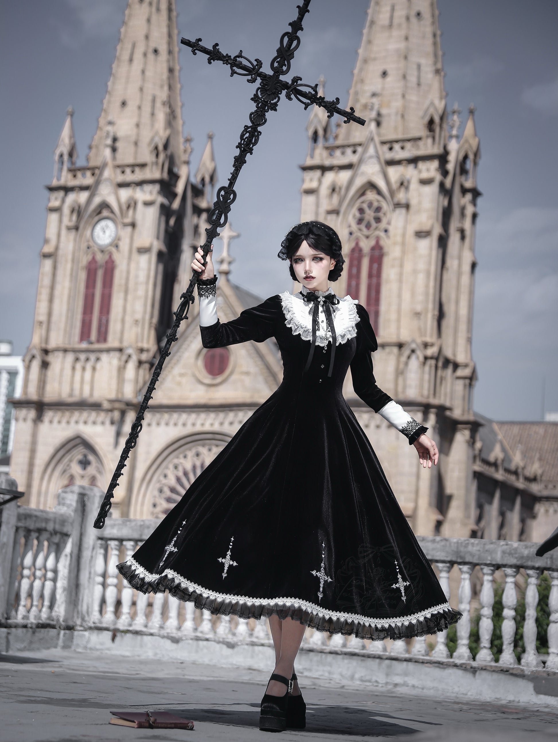 ベルベット素材にレースや十字のモチーフがエレガントゴシックなワンピース。
