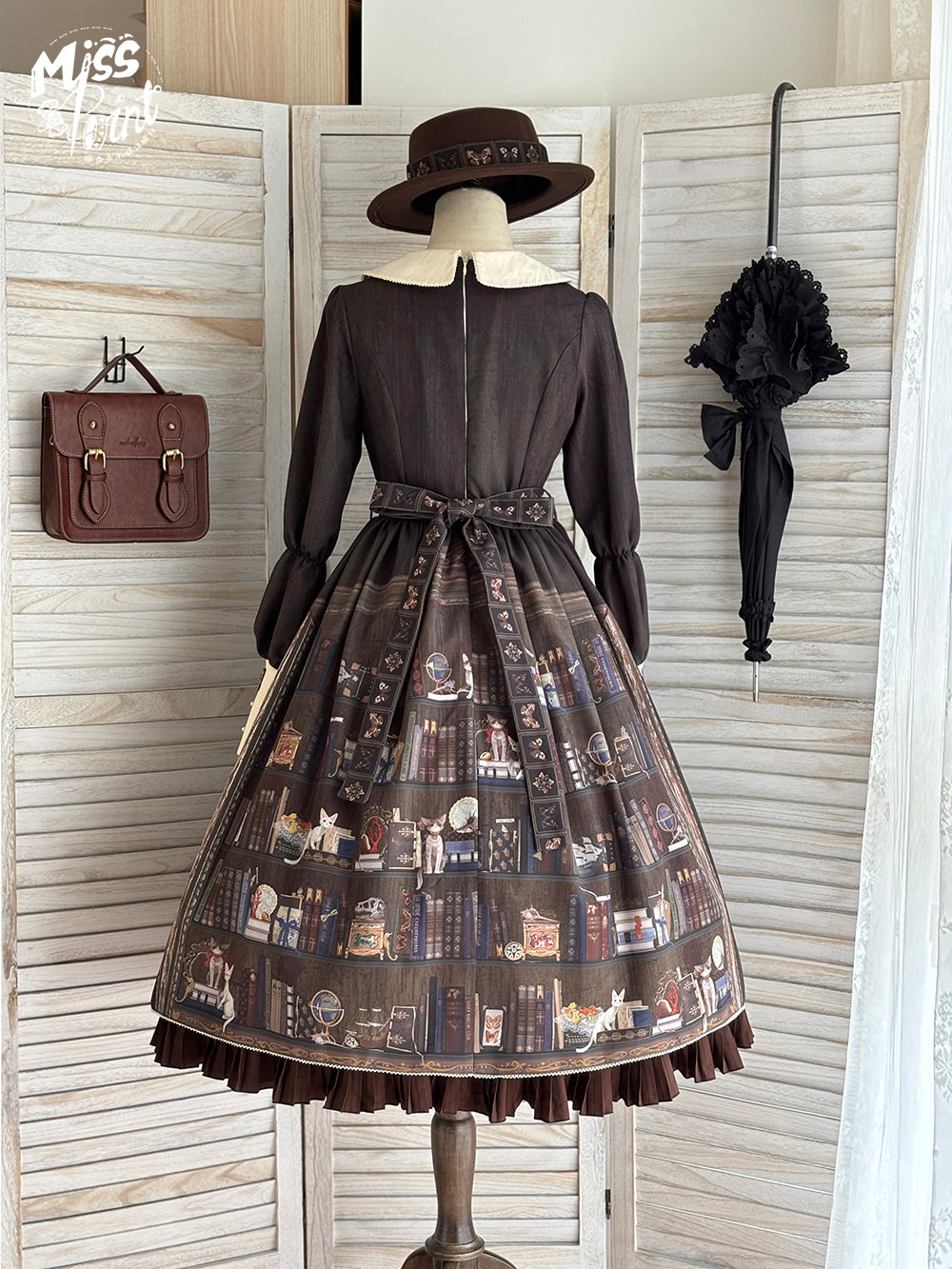 本棚と猫のプリントがシックなワンピース。リボンタイ、布ベルト付。