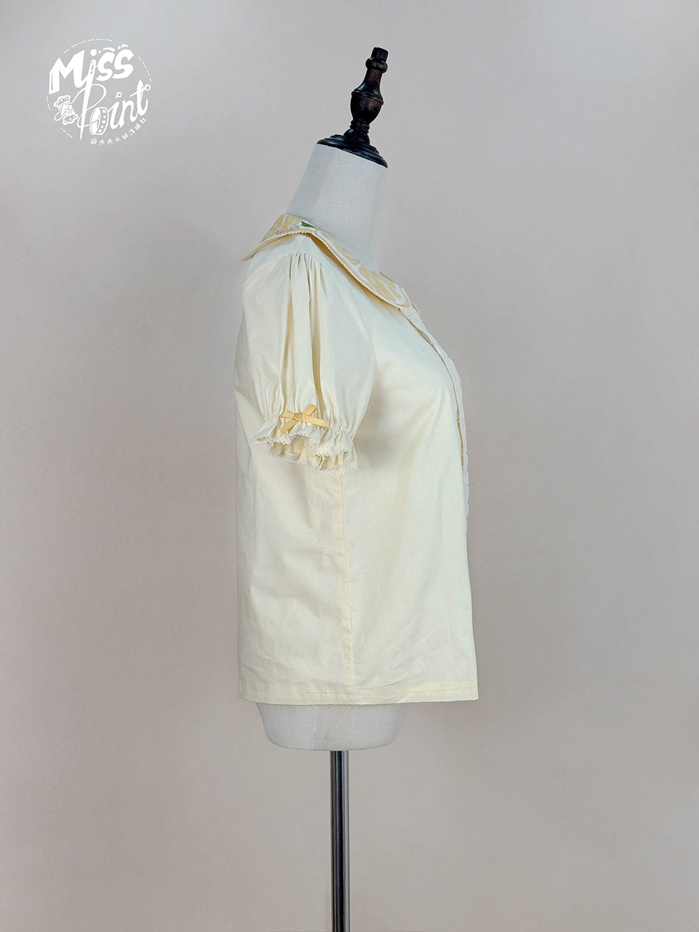 レモンがプリントされた襟があしらわれた半袖ブラウス。