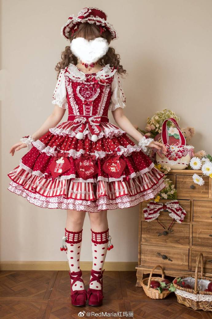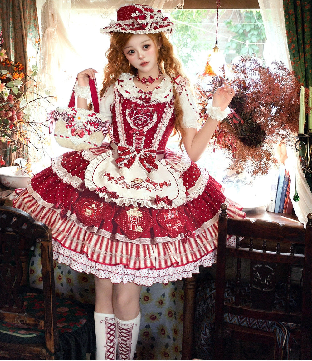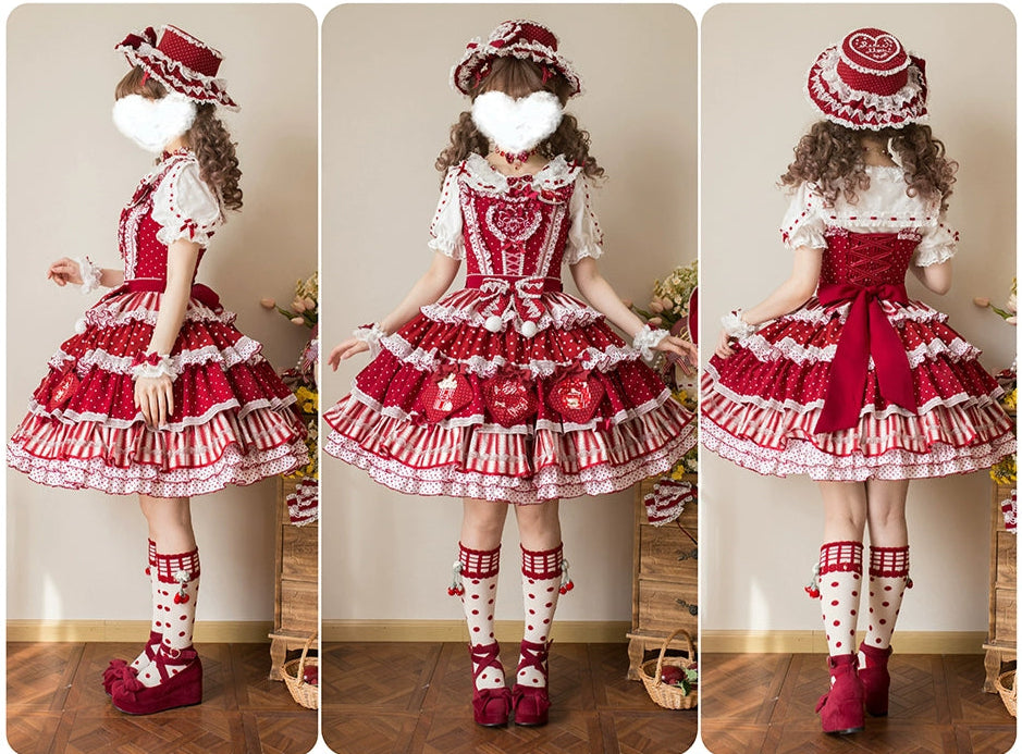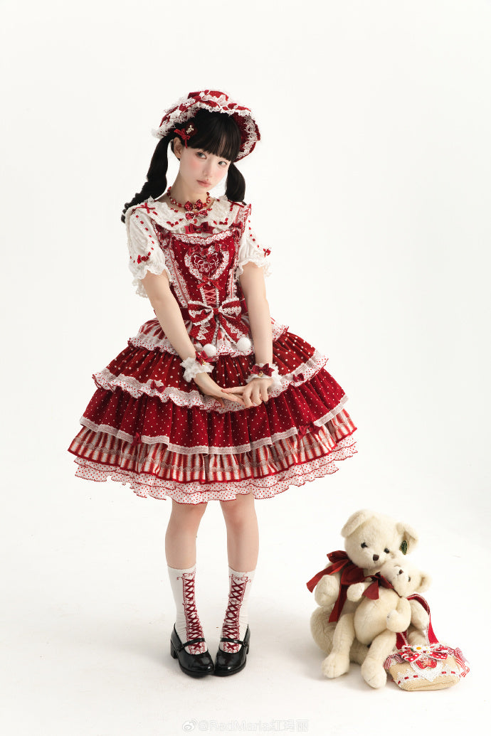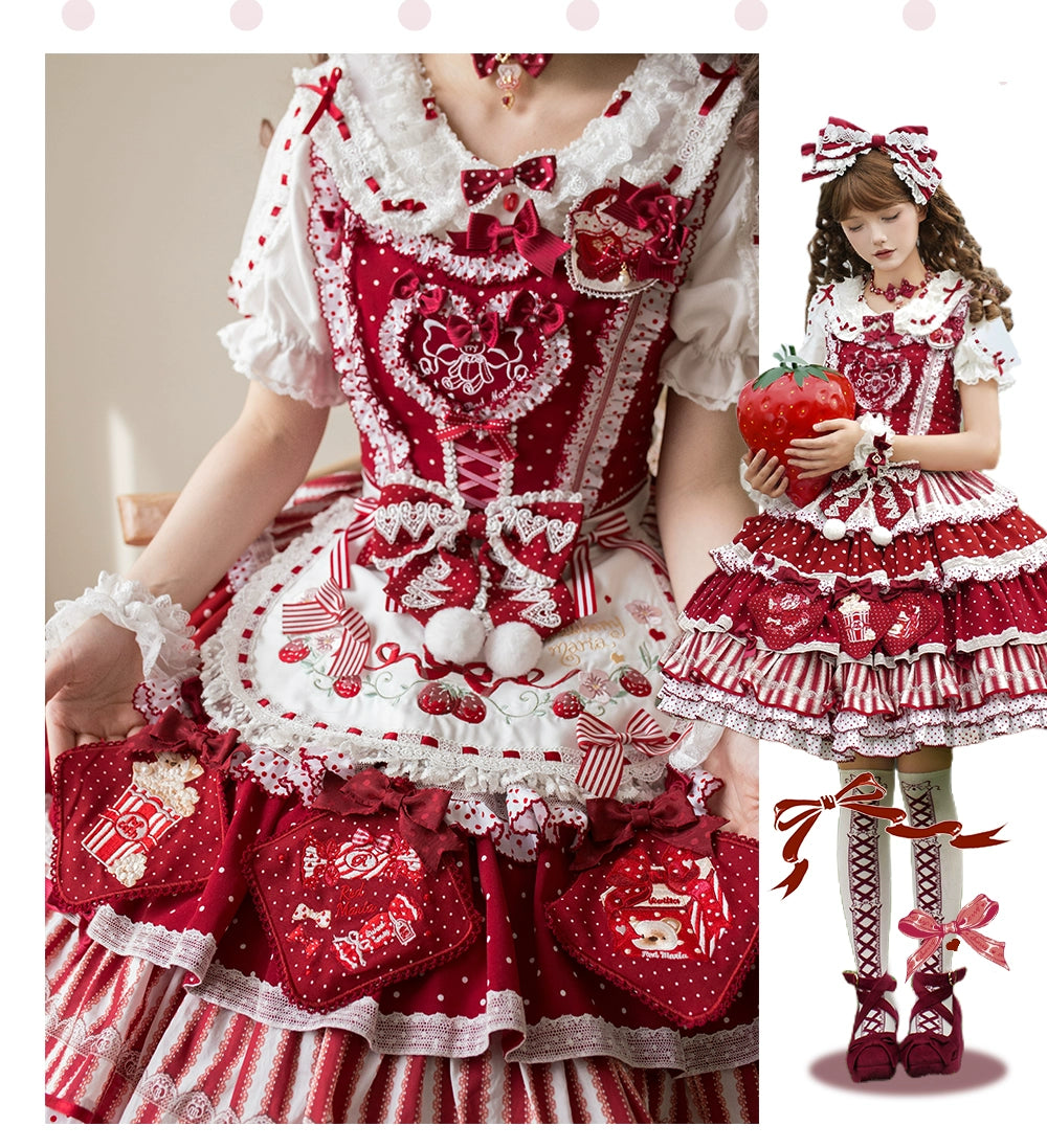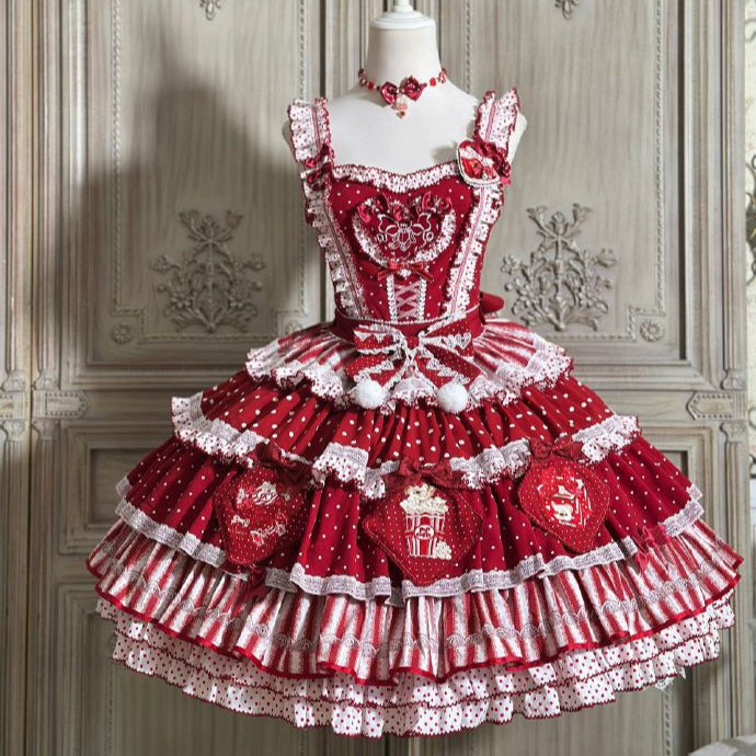 ストライプ×ドットが可愛いレッドにレースやリボン、フリルたっぷりの甘いジャンパースカート。