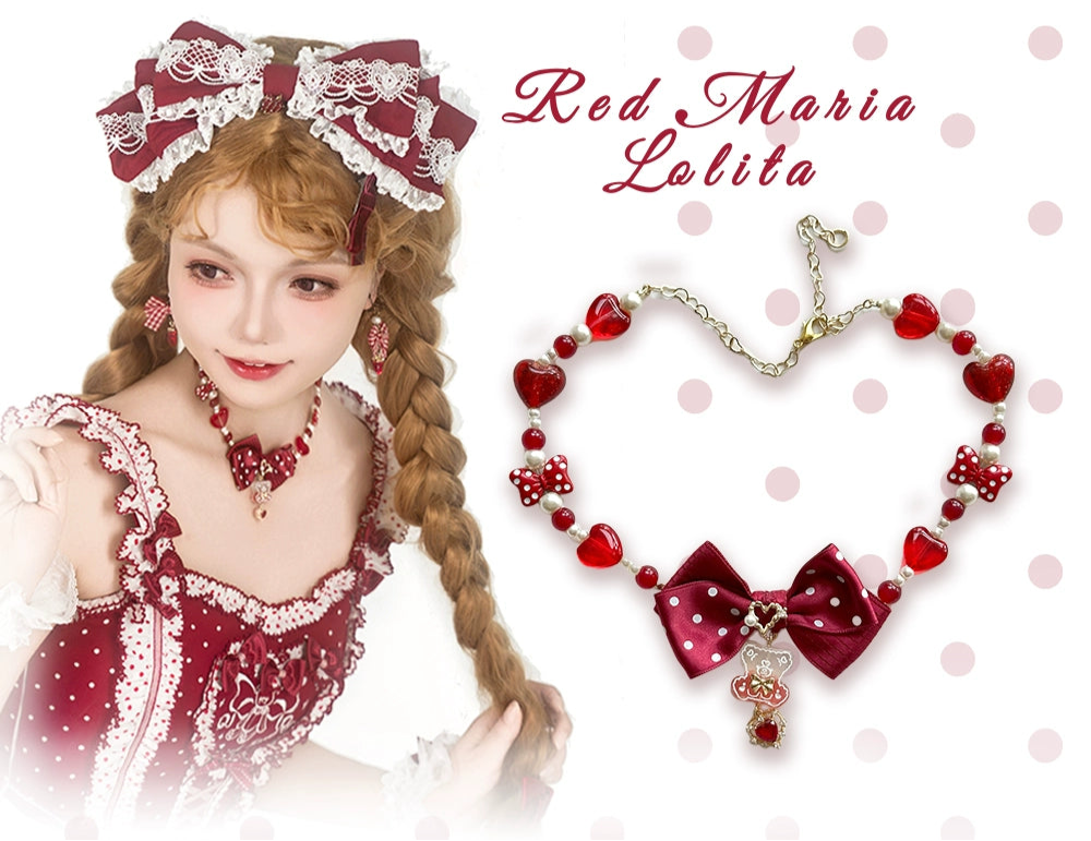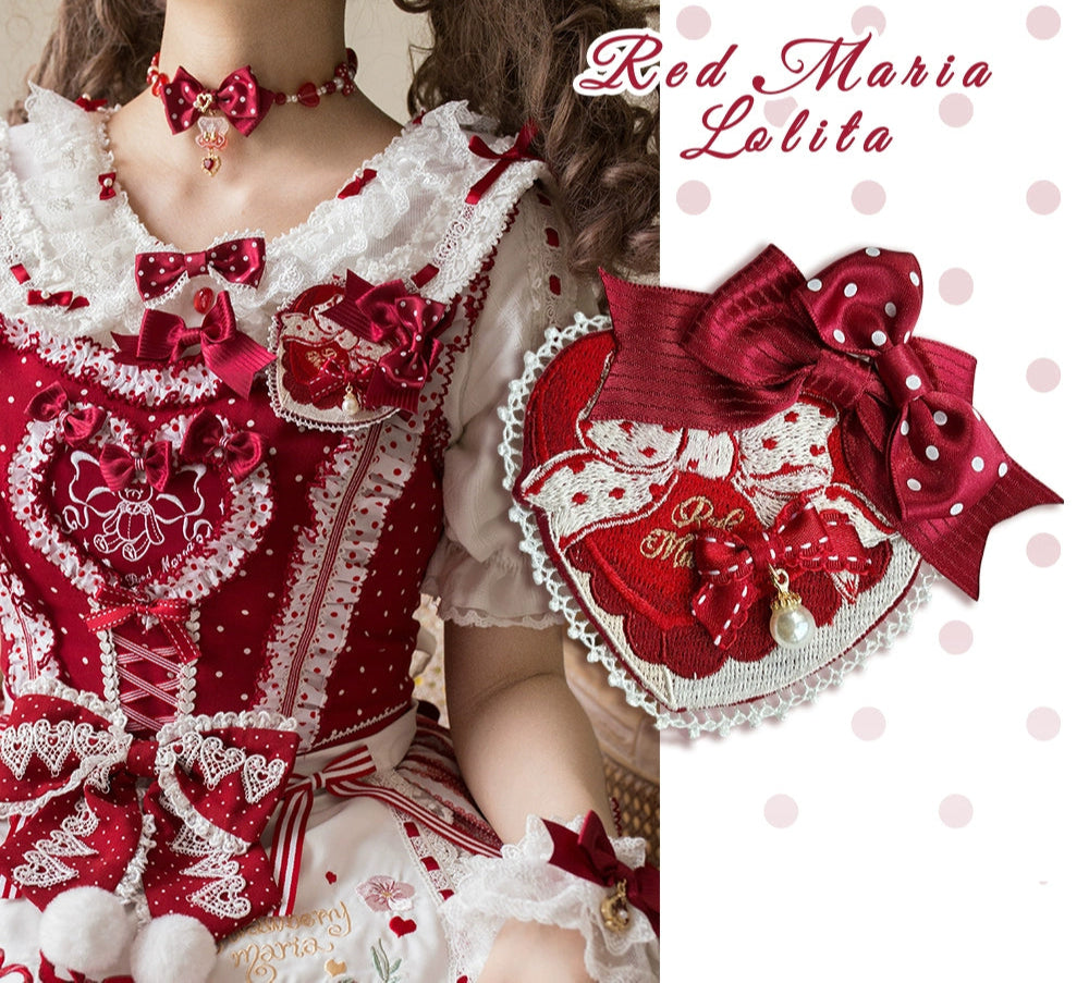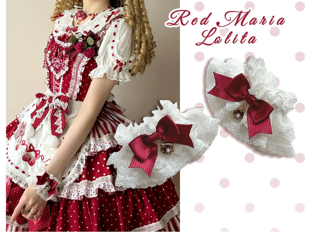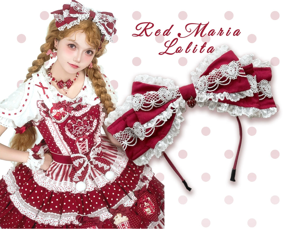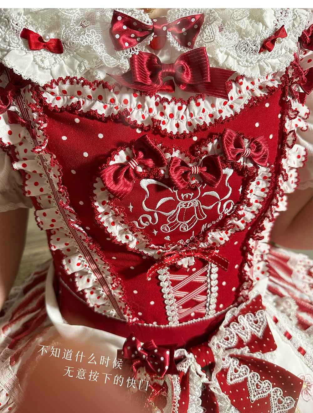 ストライプ×ドットが可愛いレッドにレースやリボン、フリルたっぷりの甘いジャンパースカート。