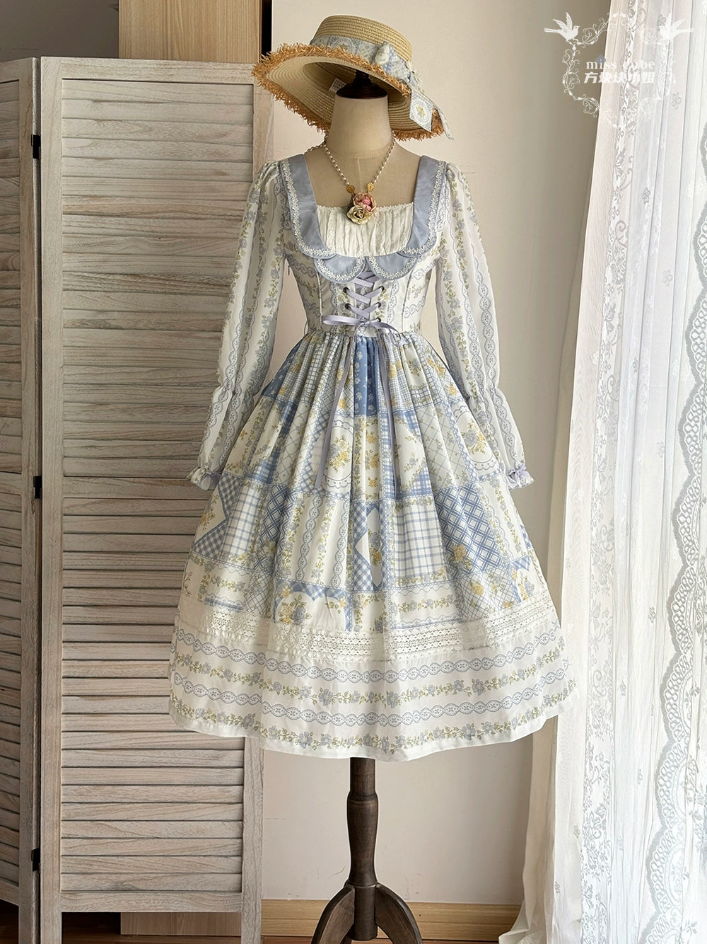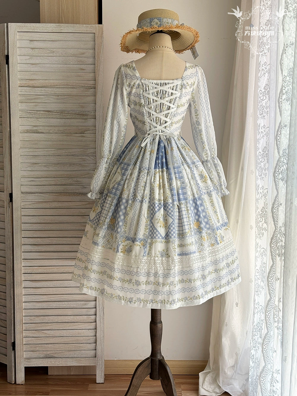 パッチワークプリントに胸元の編み上げデザインが可愛い長袖ワンピース。
