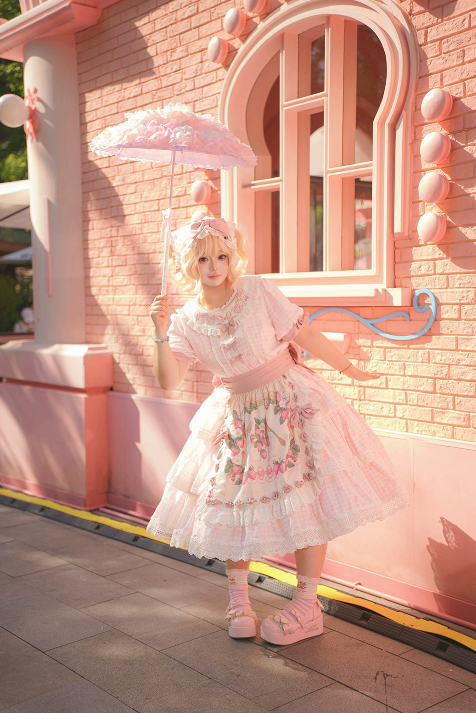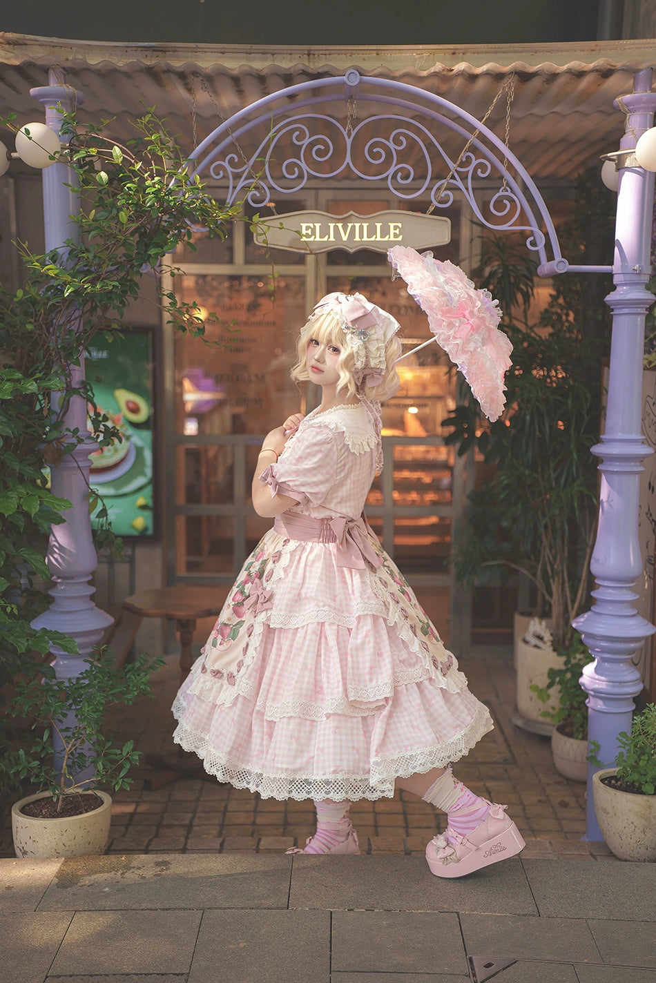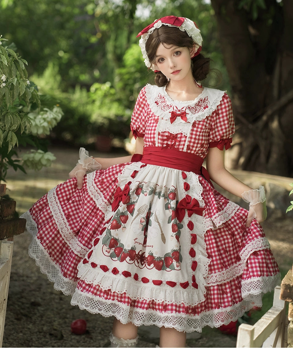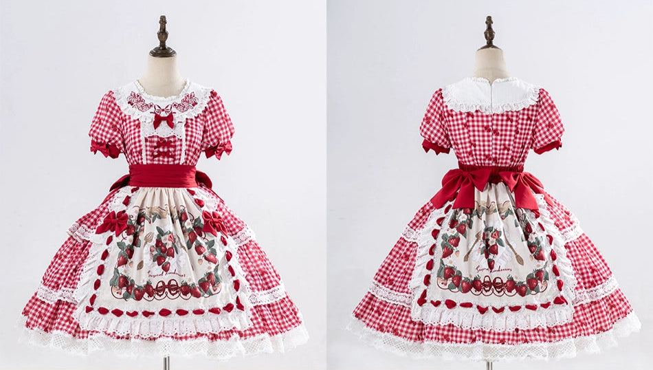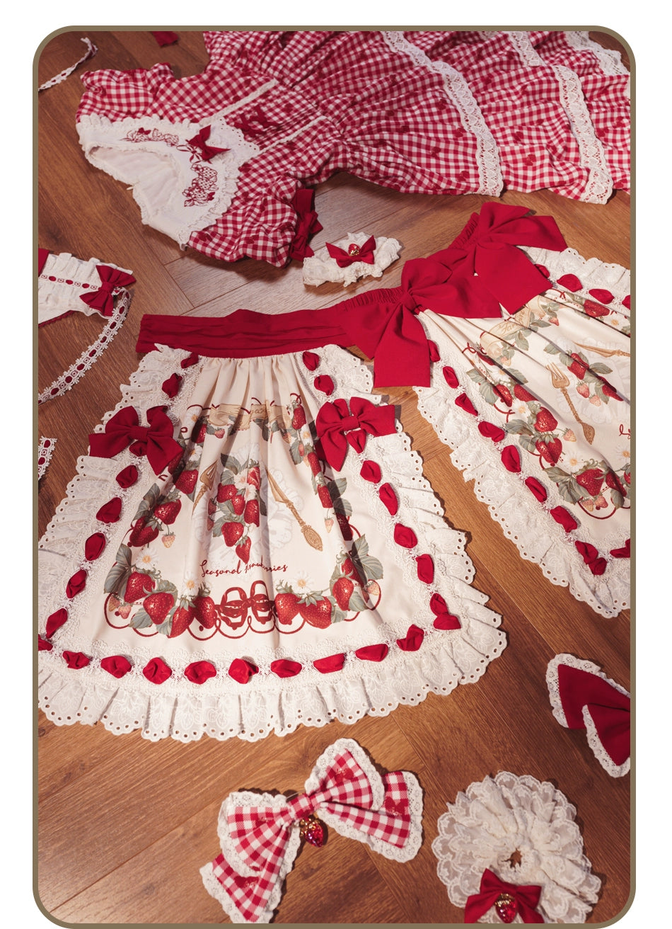 【受注予約8/18まで】Strawberry Sunshine Picnic カントリー風ワンピースとエプロン・ミドル丈