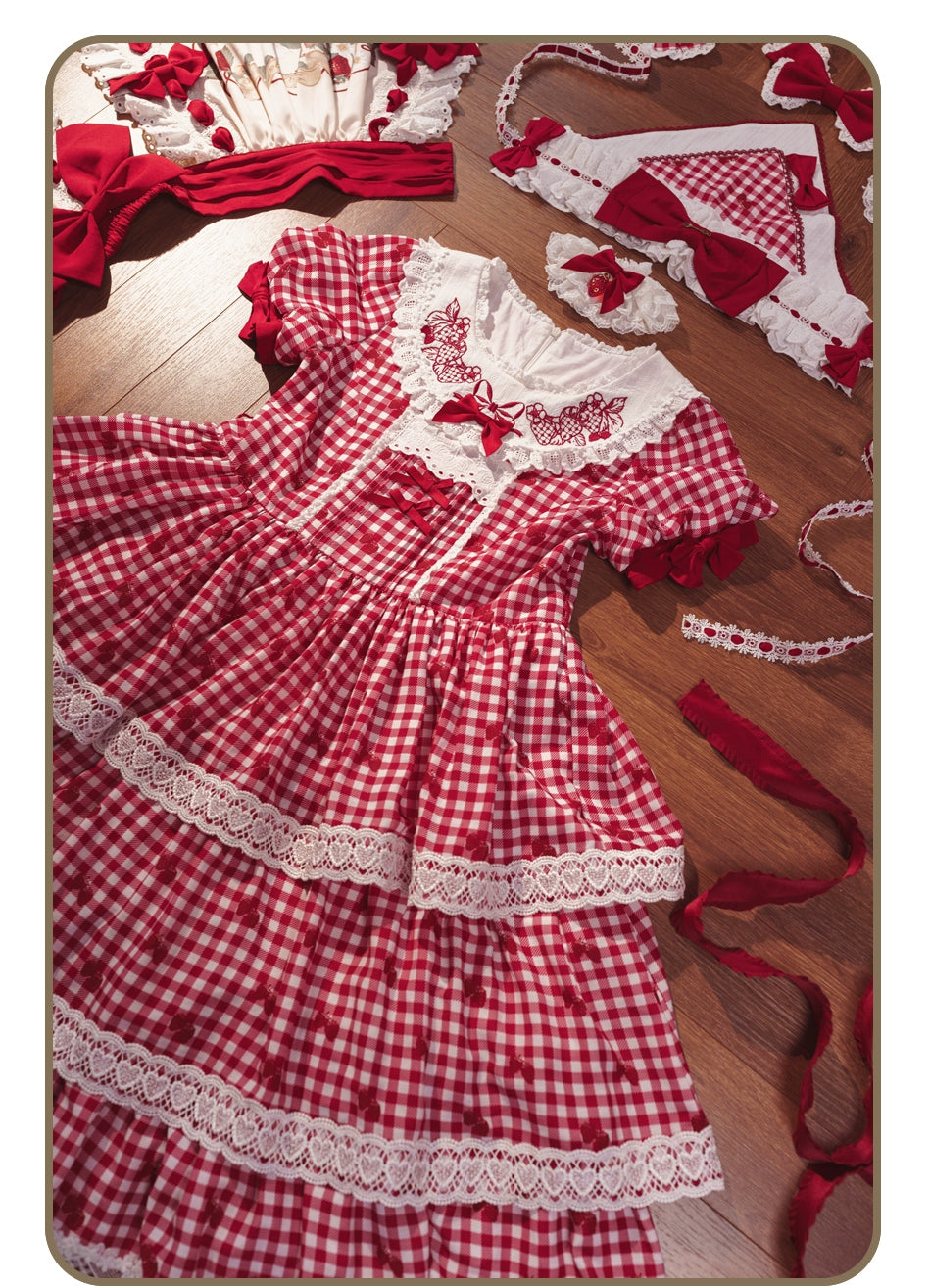 赤のギンガムチェックがかわいいワンピースとイチゴプリントのエプロンのセット。