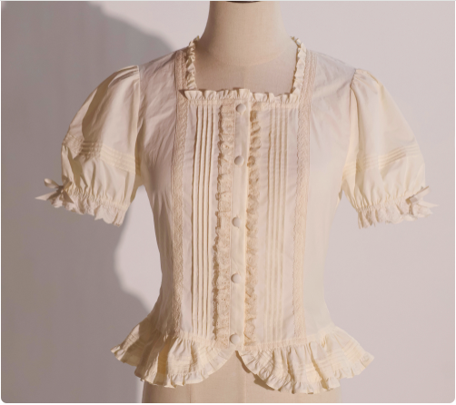生成色がナチュラルガーリーなスクエアネックブラウス。別売りの付け襟を付ければ丸襟ブラウス風に、付け袖を付ければ長袖風にと、いろんな着こなしが楽しめます♡