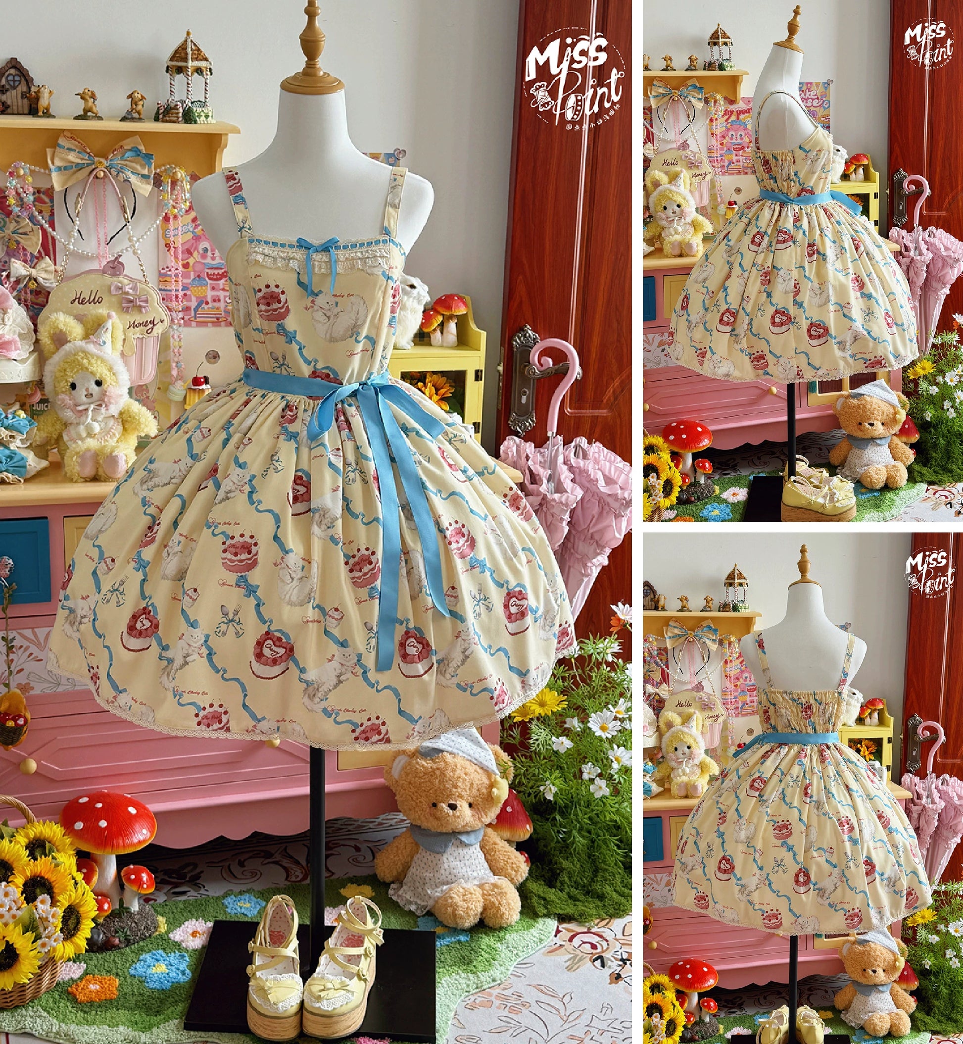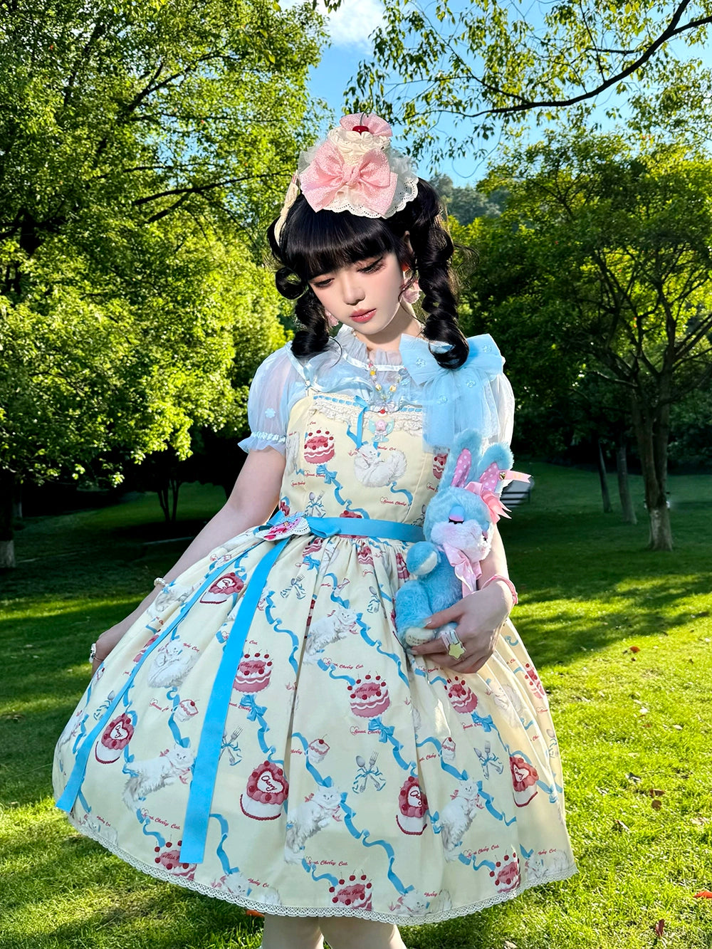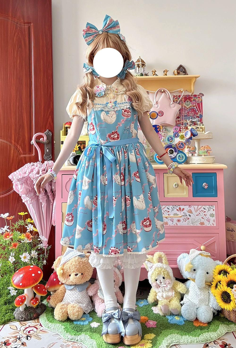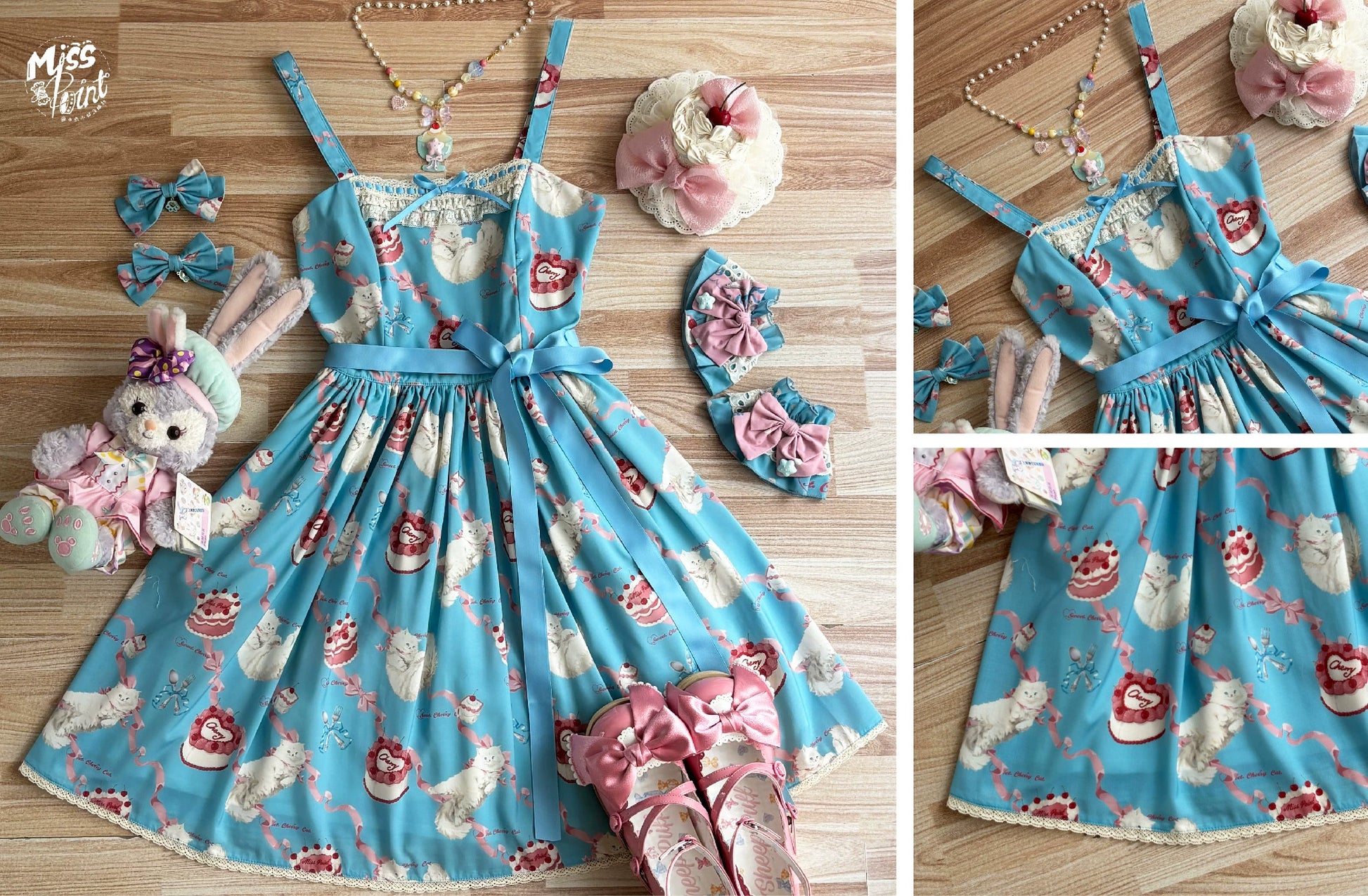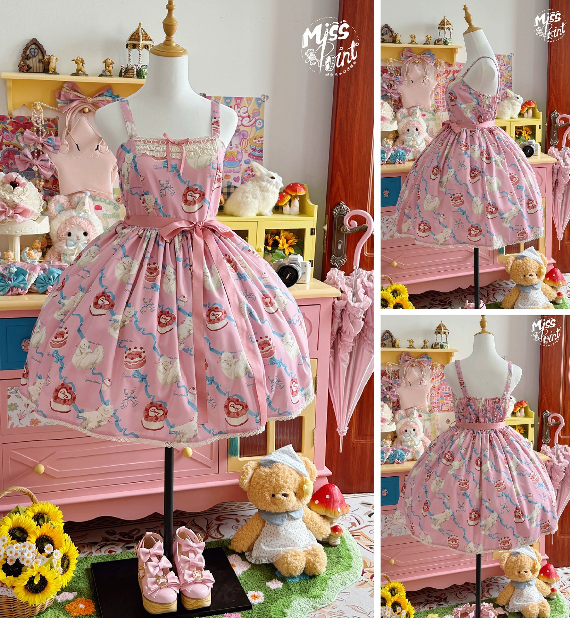 パステルカラーにスイーツと子猫のプリントが可愛いジャンパースカート。