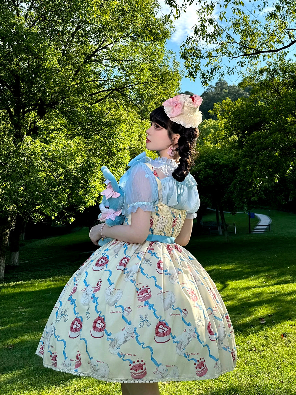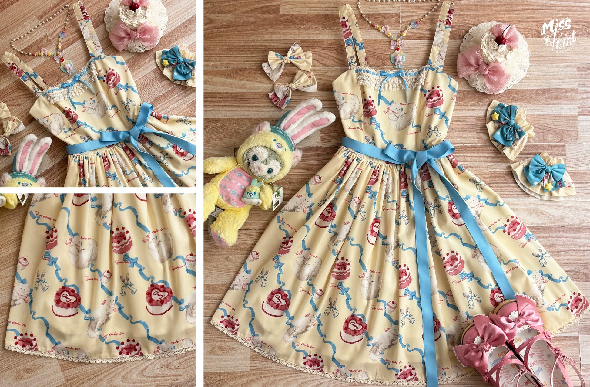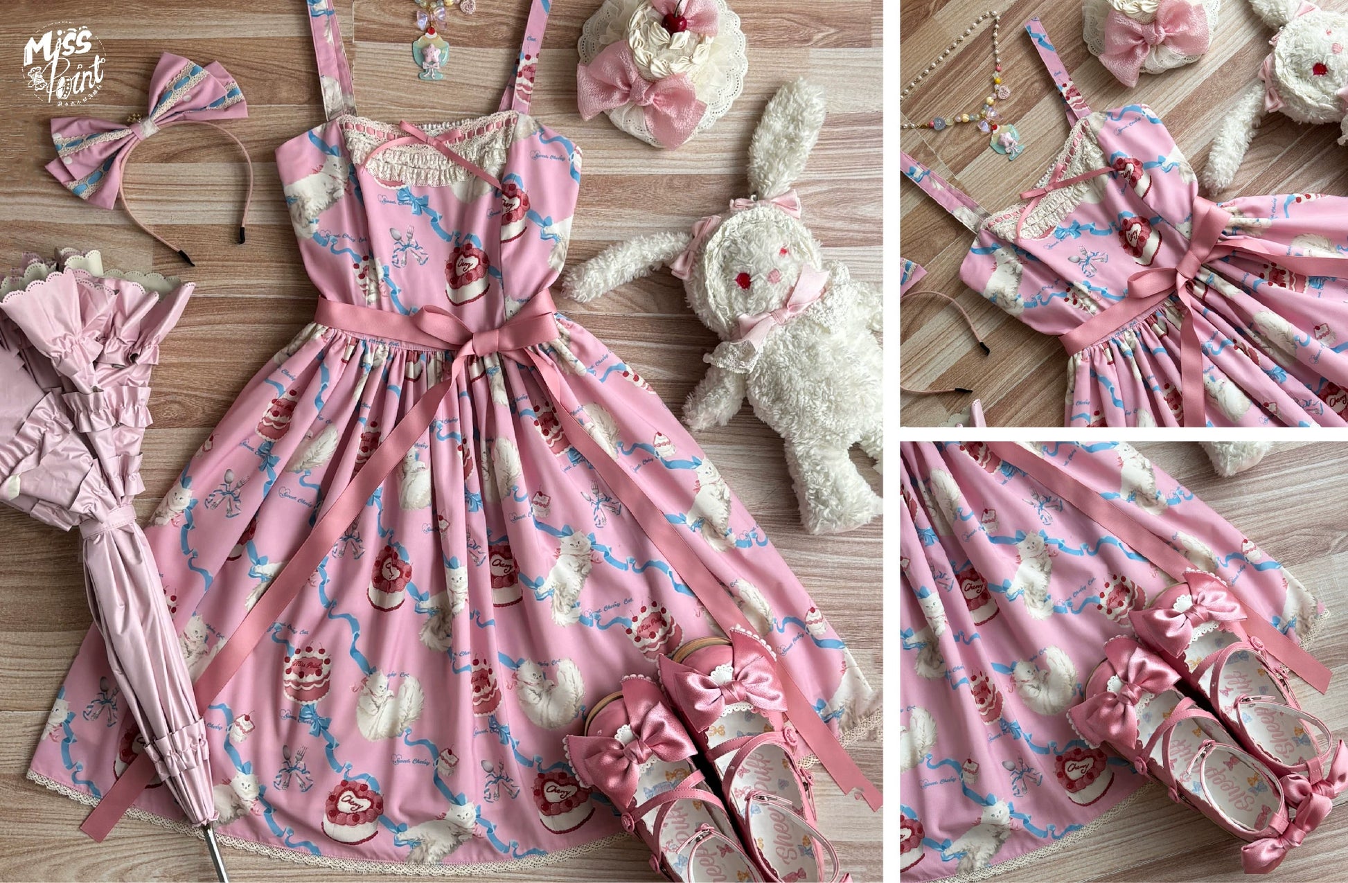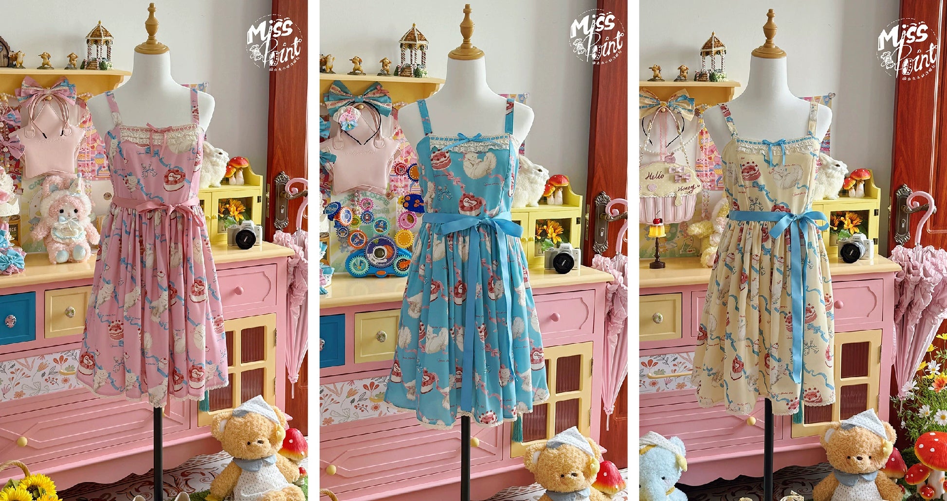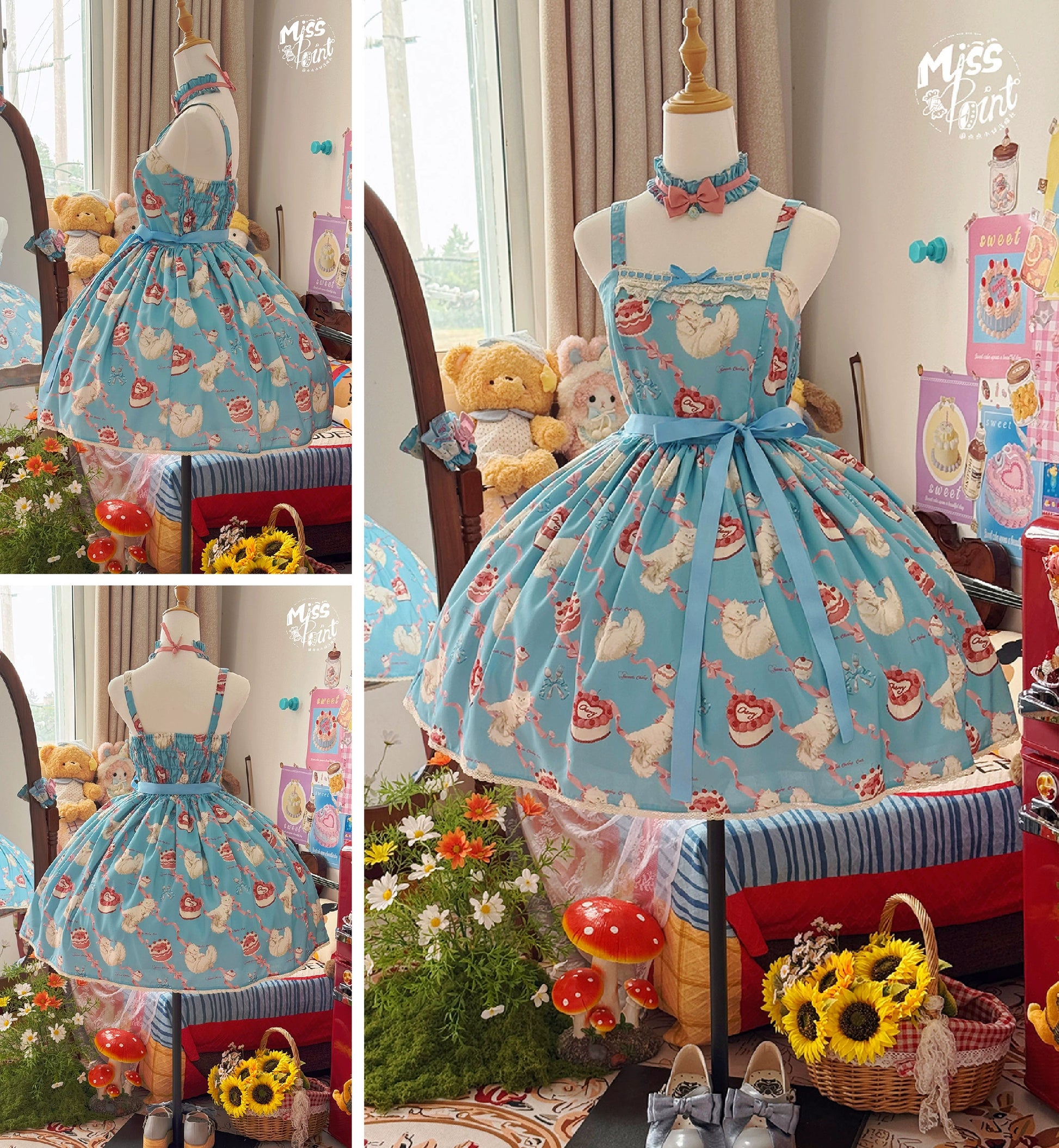 パステルカラーにスイーツと子猫のプリントが可愛いジャンパースカート。
