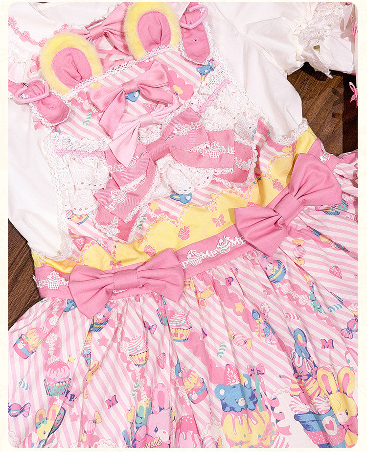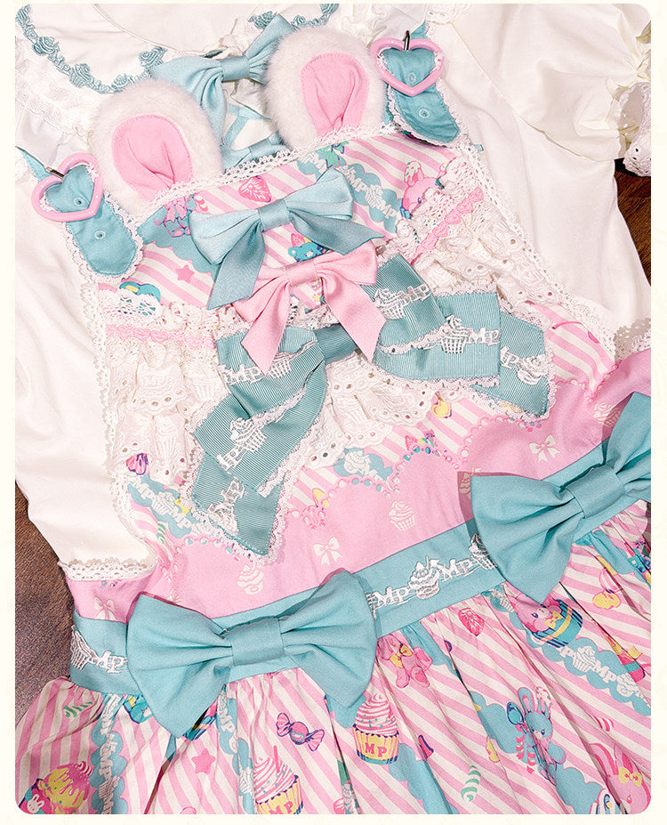 ウサギのぬいぐるみとカップケーキがプリントされたサスペンダースカート。