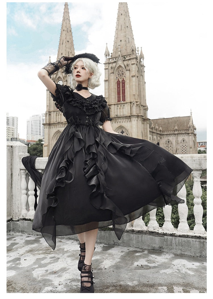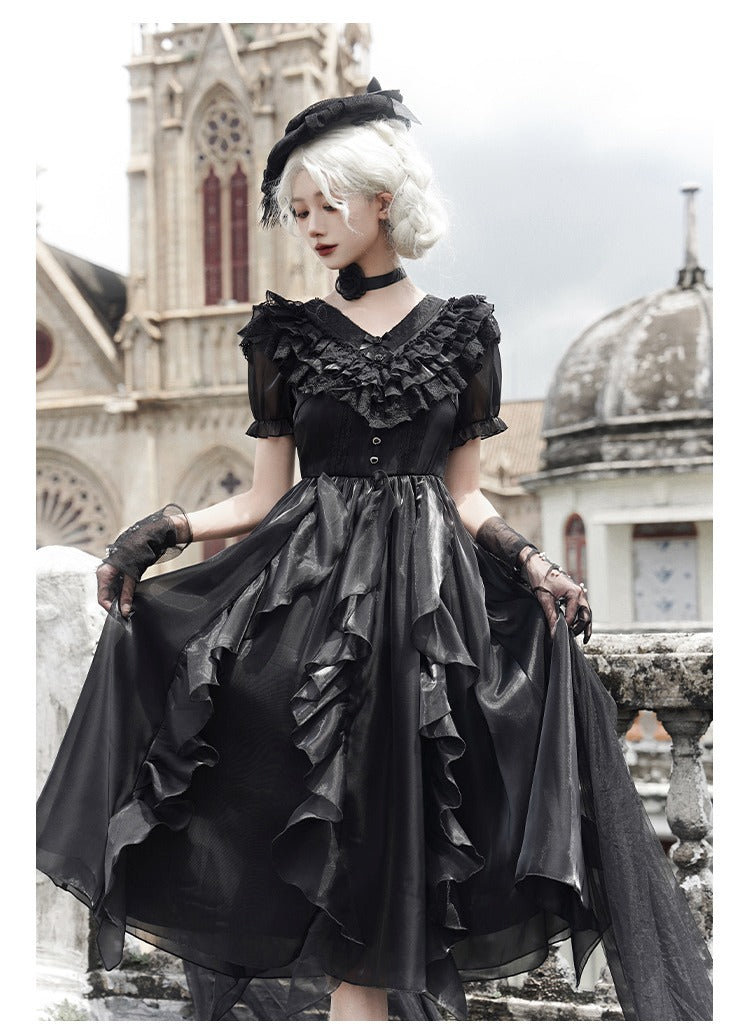 An elegant dress with irregular ruffles that sway like waves on the skirt.