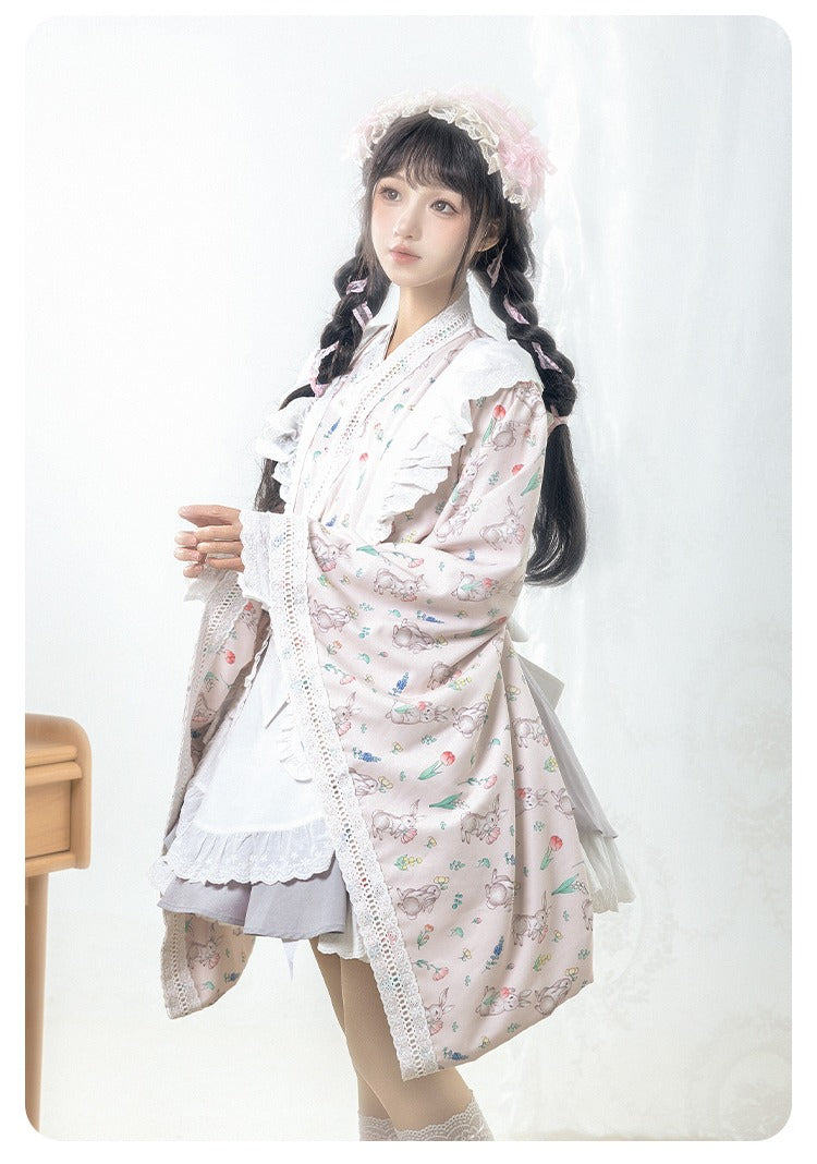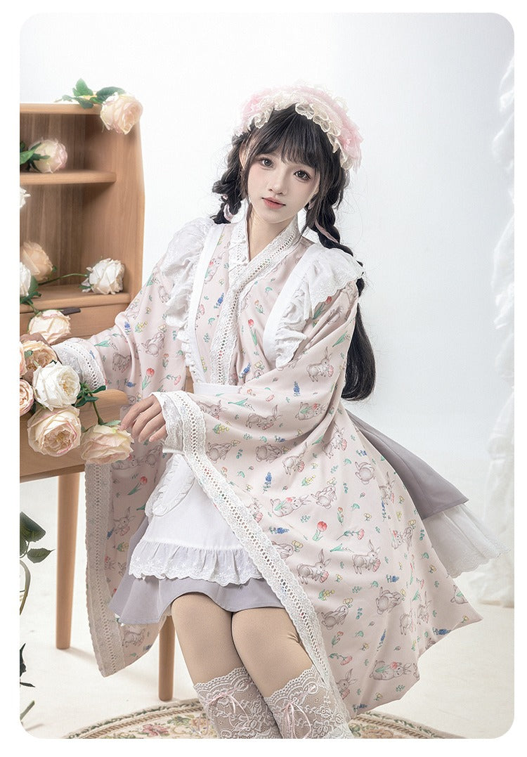 A cute Japanese-style dress with a pastel pink rabbit and tulip print. Long length available here