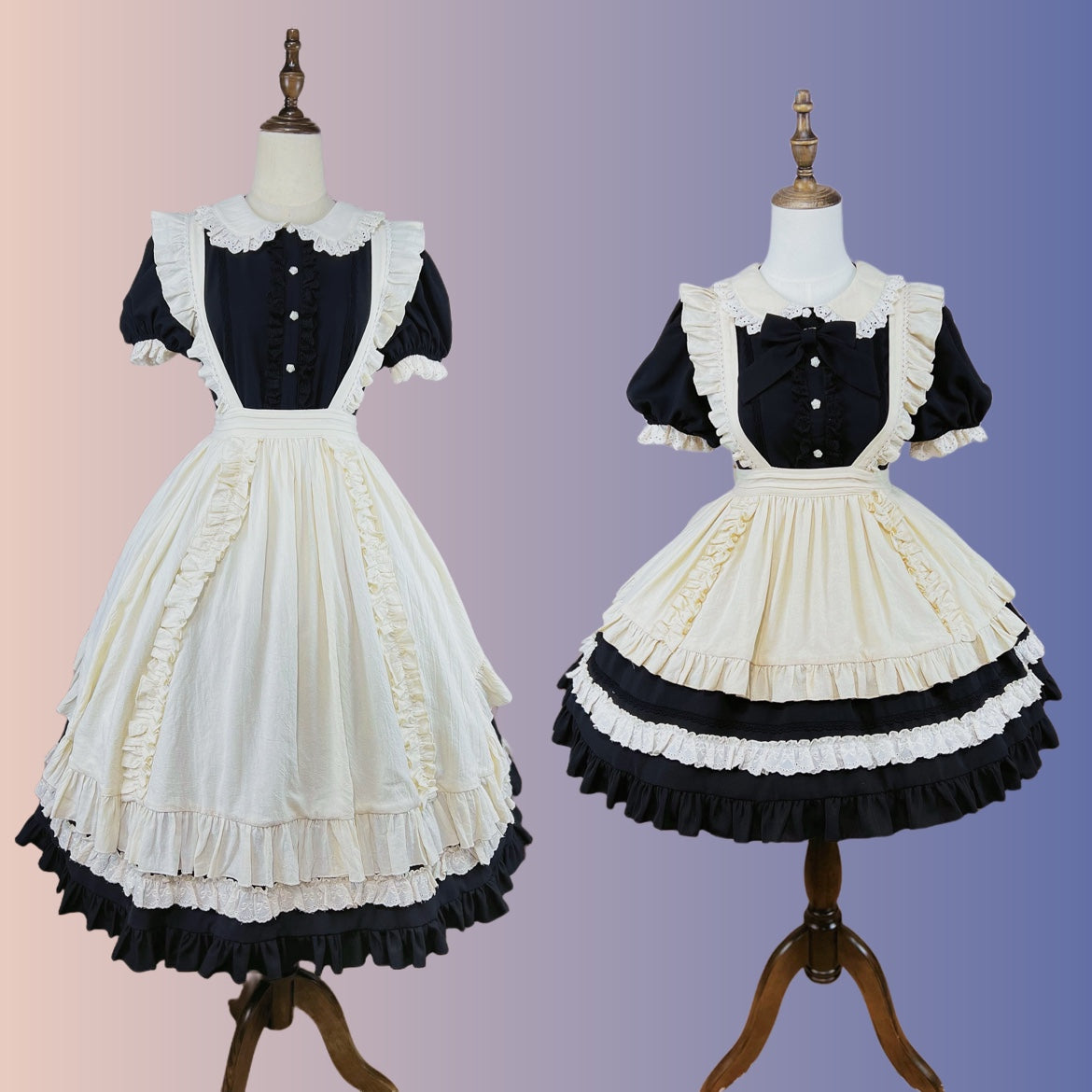 フリル襟の半袖メイドワンピース エプロン付き ショート丈