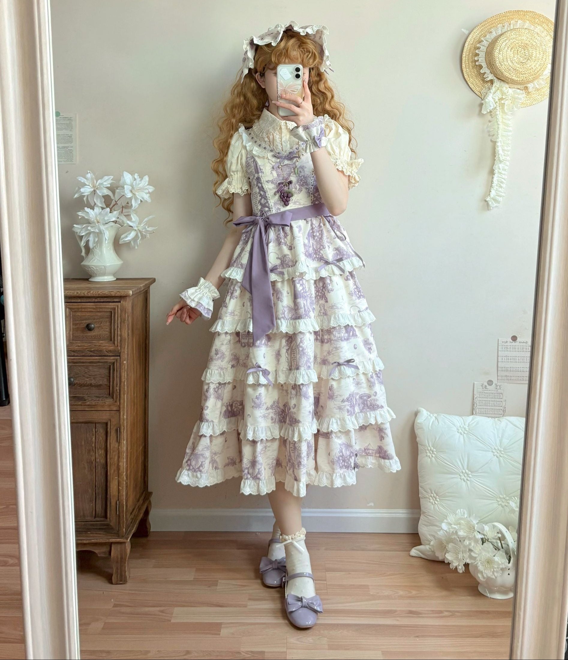 A pretty jumper skirt with a grape print, ruffles and ribbons.