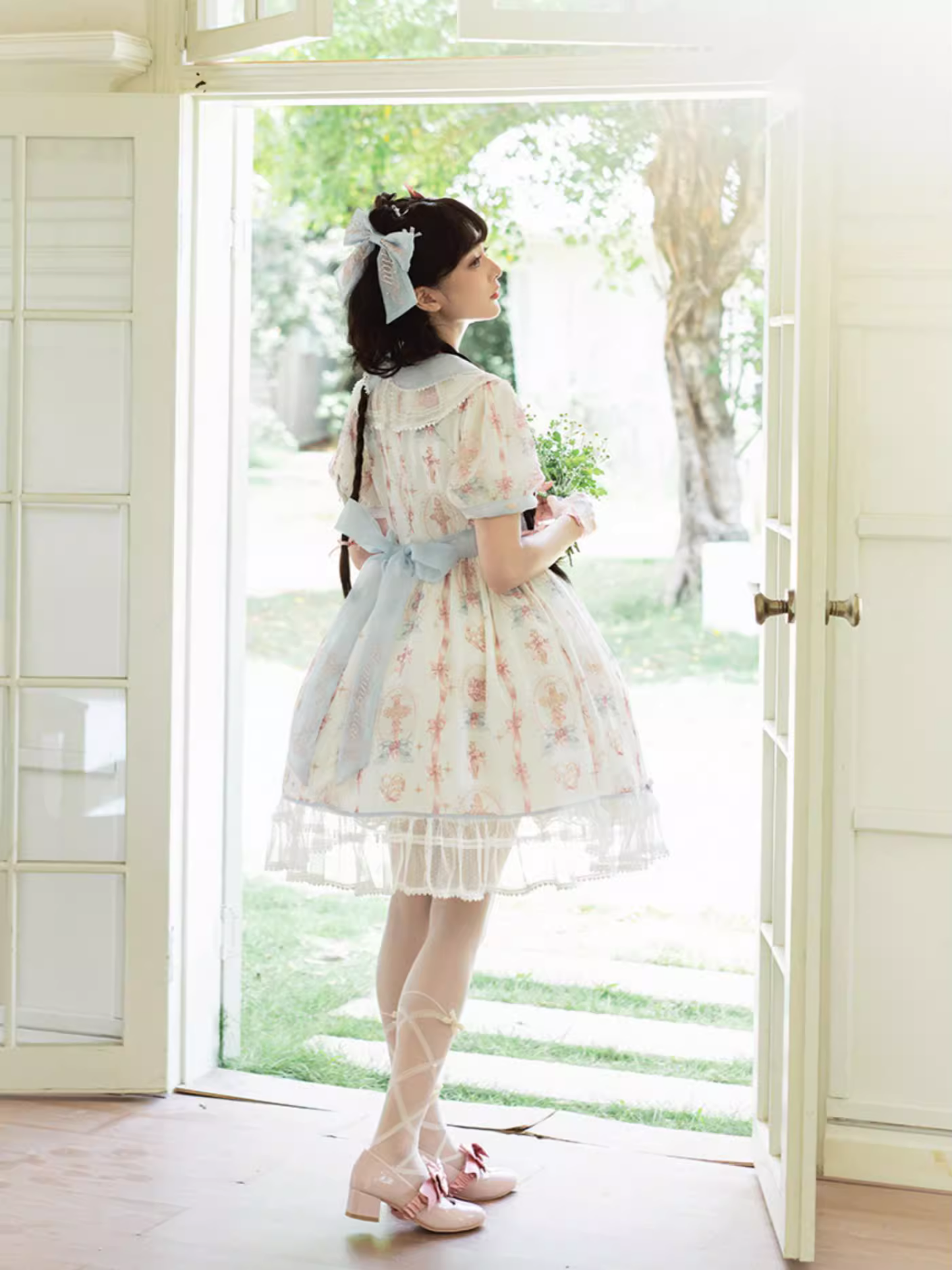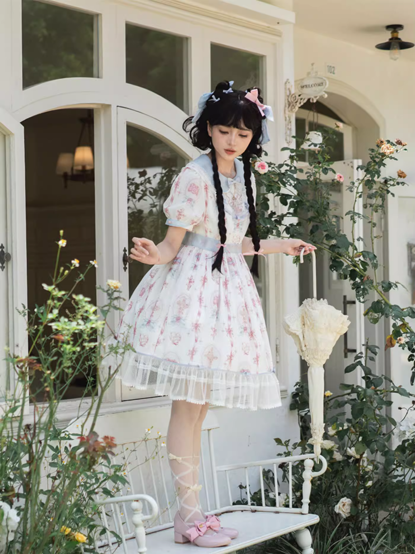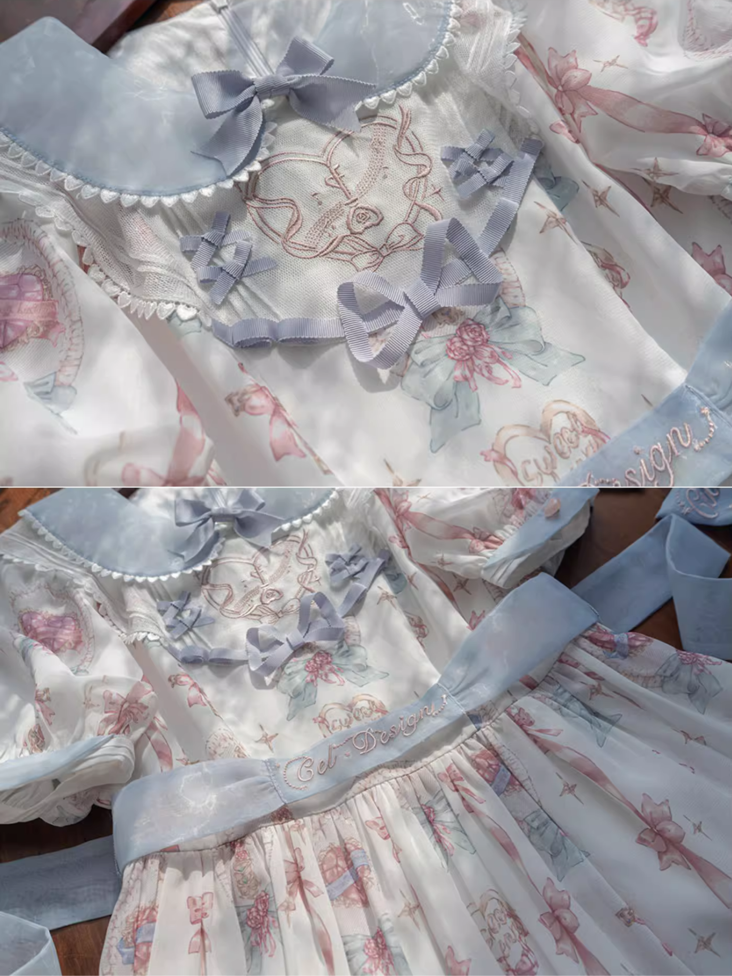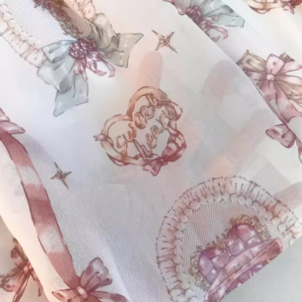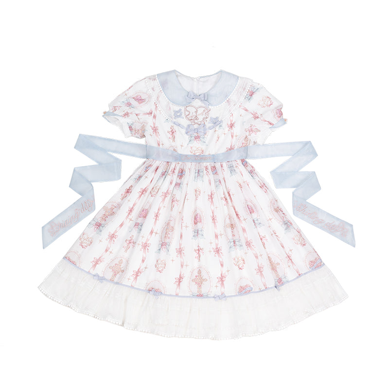 リボンやハートの宝石プリントが可愛い半袖ワンピース。