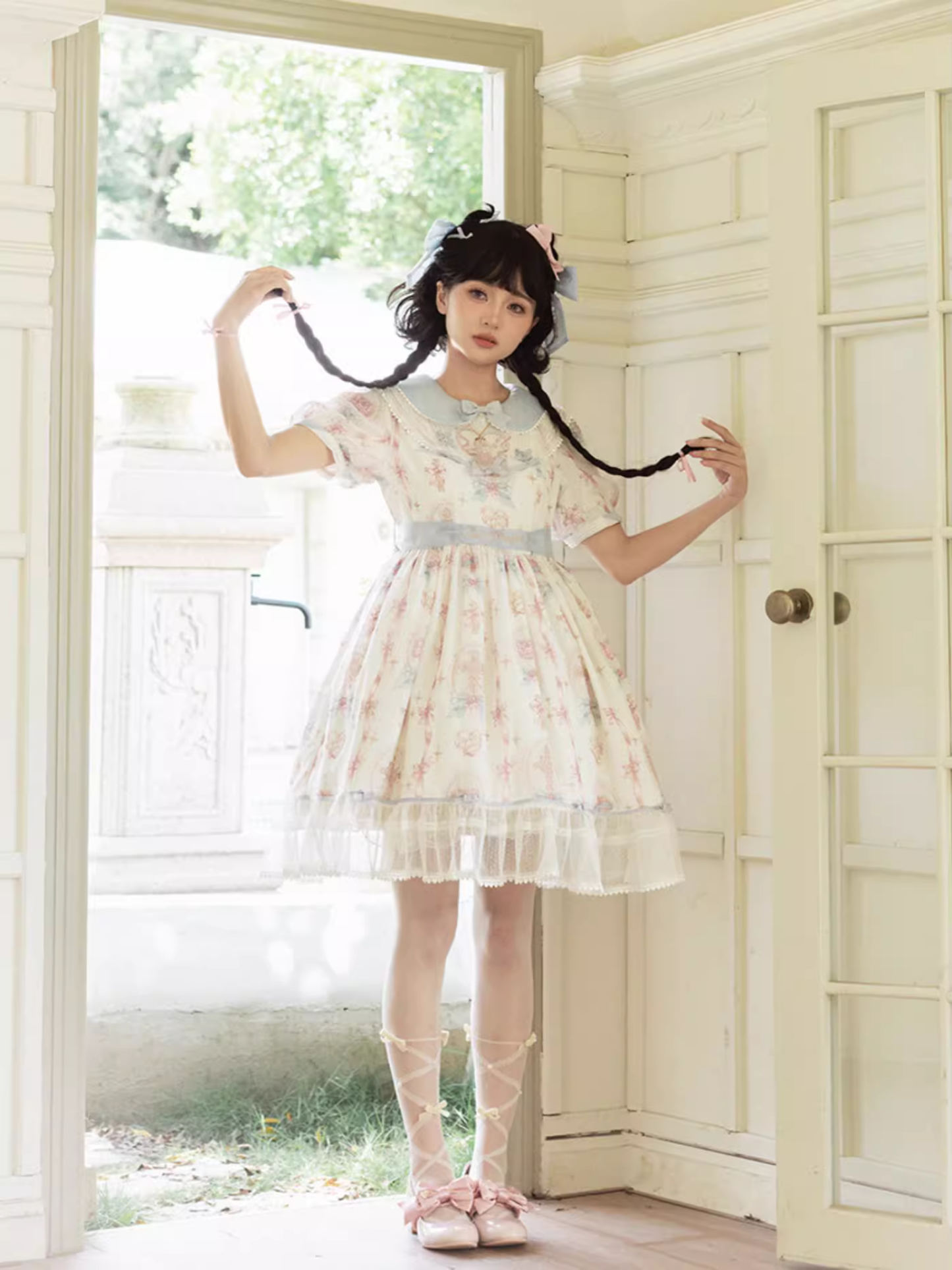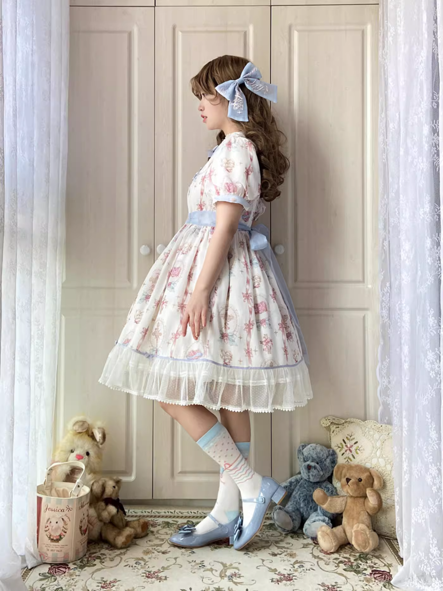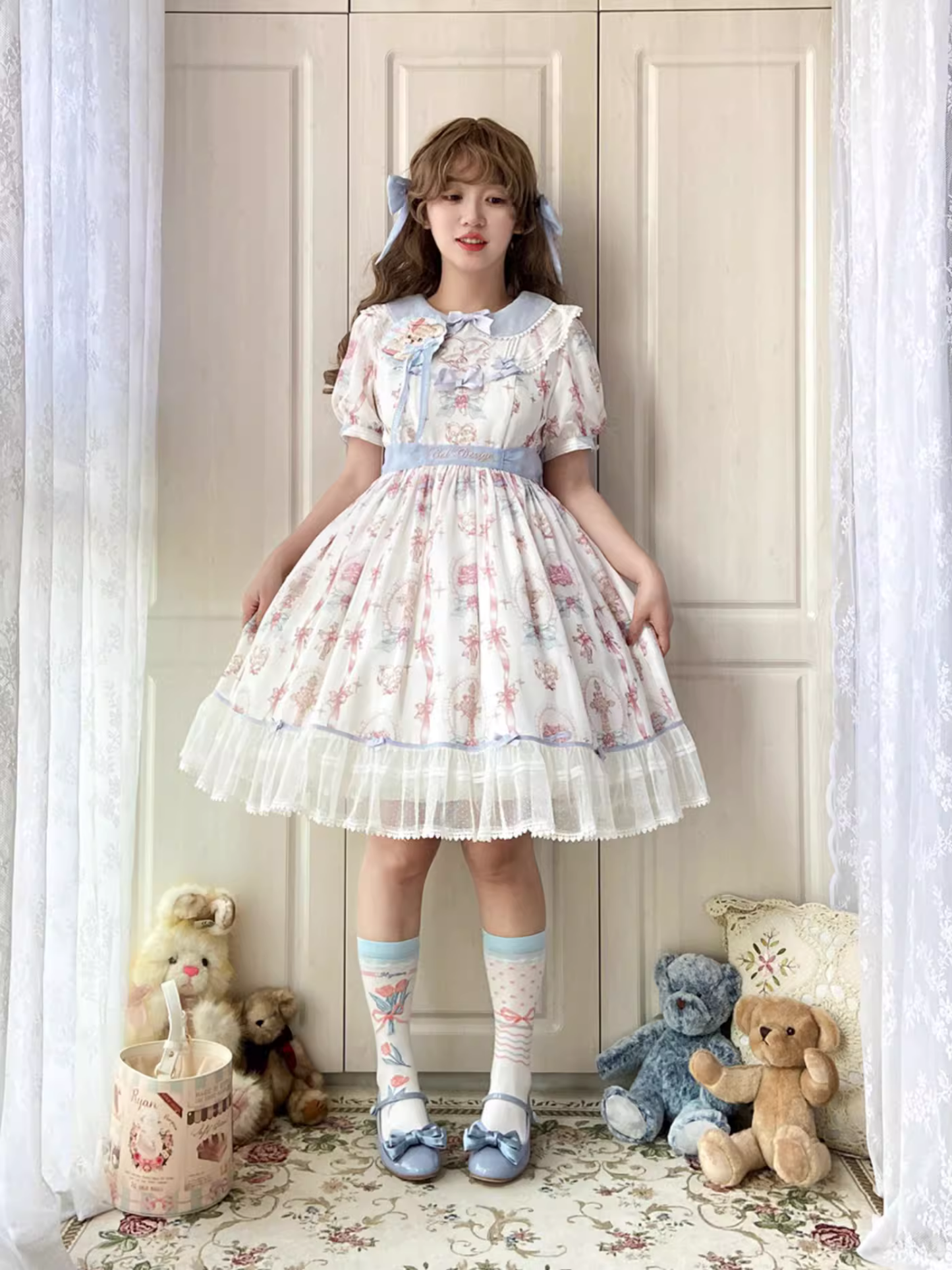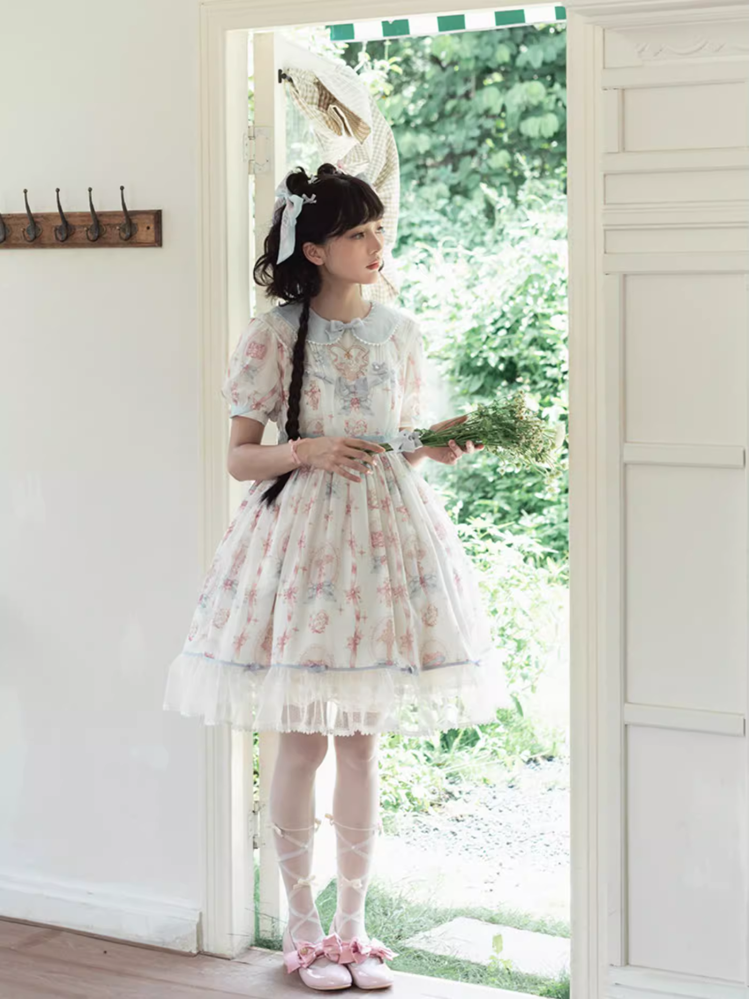 リボンやハートの宝石プリントが可愛い半袖ワンピース。