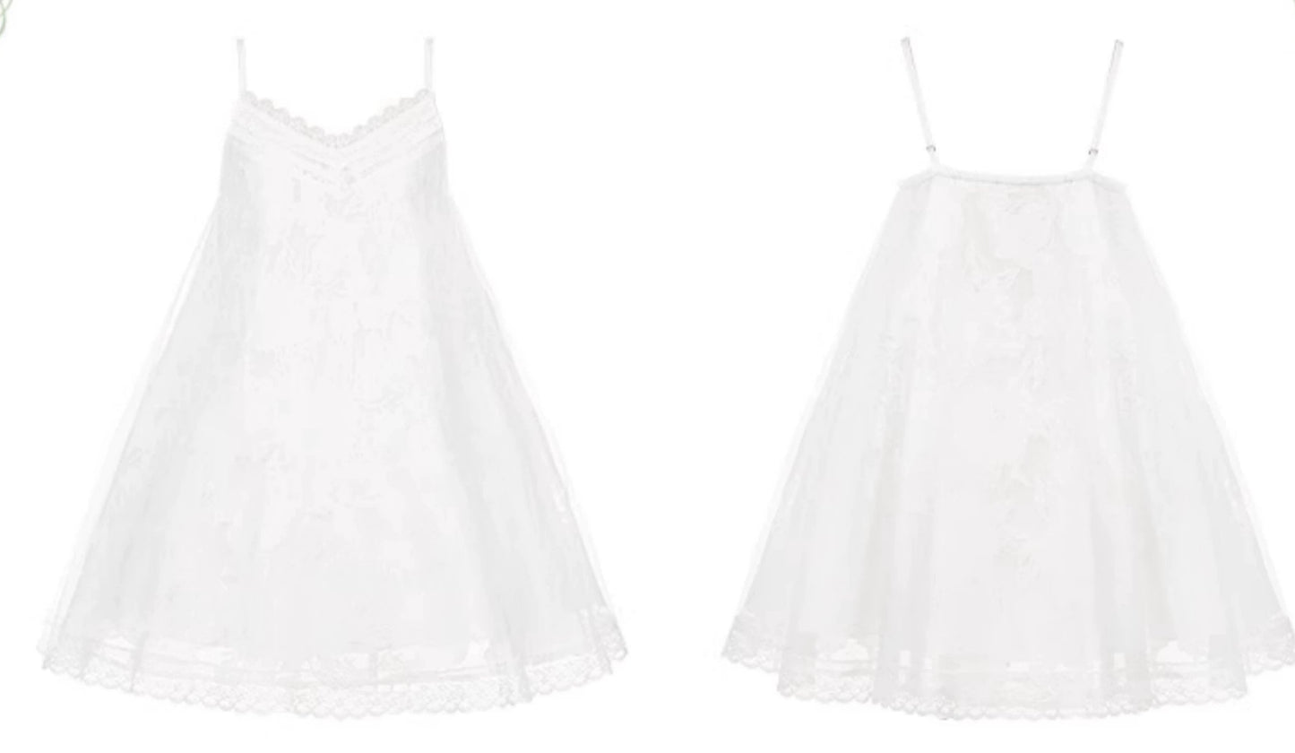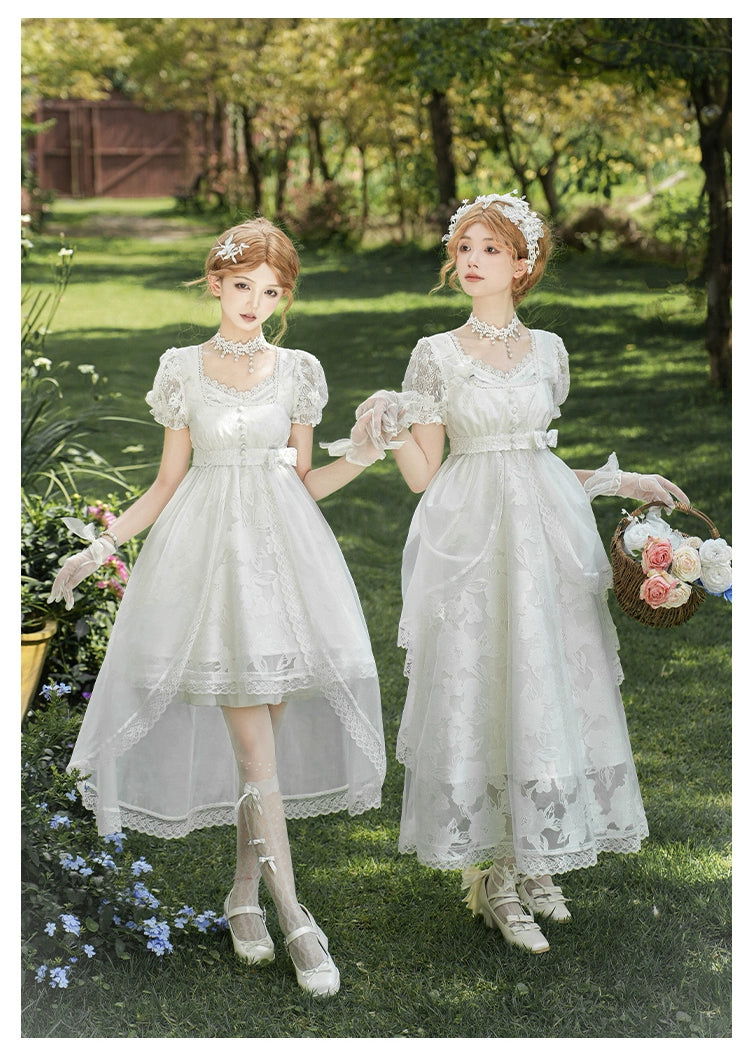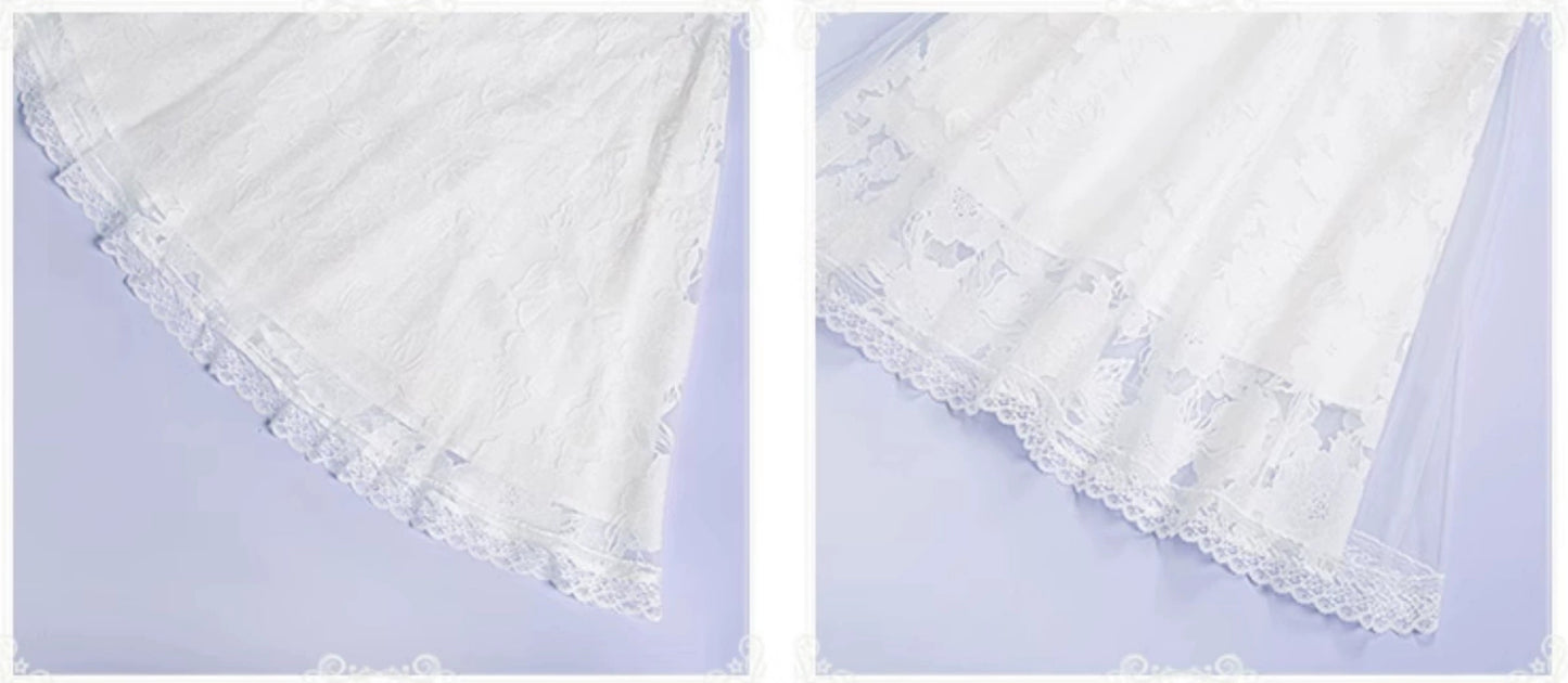 ショート丈の可憐なキャミソールジャンパースカートにレースの半袖トップス、ヴェールとアクセサリーが付属したセット。
