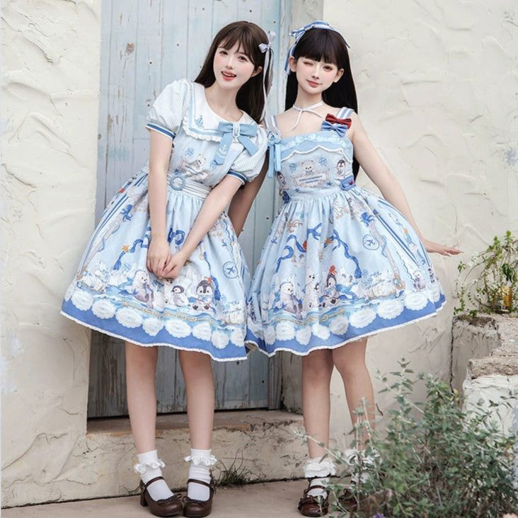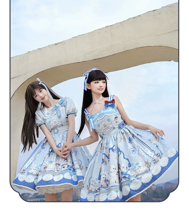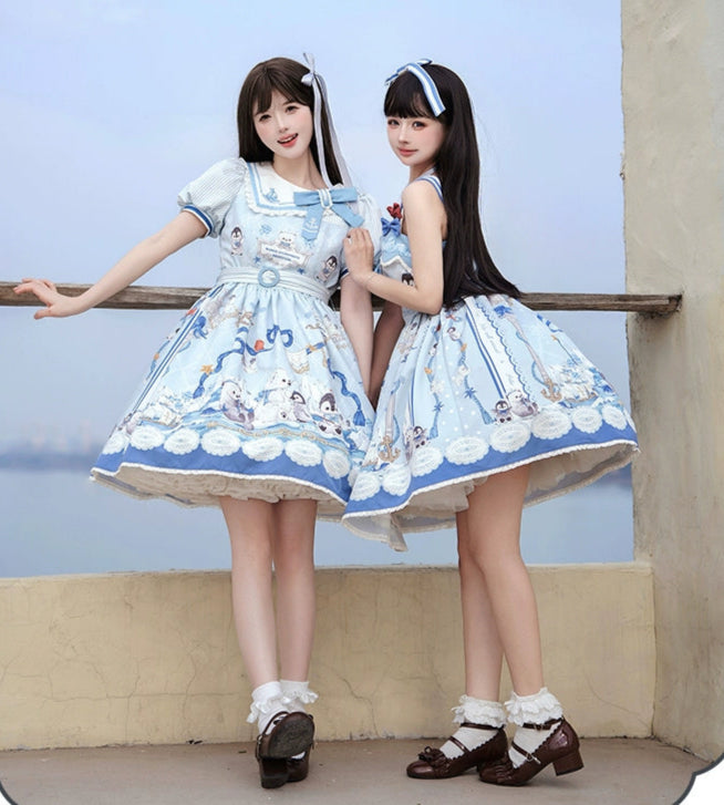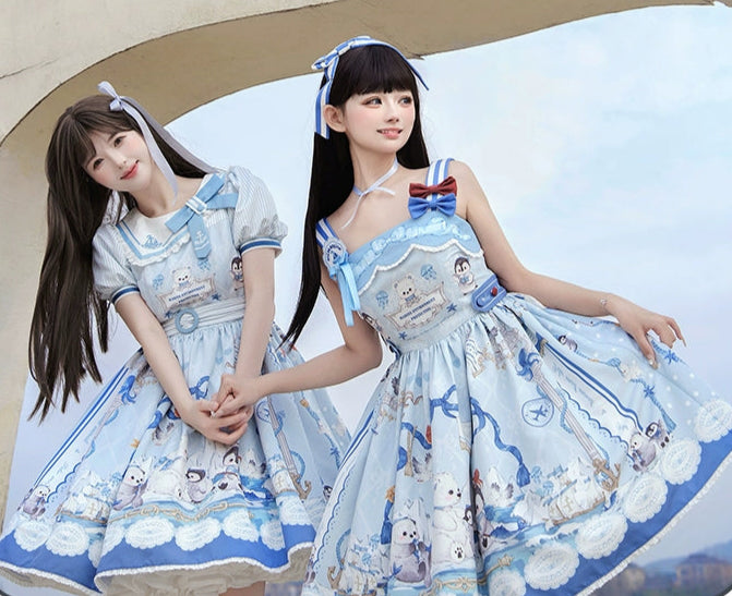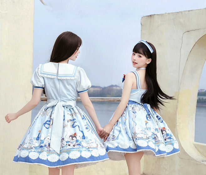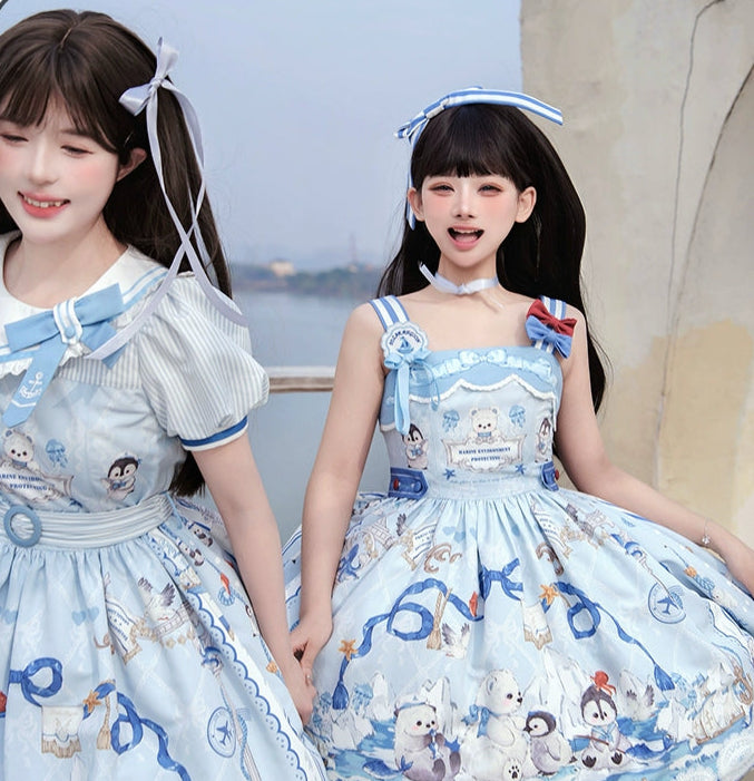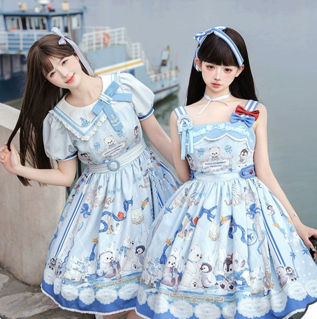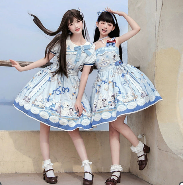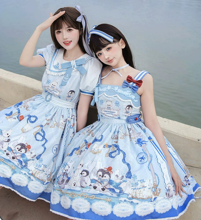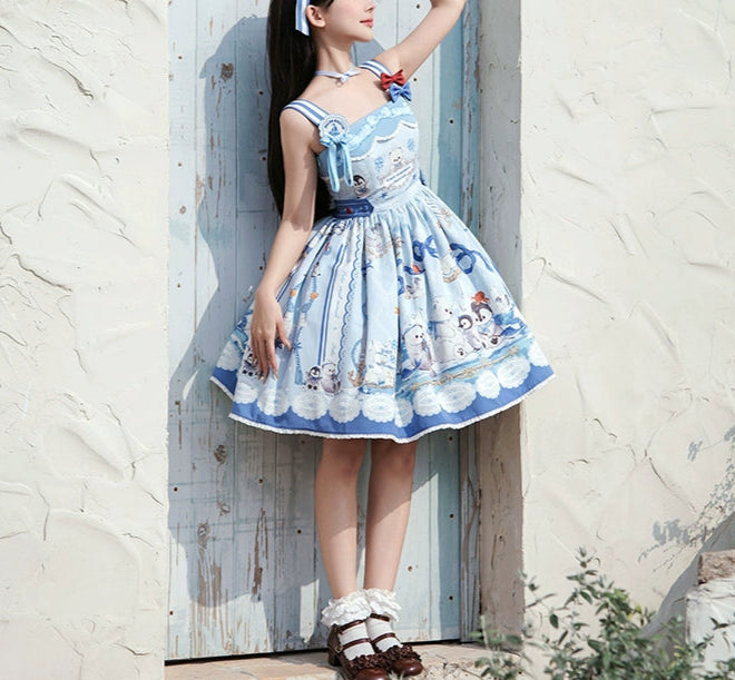 マリンスタイルのペンギンがプリントされた夏にぴったりのジャンパースカート。