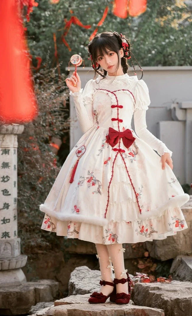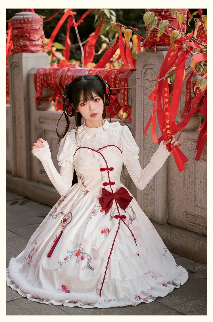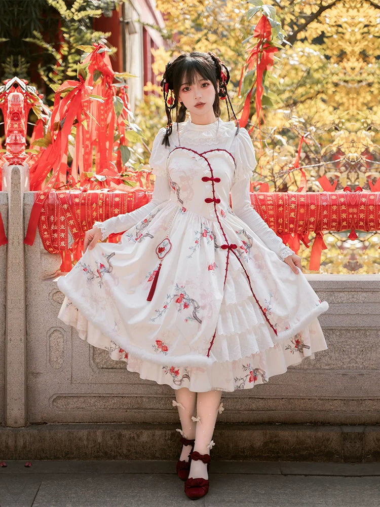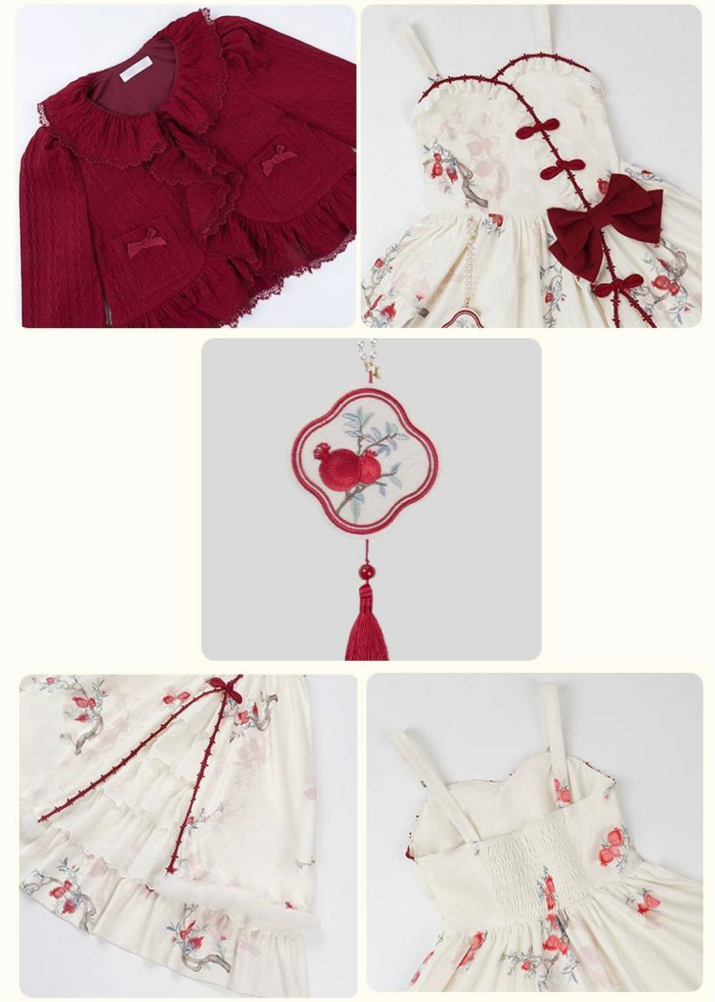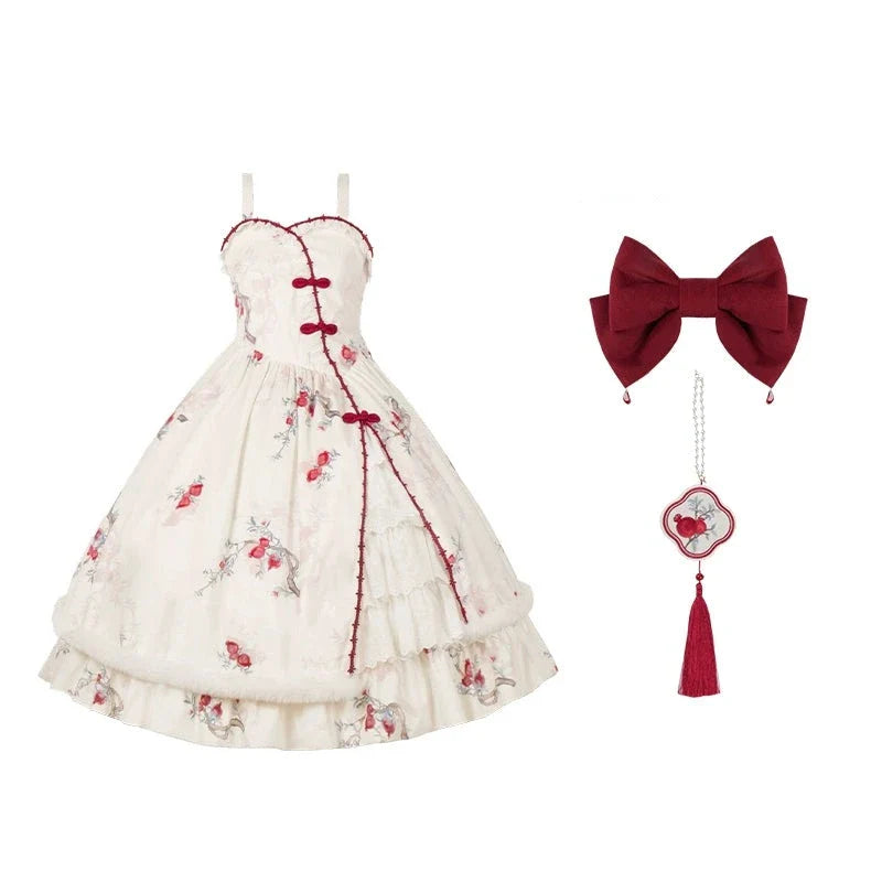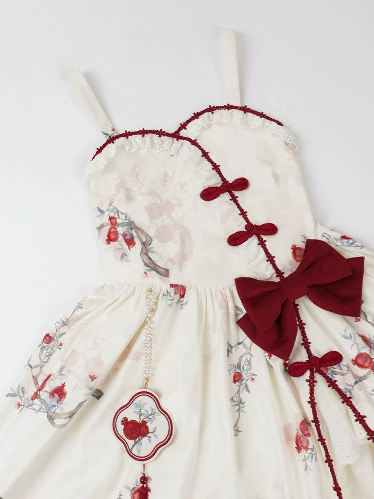A jumper skirt decorated with pomegranates, whose floral meanings include "mature elegance" and "grace."