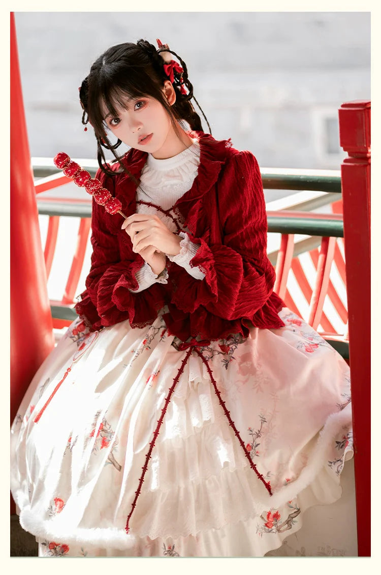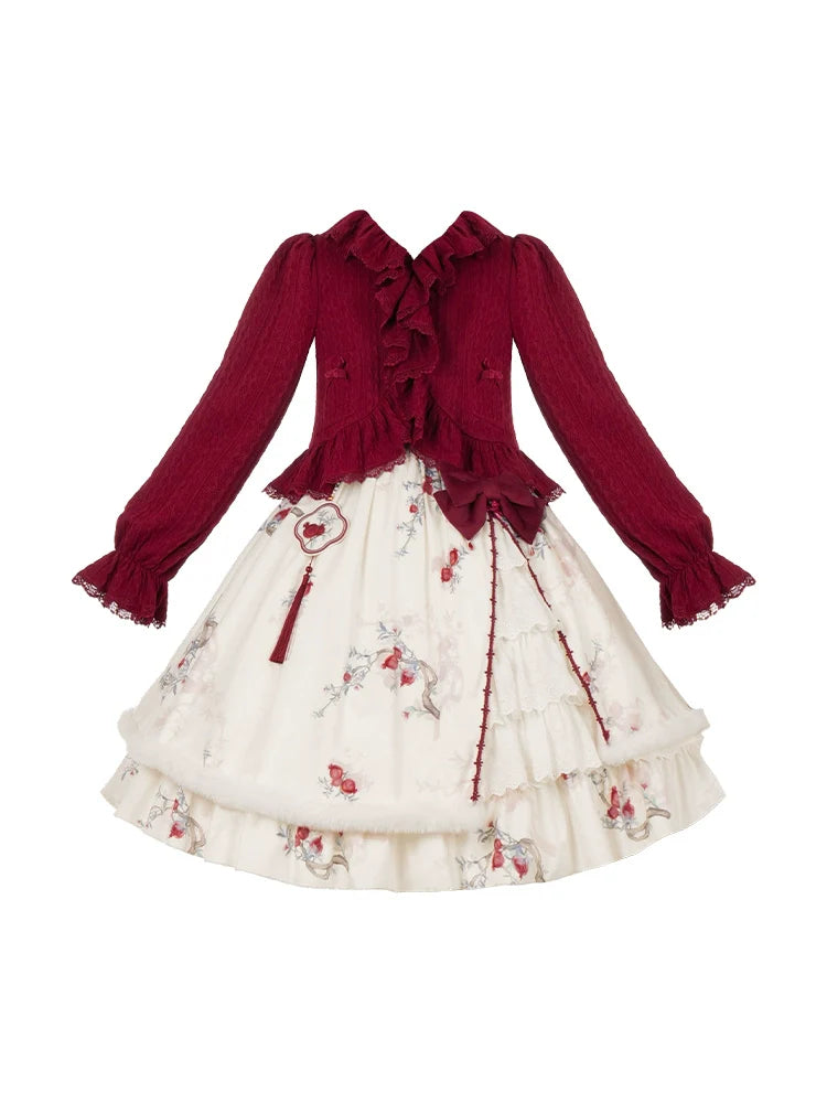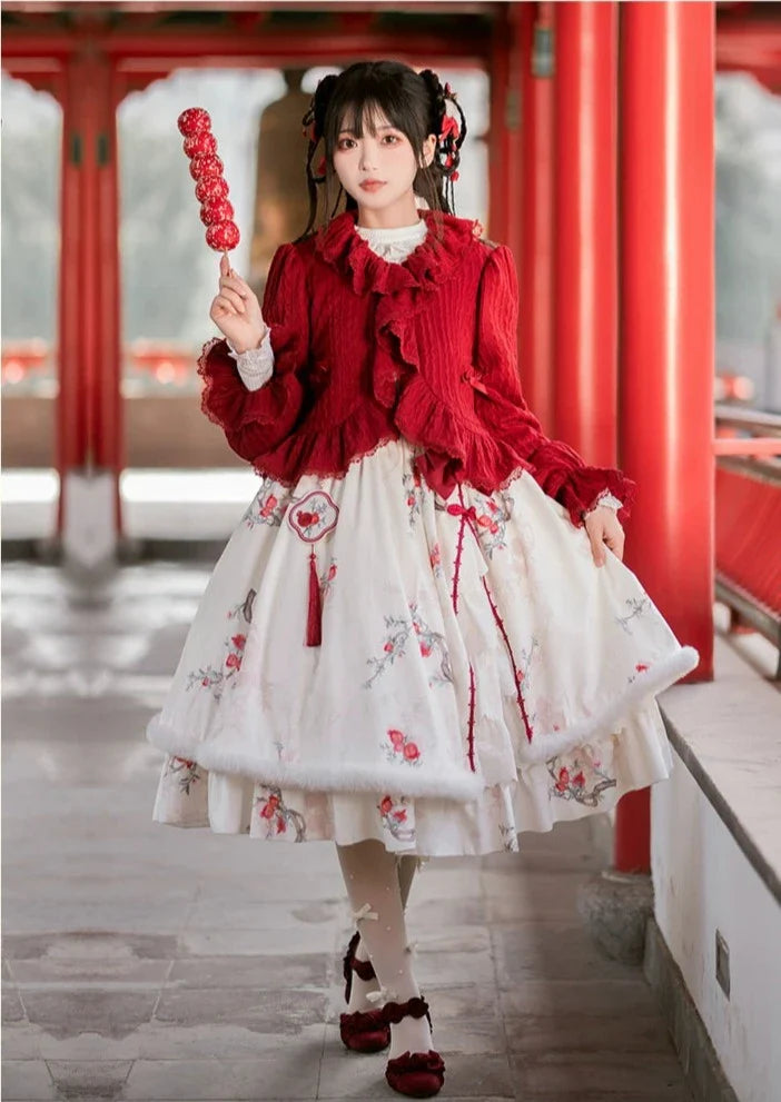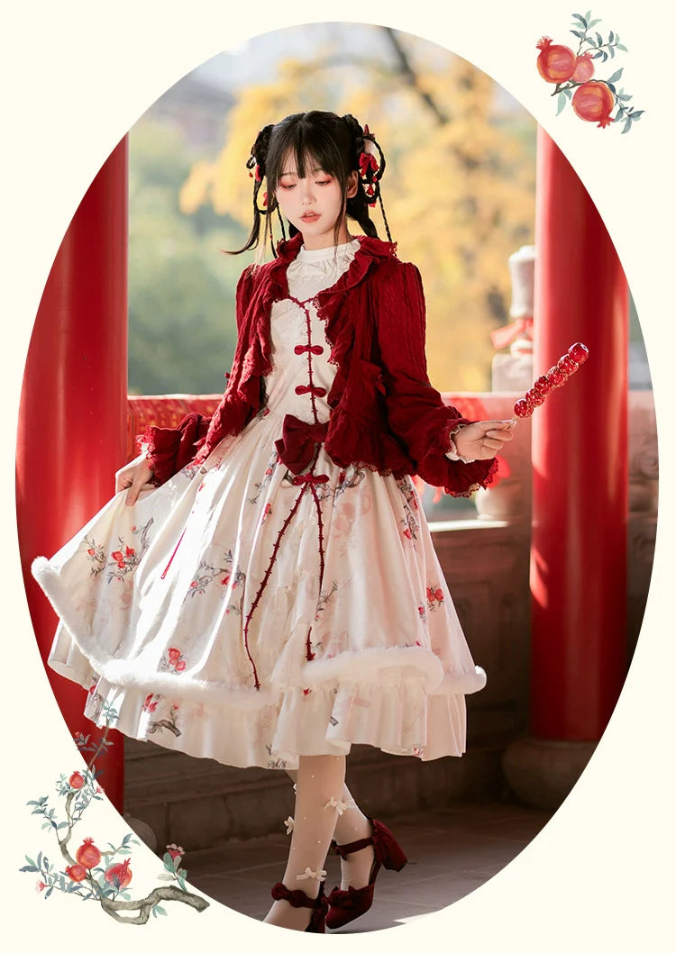 Pomegranate pattern jumper skirt and frilled cardigan