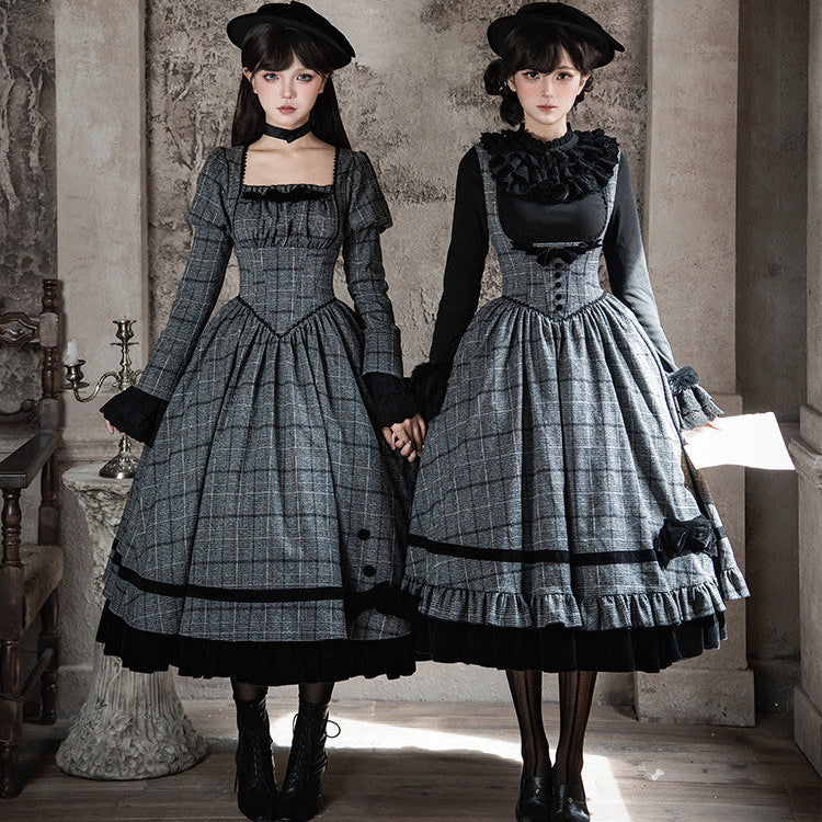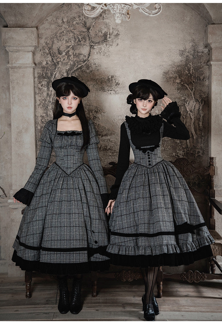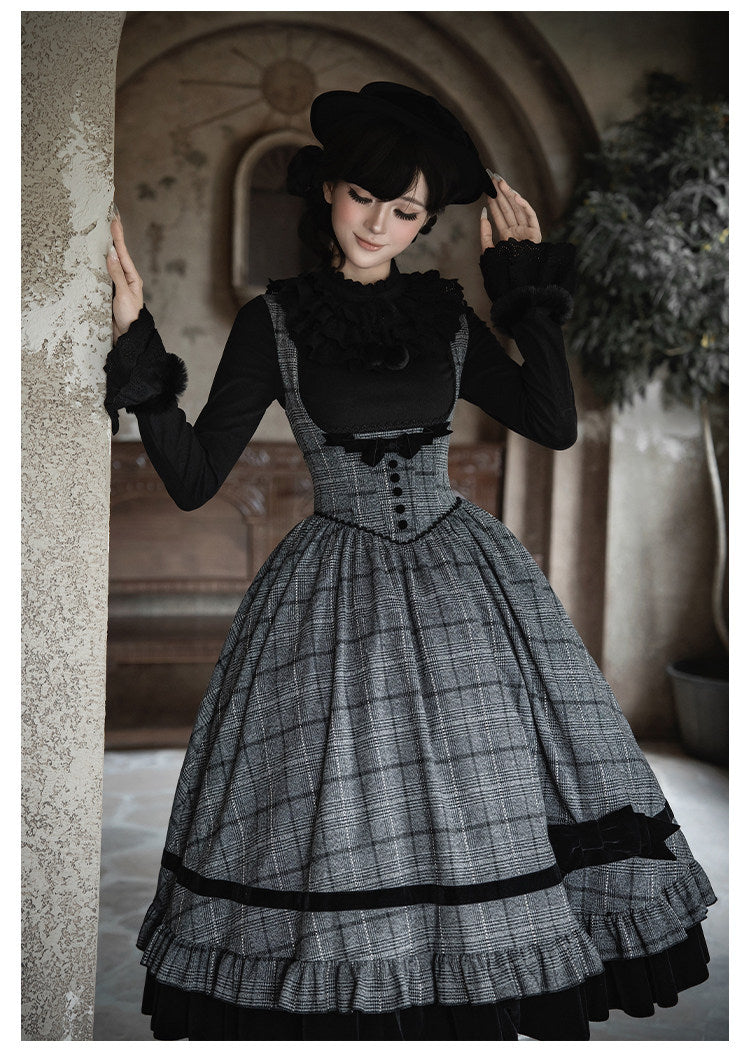 グレーのチェック柄にコルセット風デザインがクラシカルなジャンパースカート。
