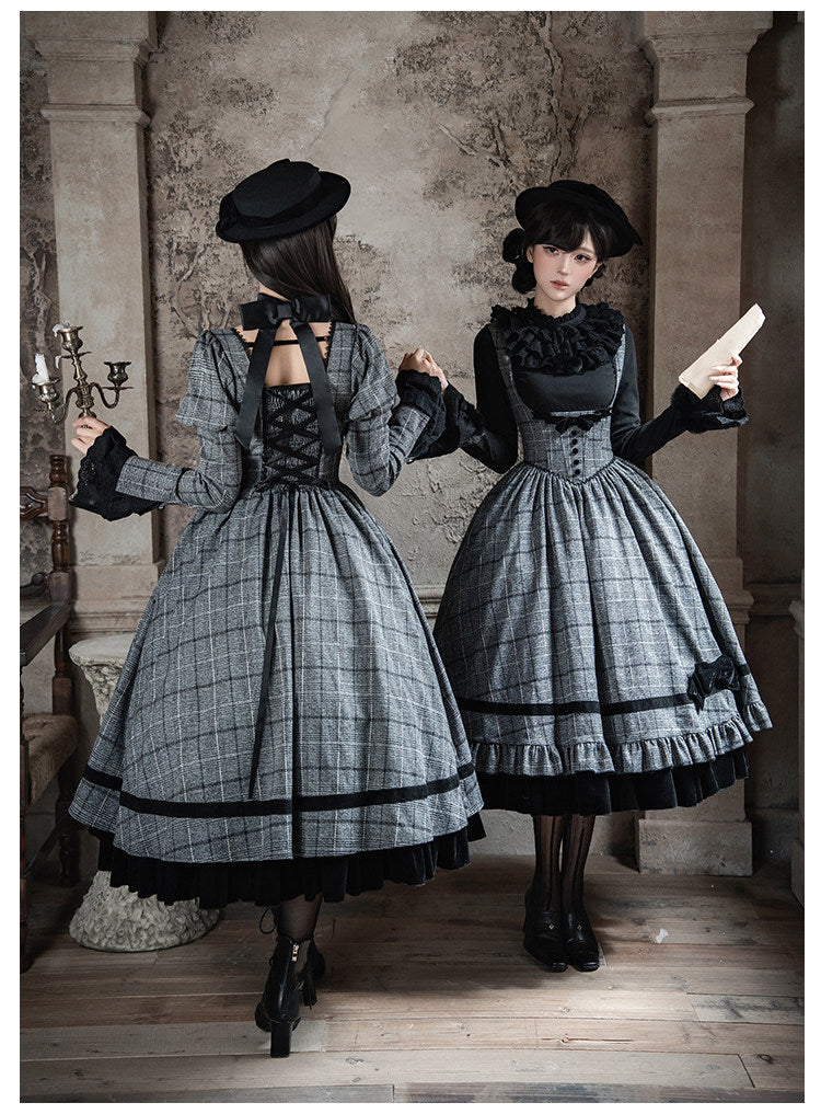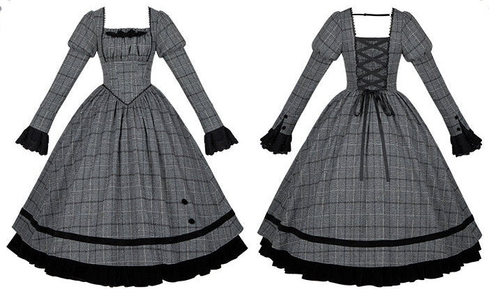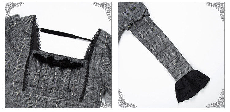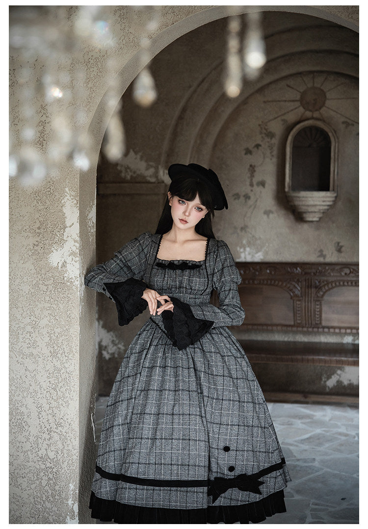 グレーのチェック柄にジゴ袖がクラシカルなワンピース。