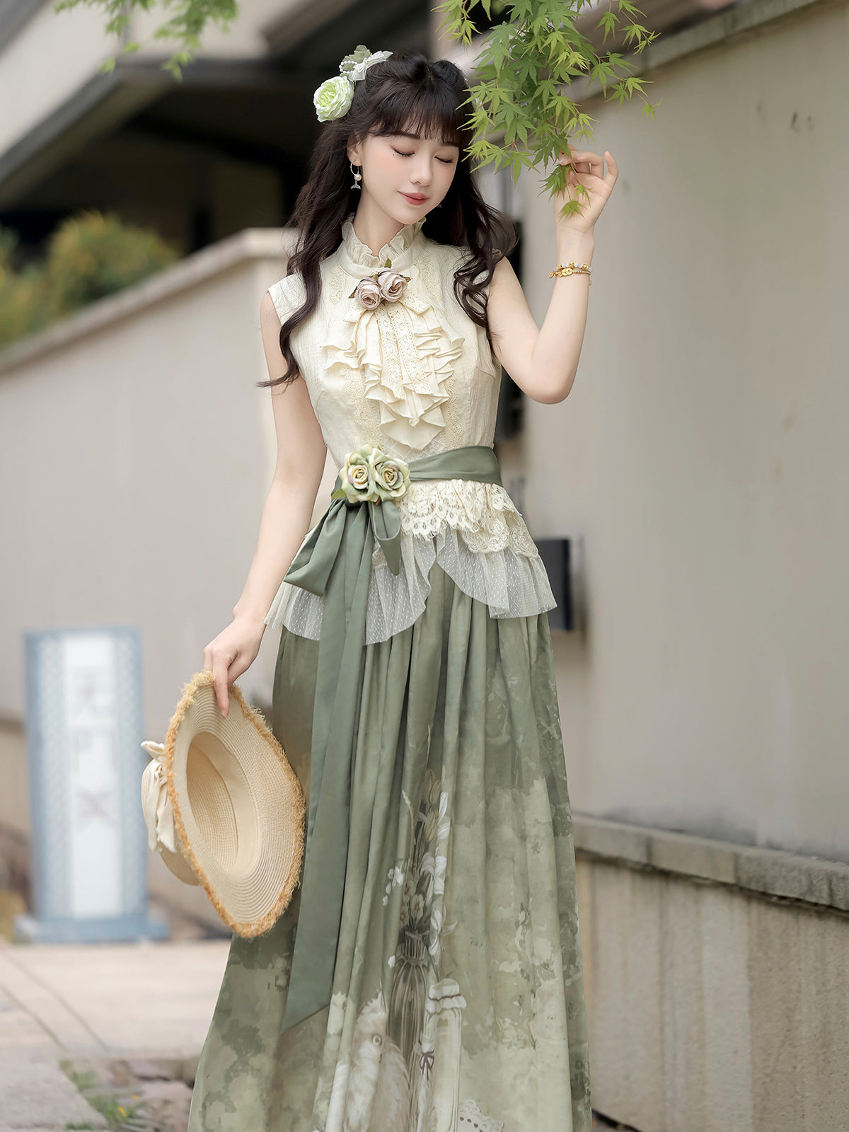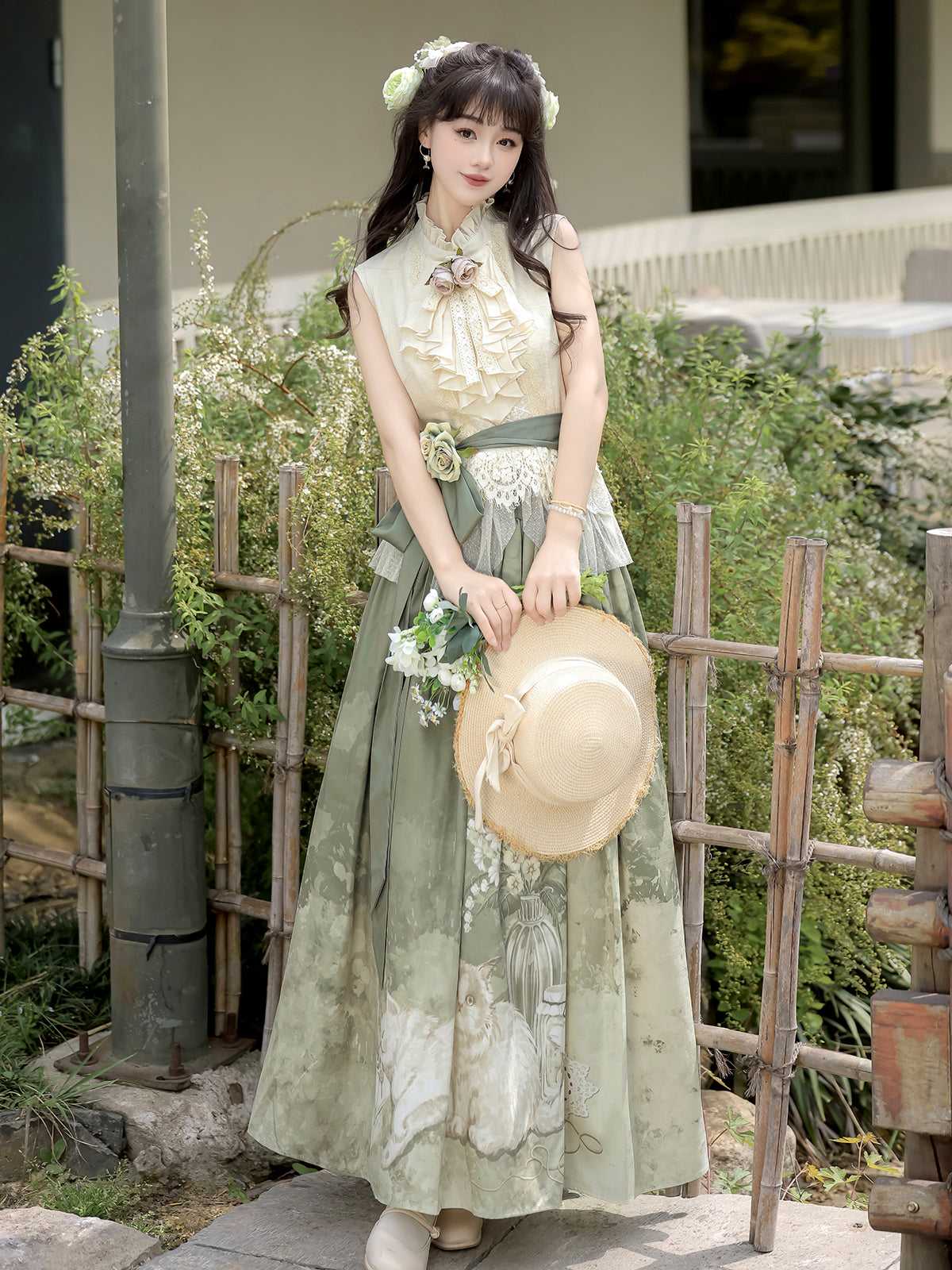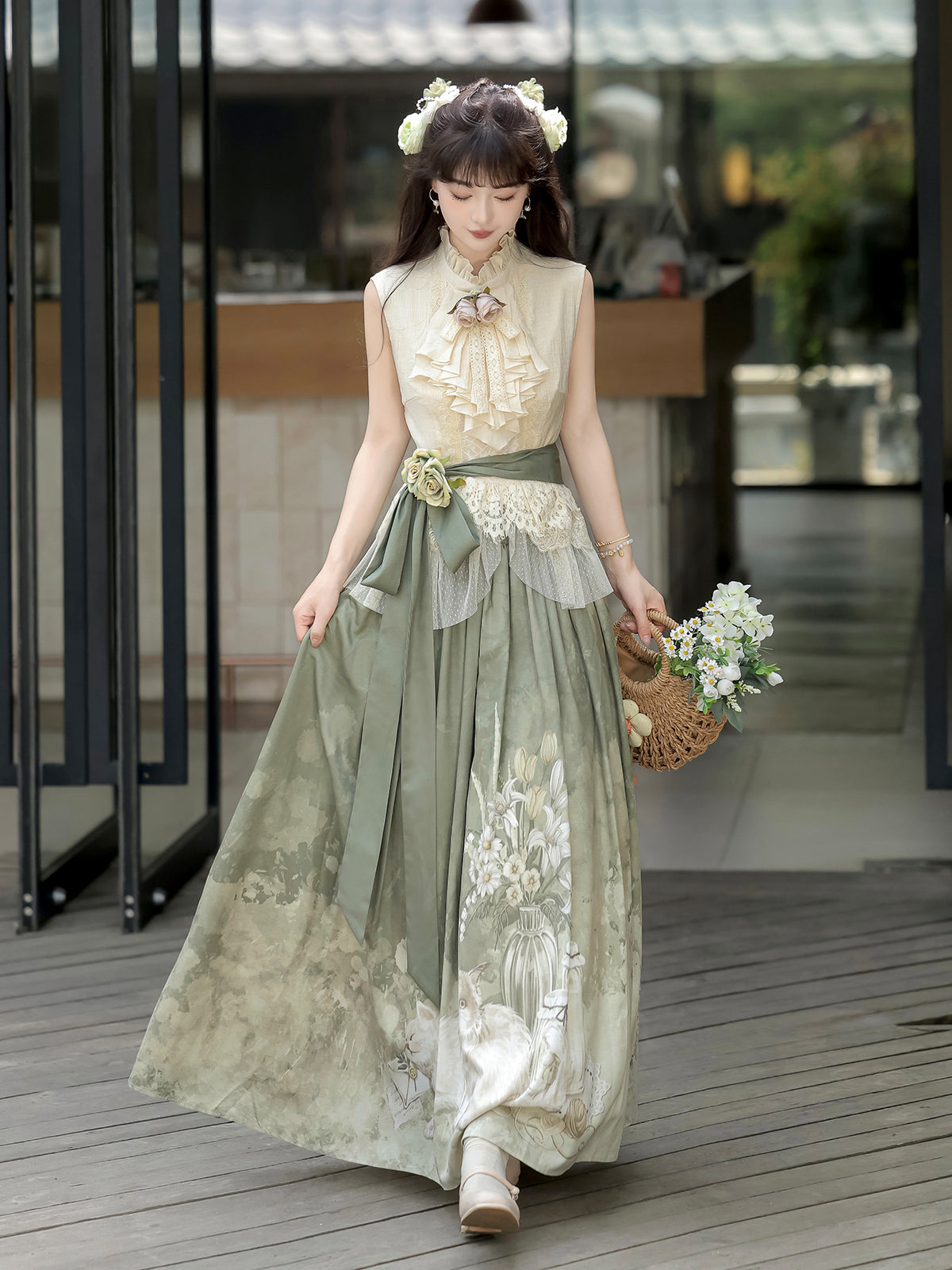 猫と百合の花などが描かれたお淑やかな印象のスカートセットアップ。