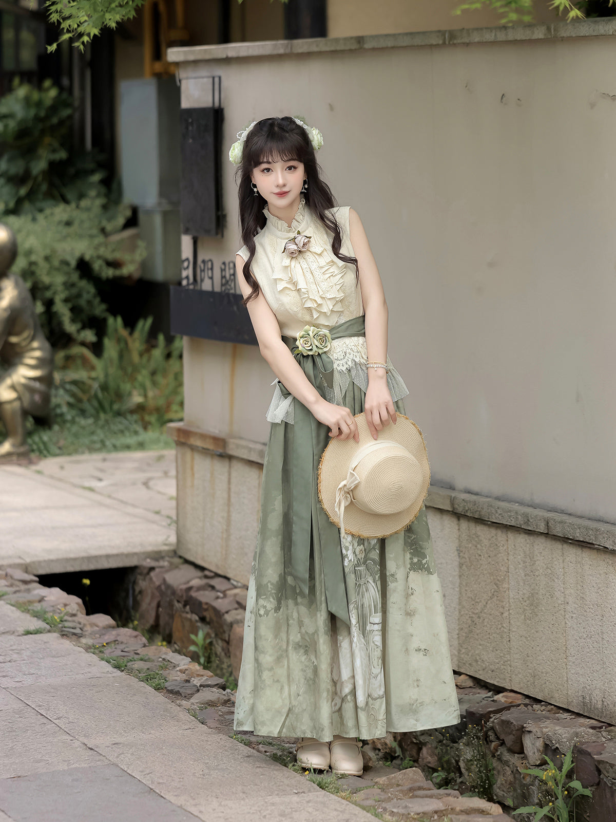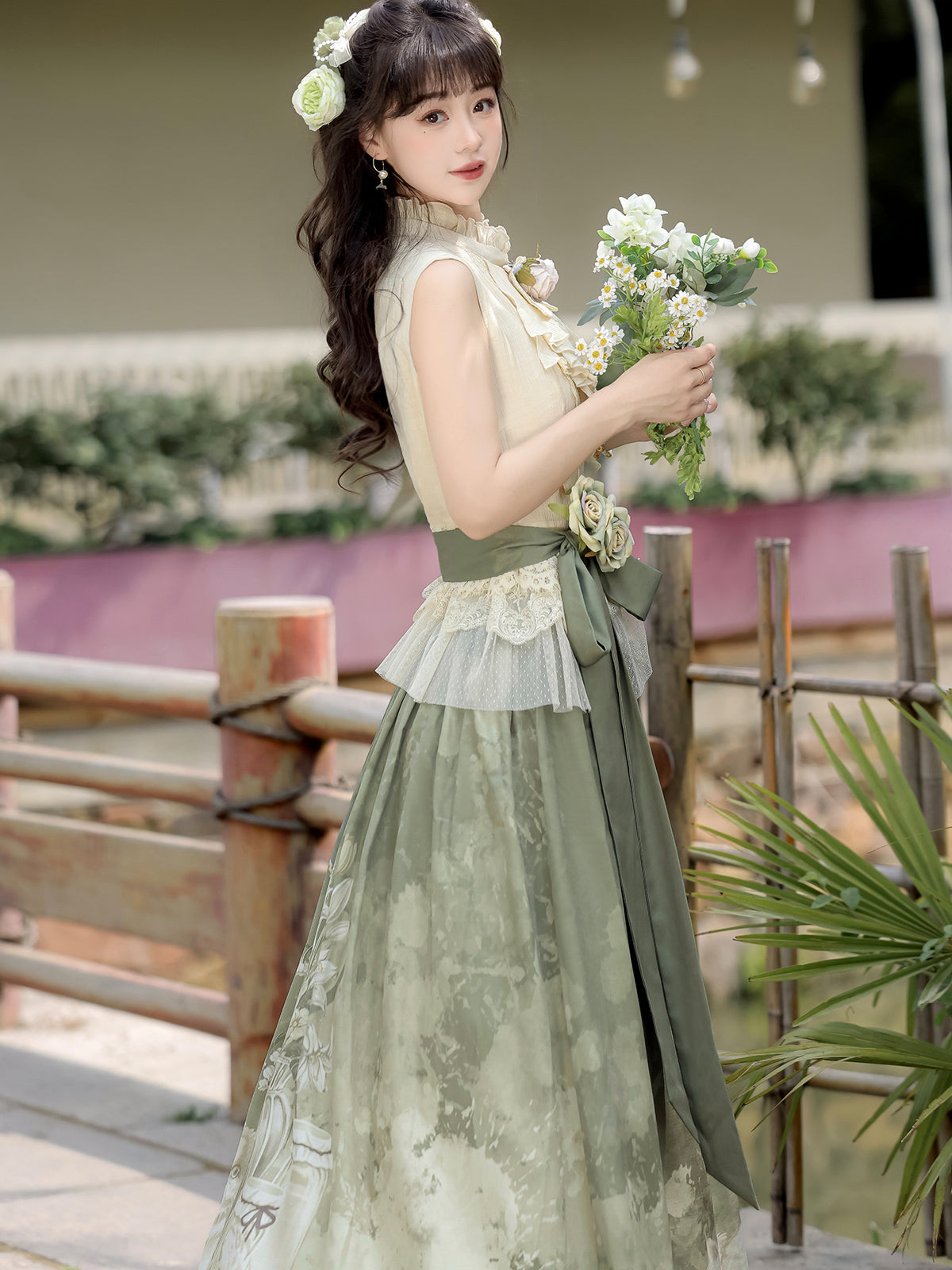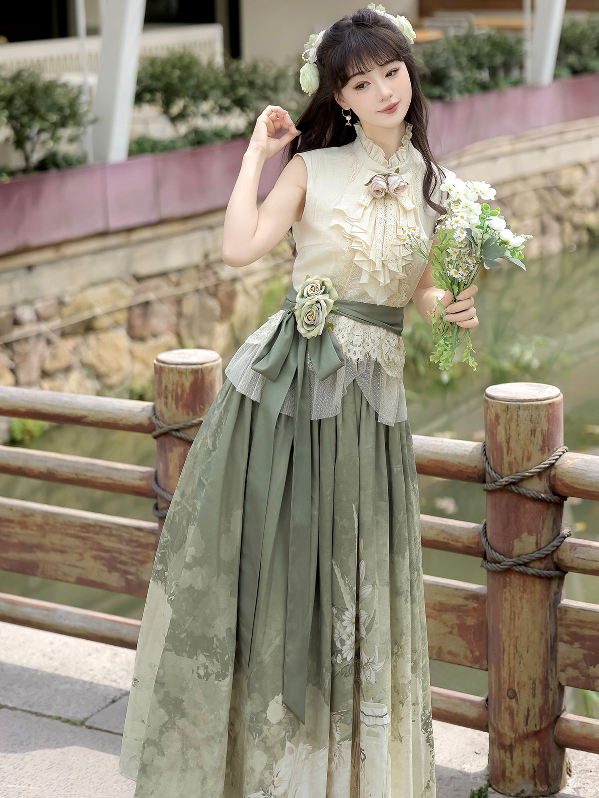 猫と百合の花などが描かれたお淑やかな印象のスカートセットアップ。