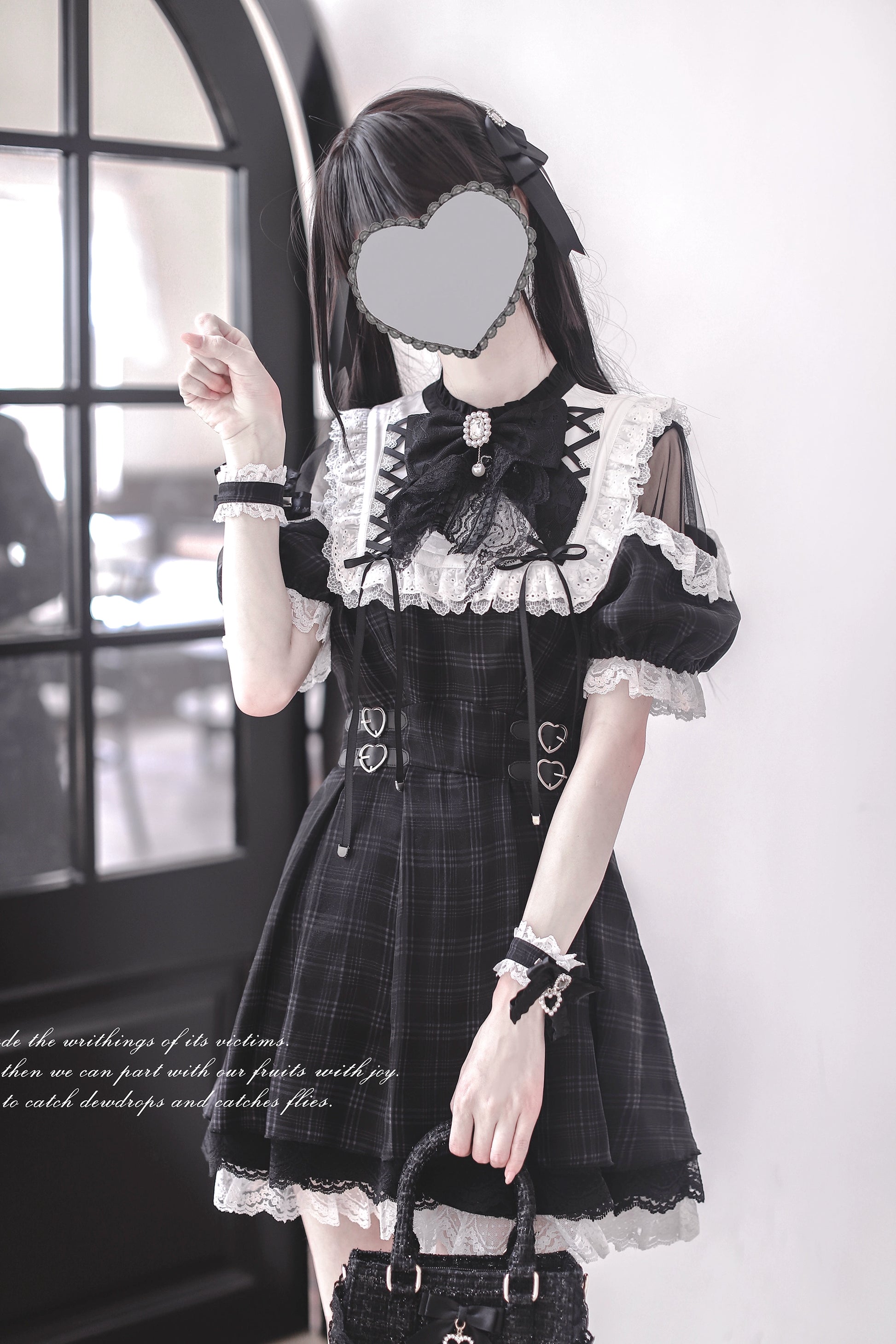 ブラックのにチェック柄に白のレースが映える半袖ワンピース。
