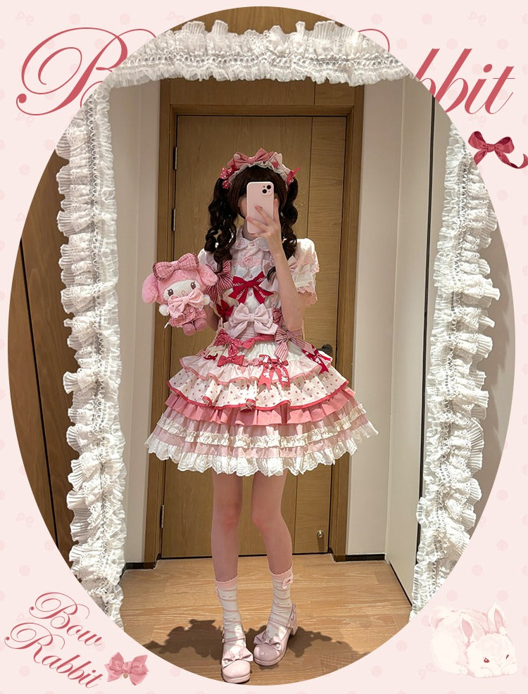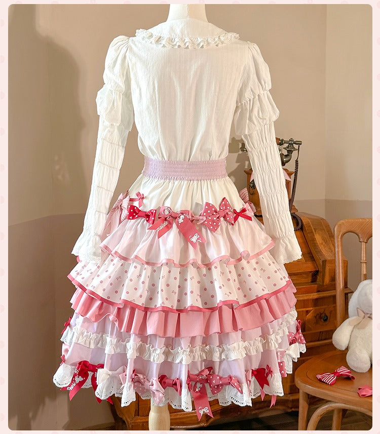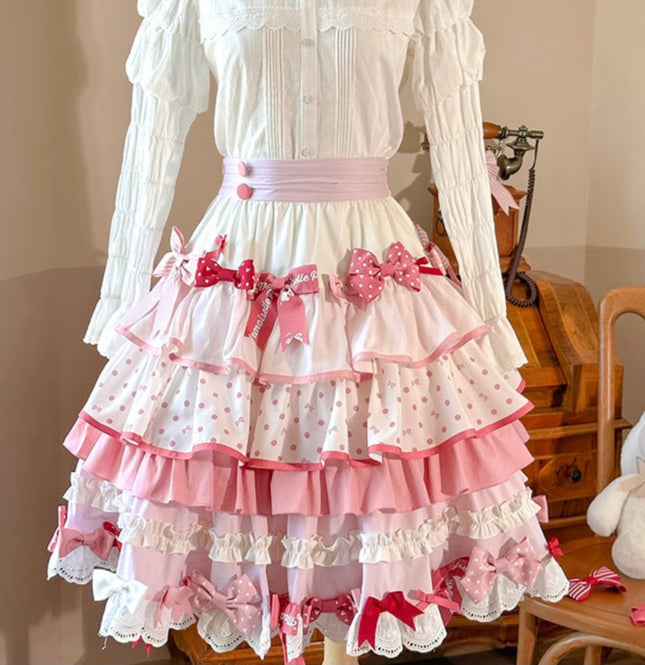 無地や水玉のリボンにレース・フリルと可愛いが詰まったティアードスカート。