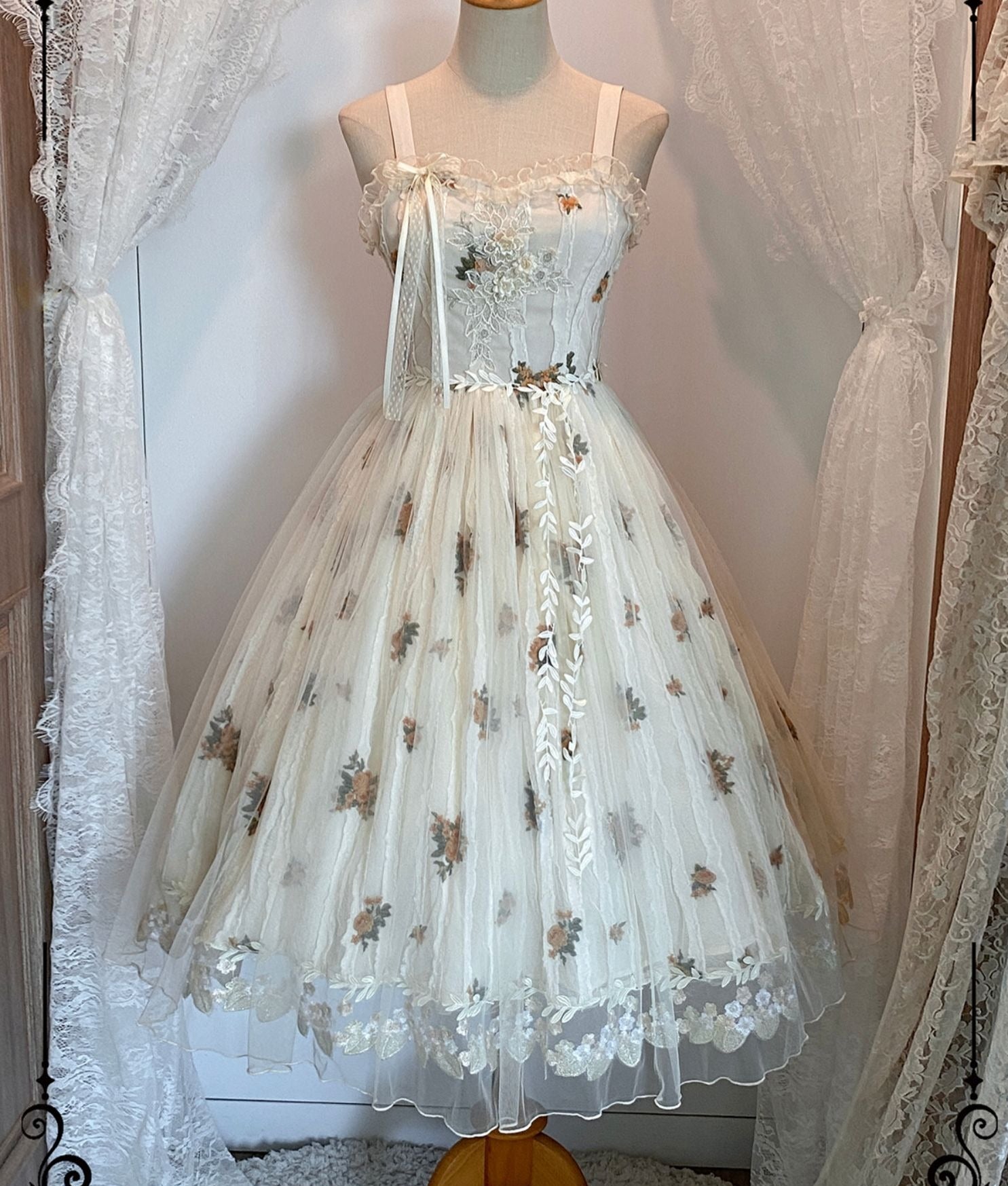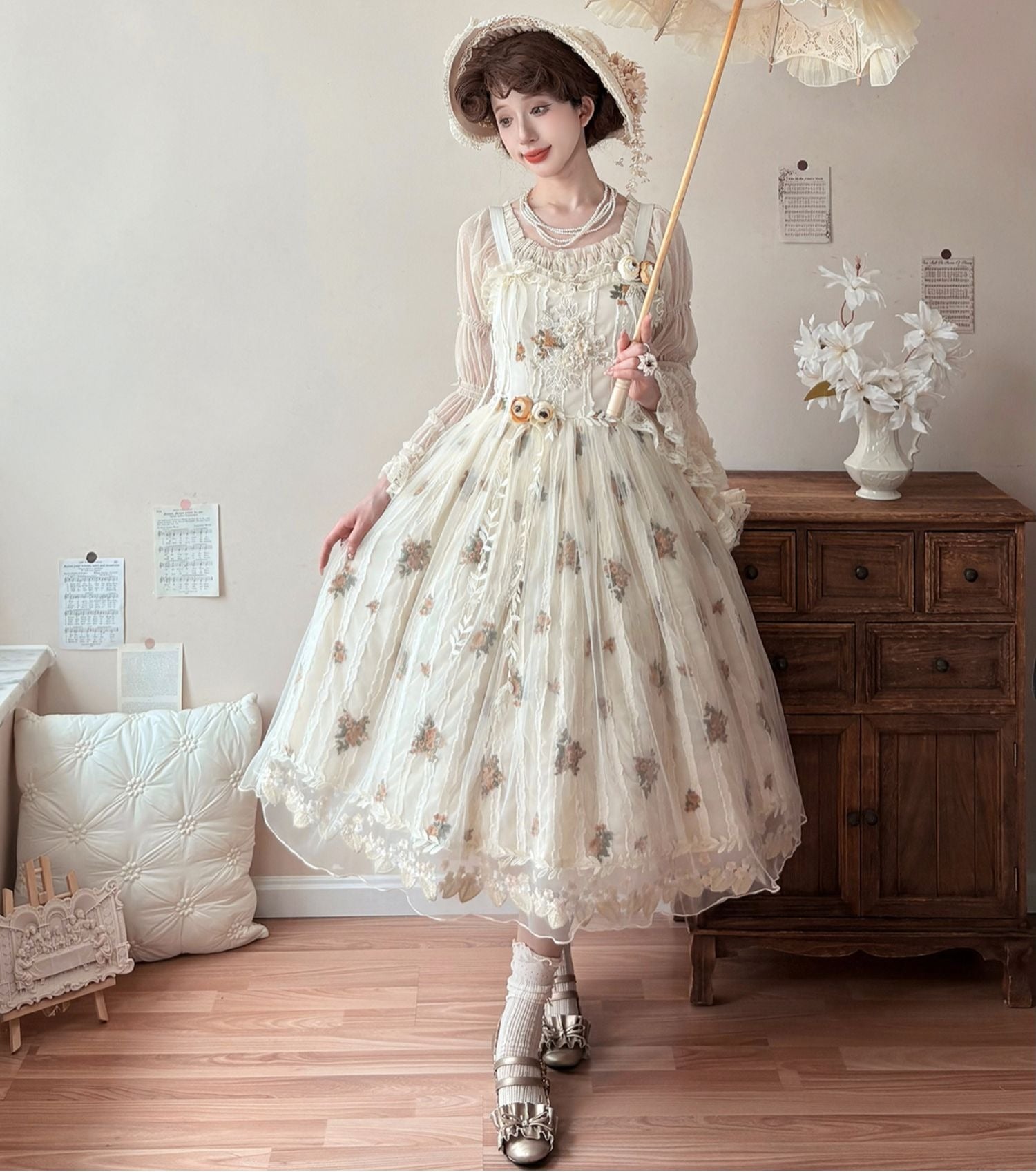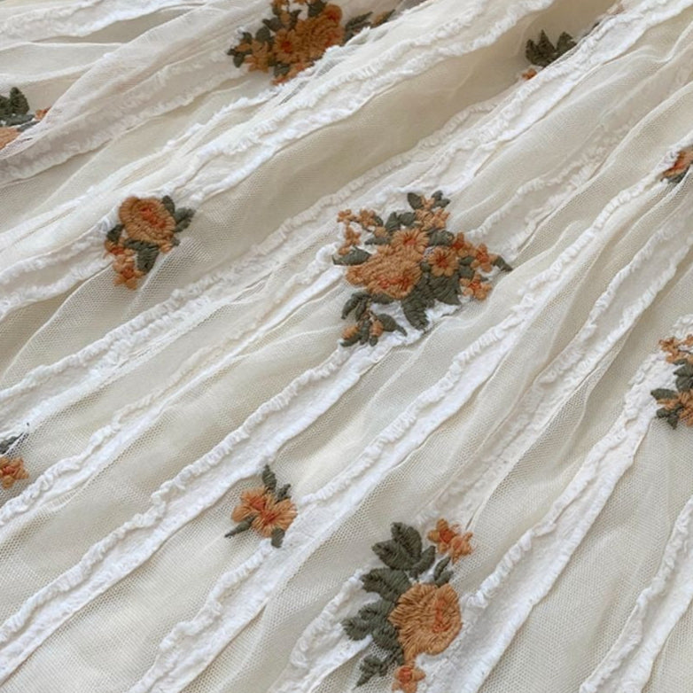 刺繍にシアー素材の組み合わせが優雅なジャンパースカート。