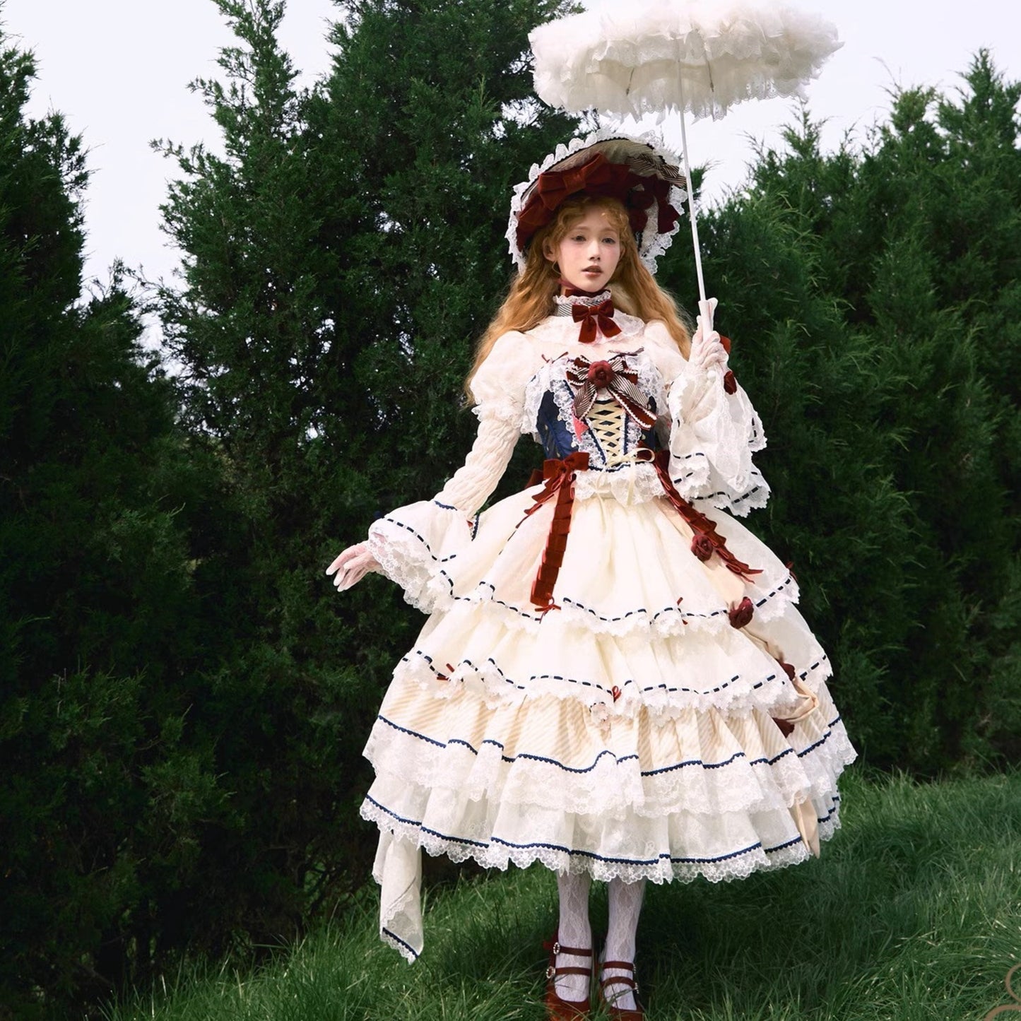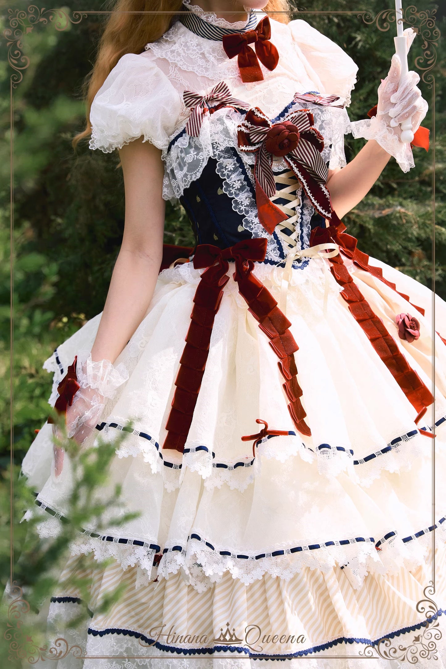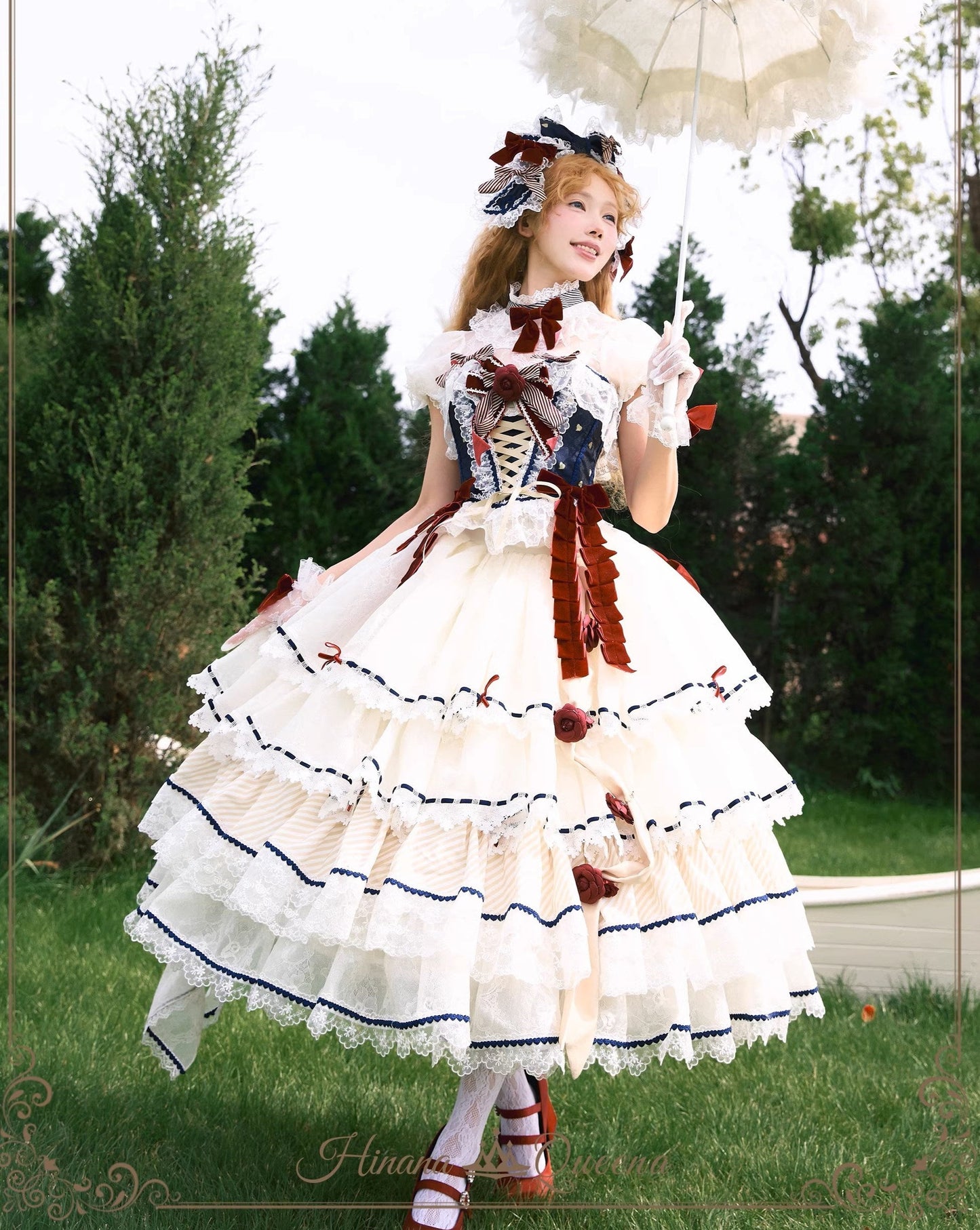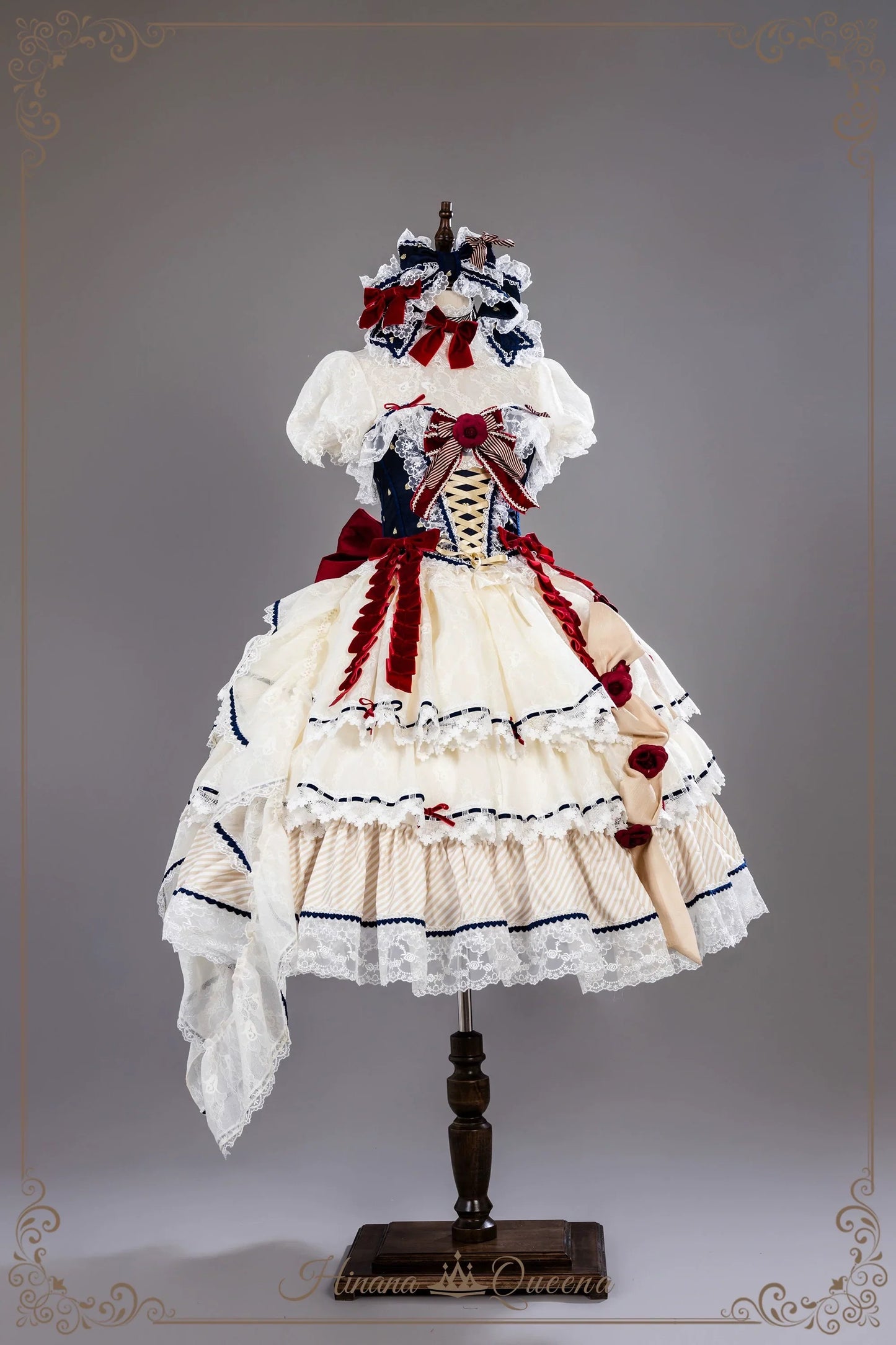 レースとリボンのたっぷりのビスチェとティアードスカート。ホワイトにブルーとレッドの差し色がかわいい白雪姫タイプ。ショート丈はこちら