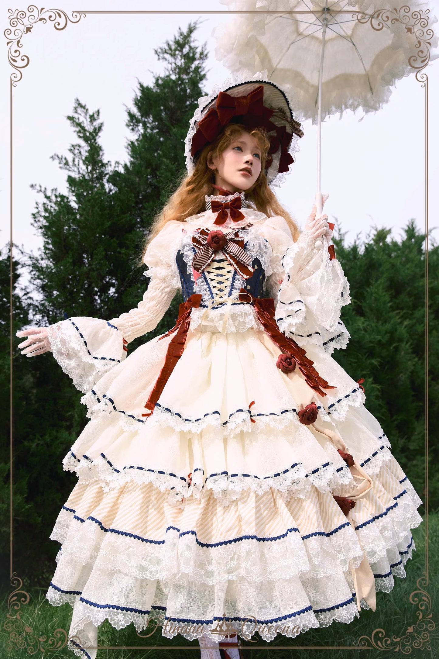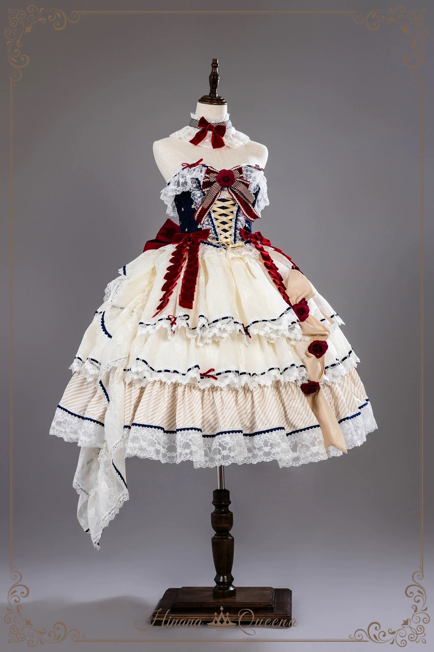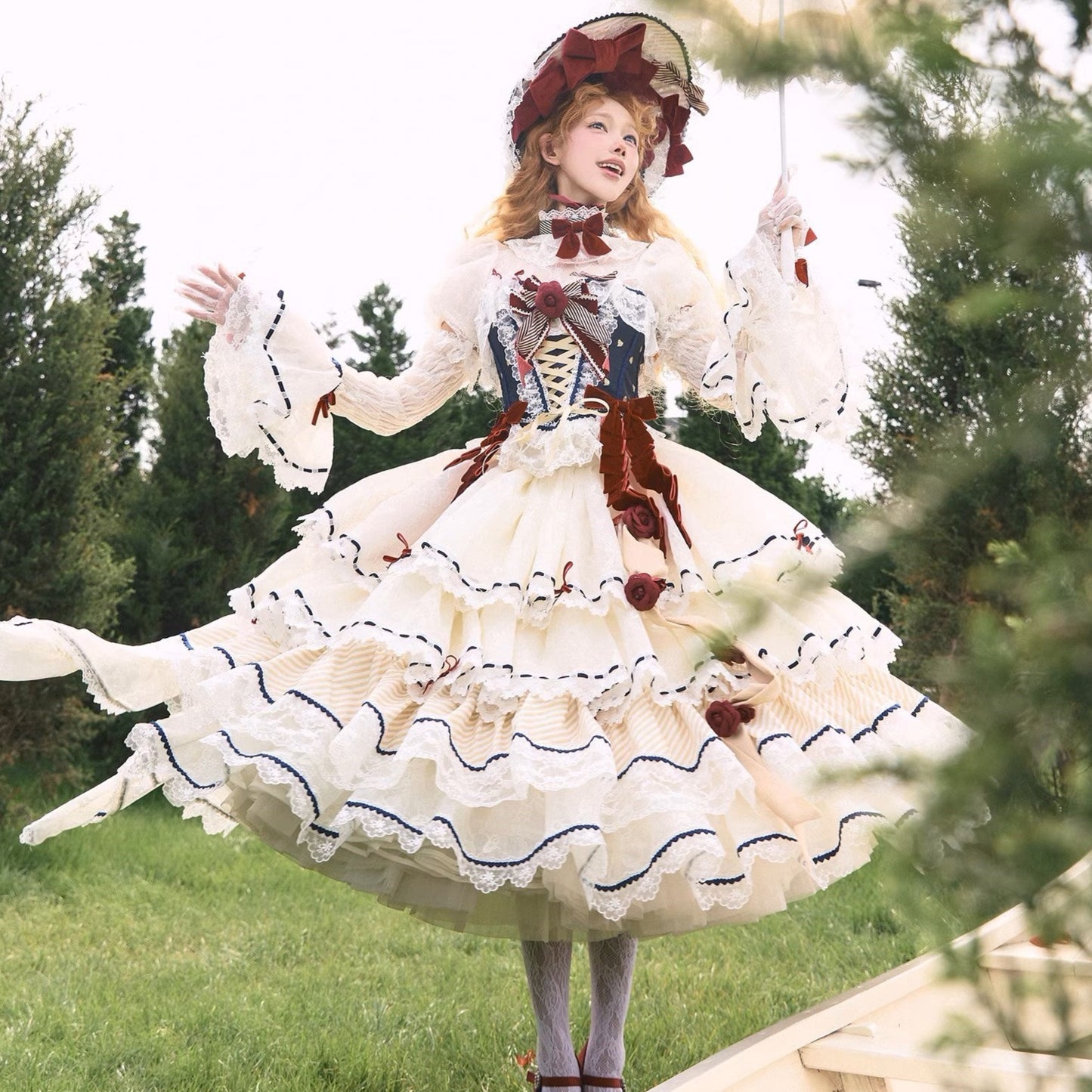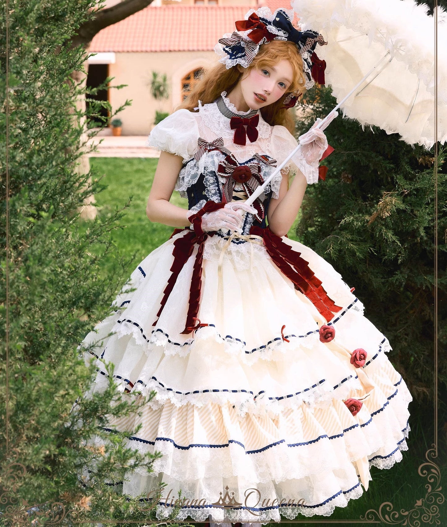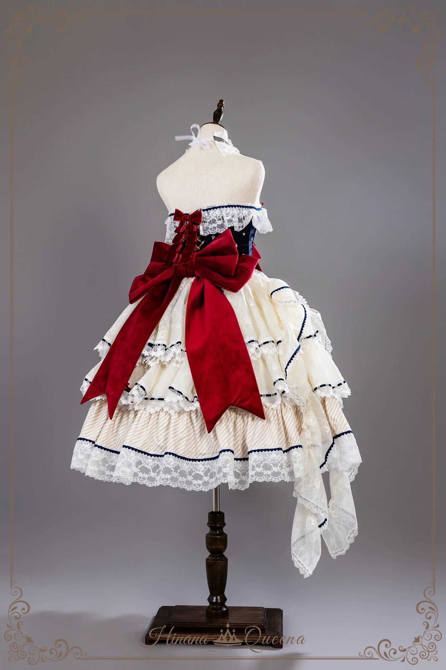 レースとリボンのたっぷりのビスチェとティアードスカート。ホワイトにブルーとレッドの差し色がかわいい白雪姫タイプ。ショート丈はこちら