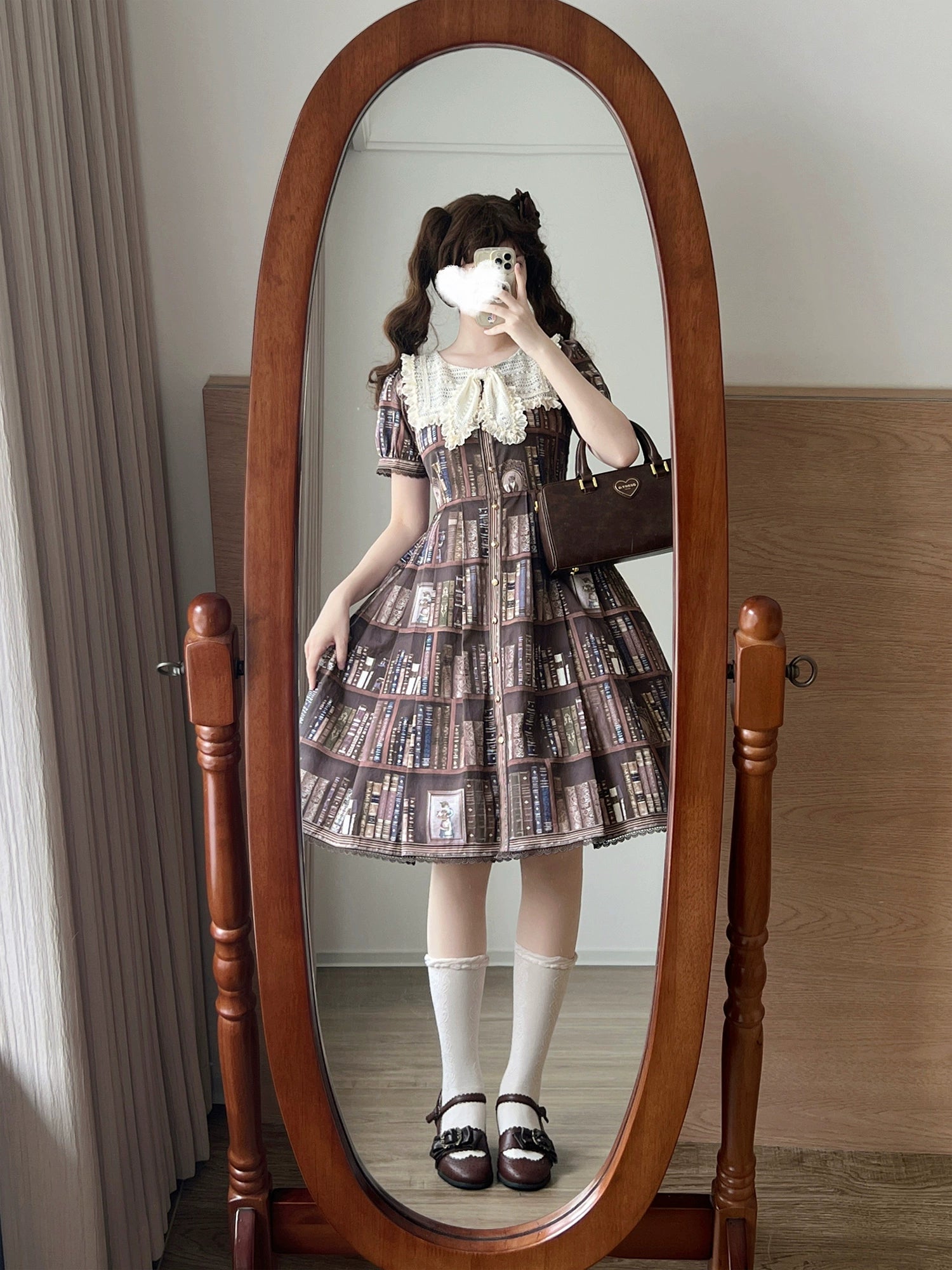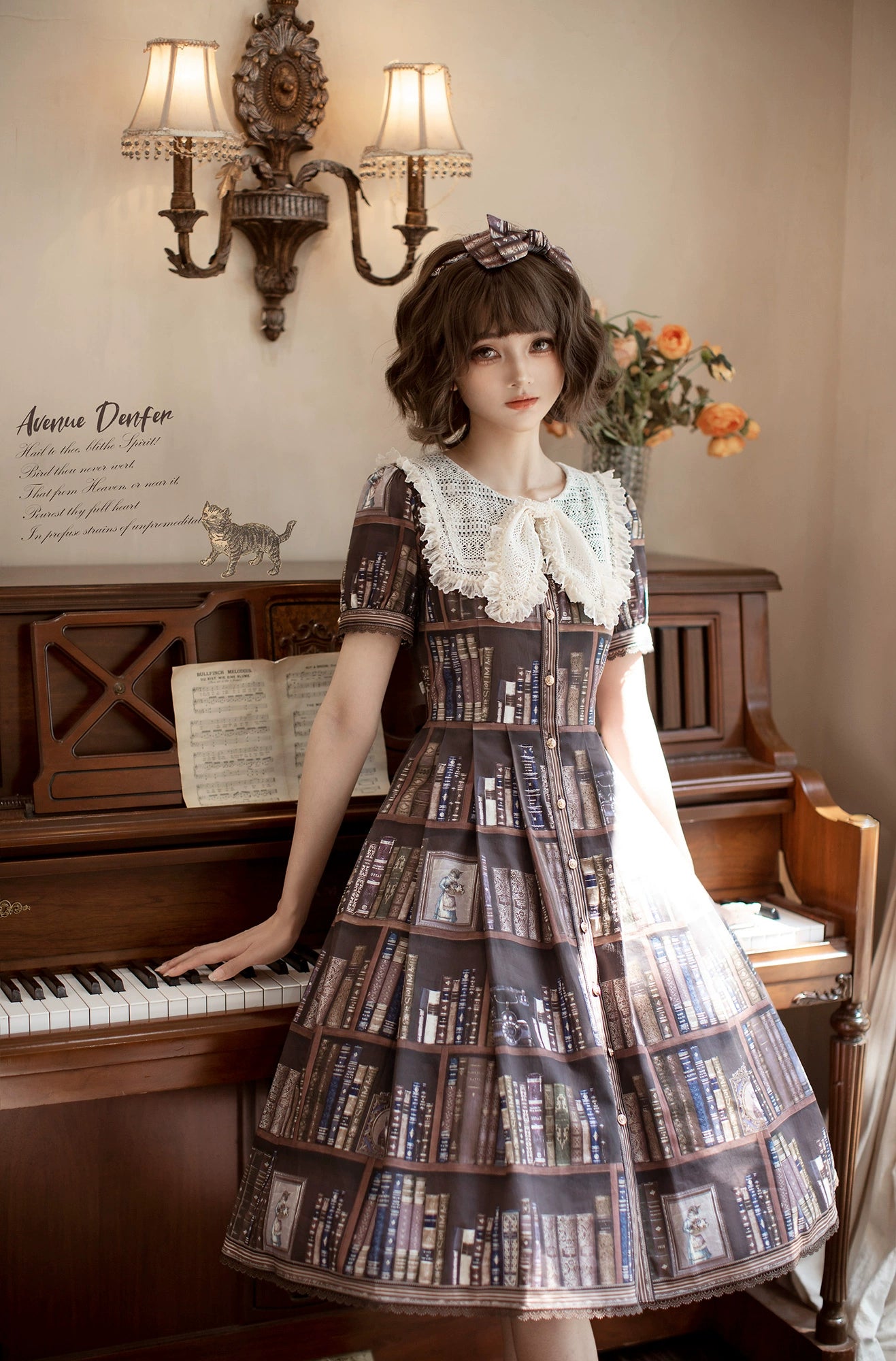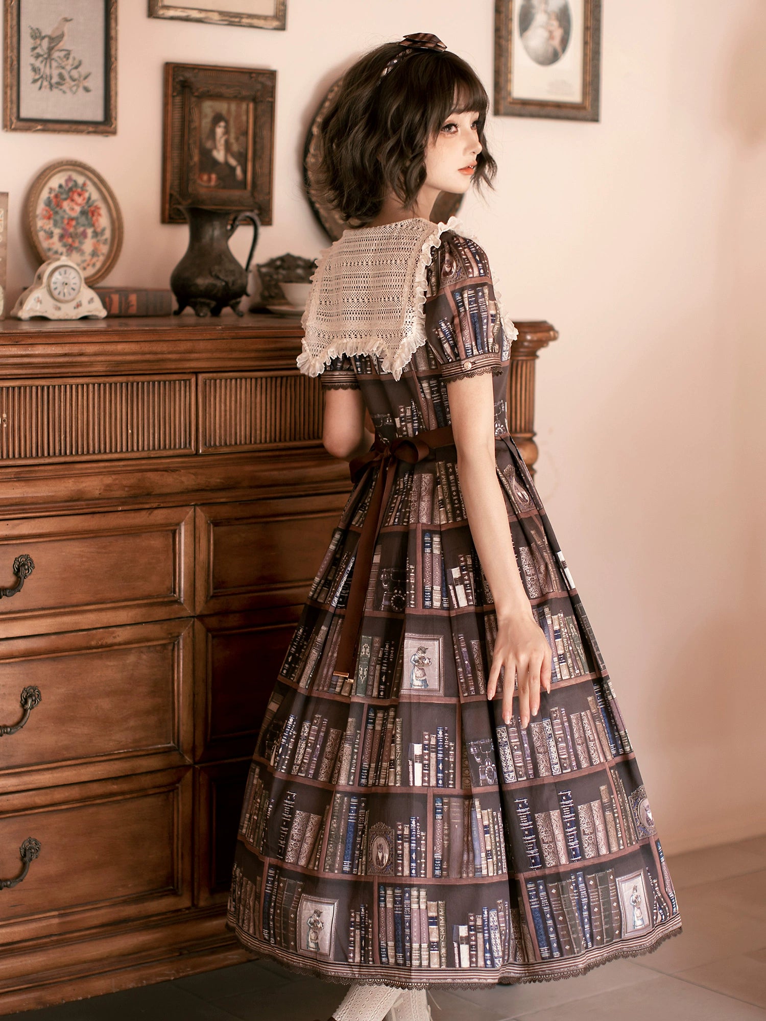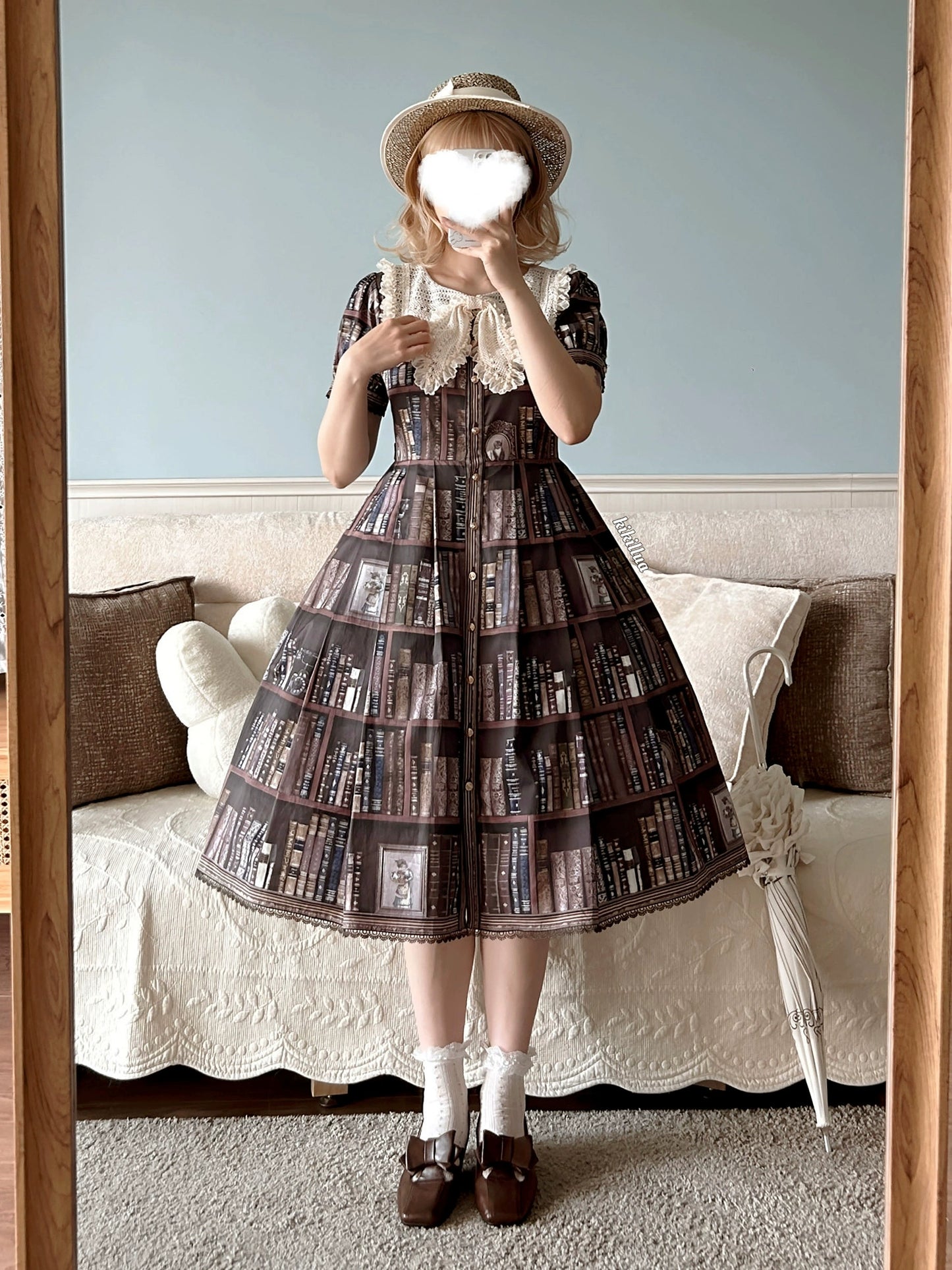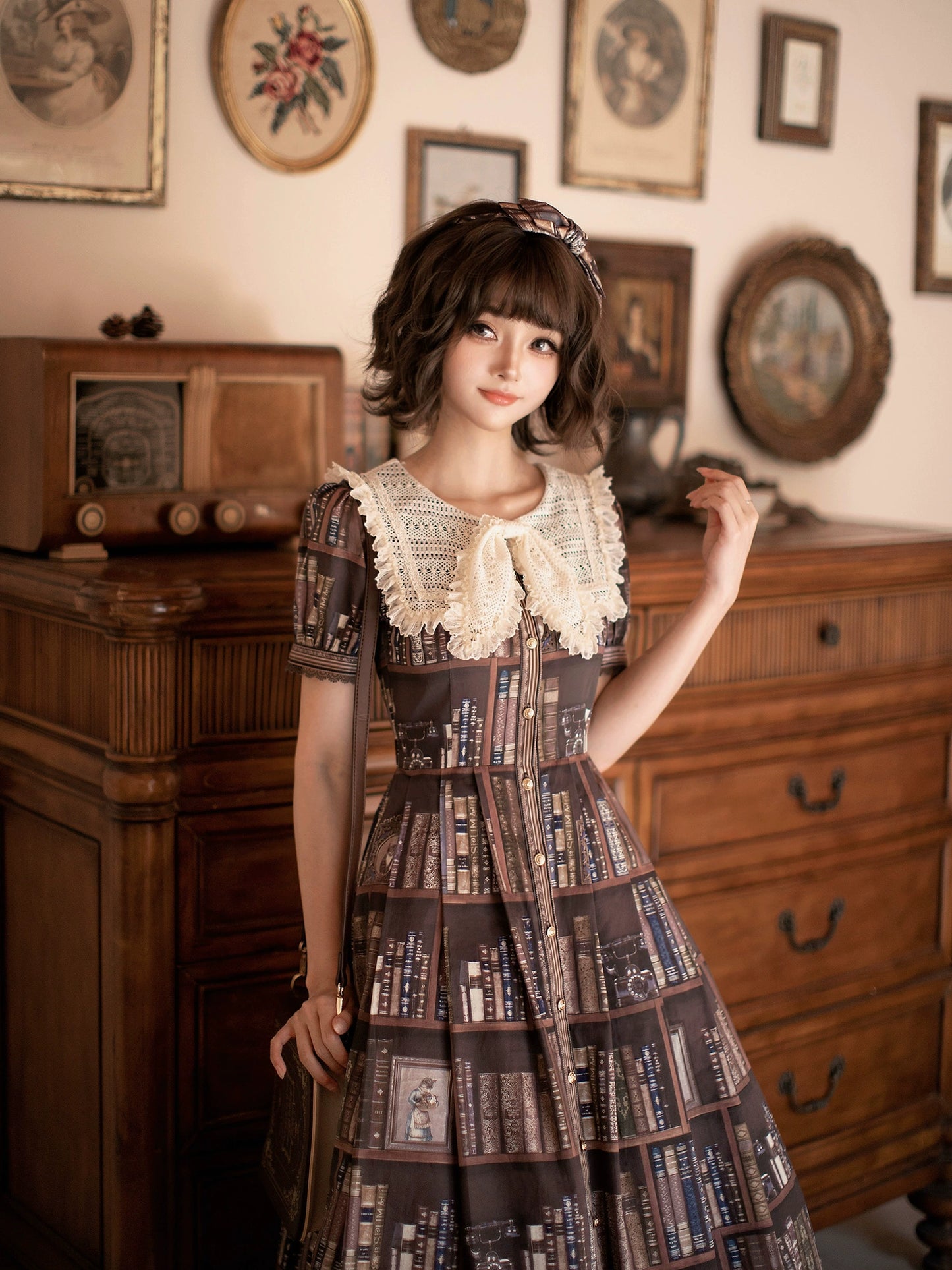 こげ茶色の本棚の中にはいっぱいの本と子猫のフォトフレームが。襟元のレースで可愛らしさををプラスしたクラシカルなワンピースです。