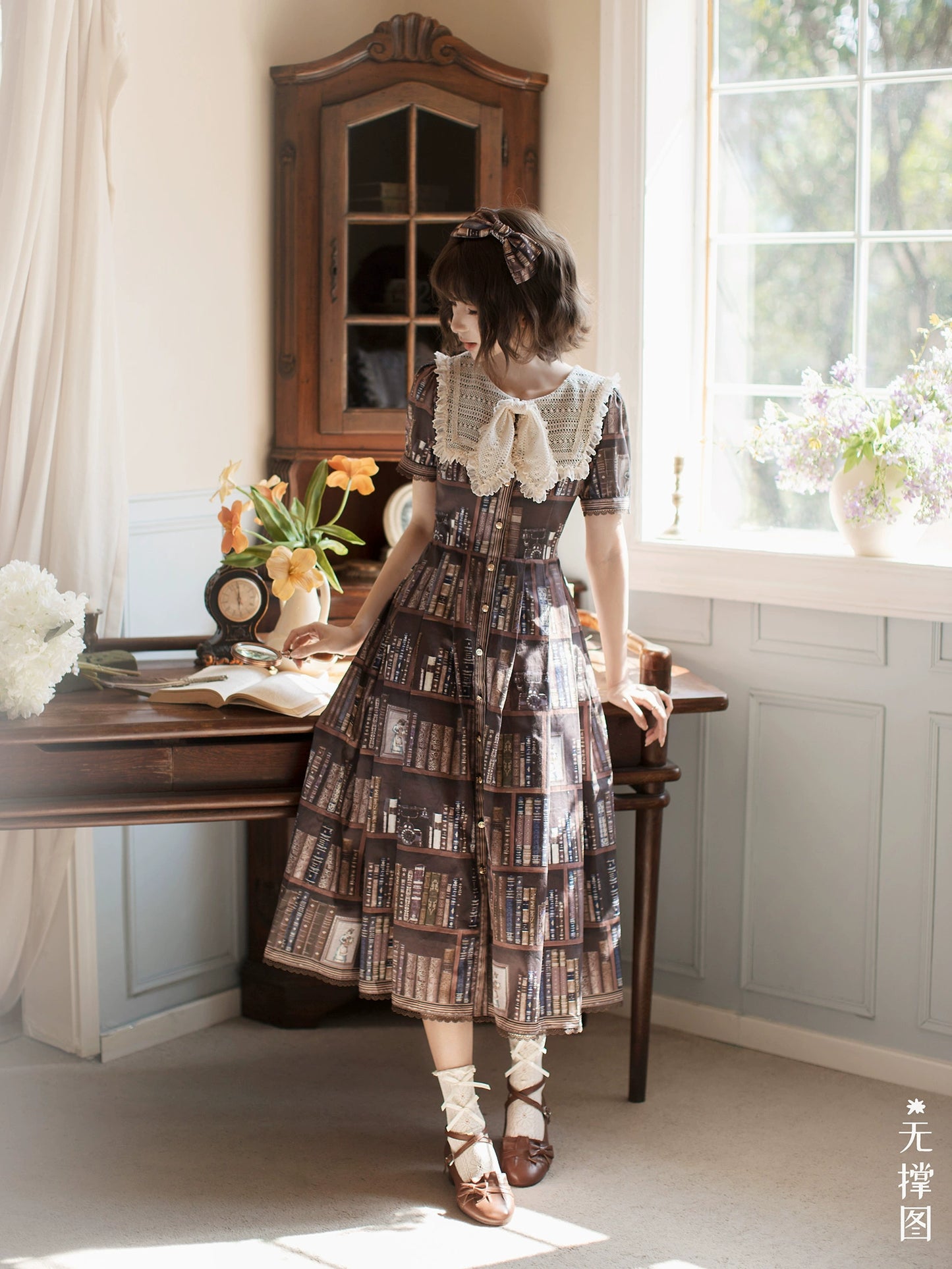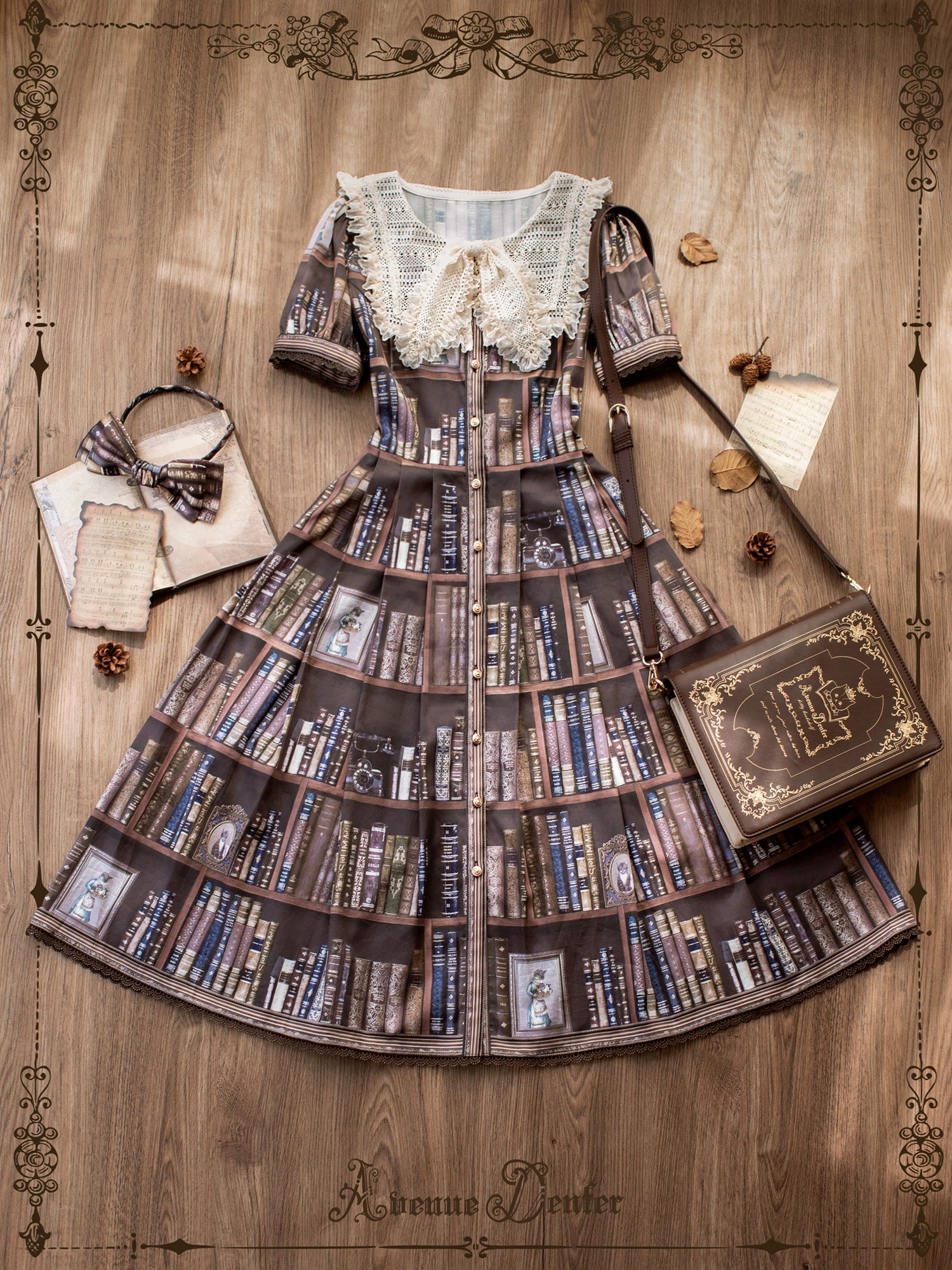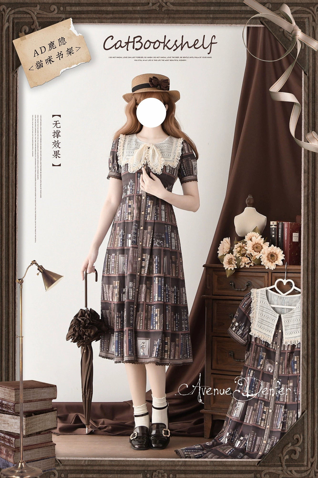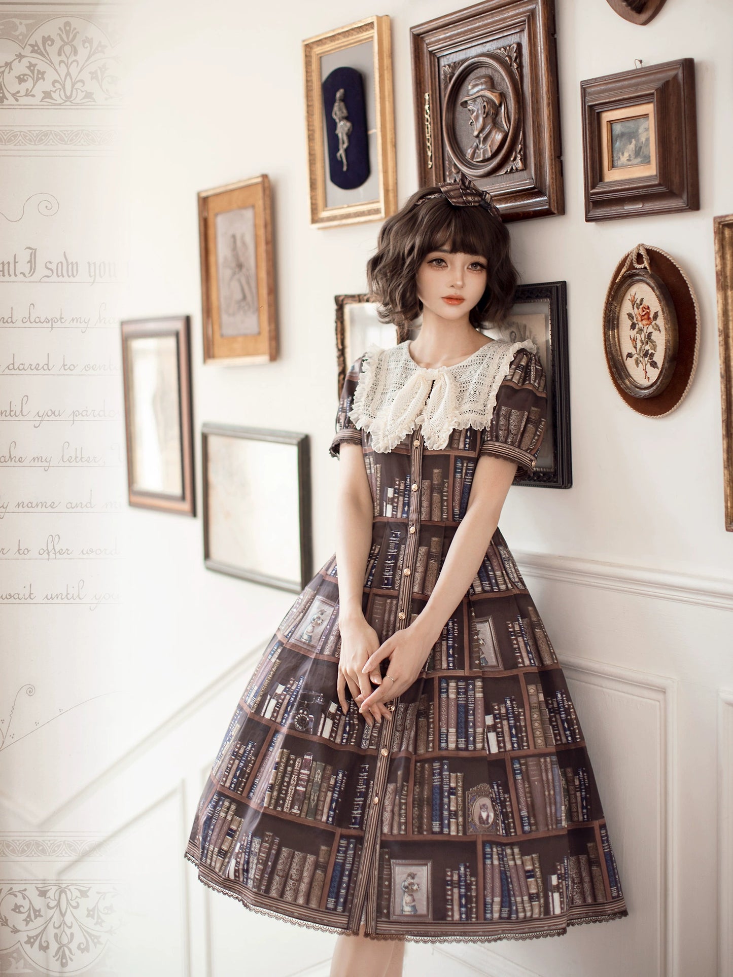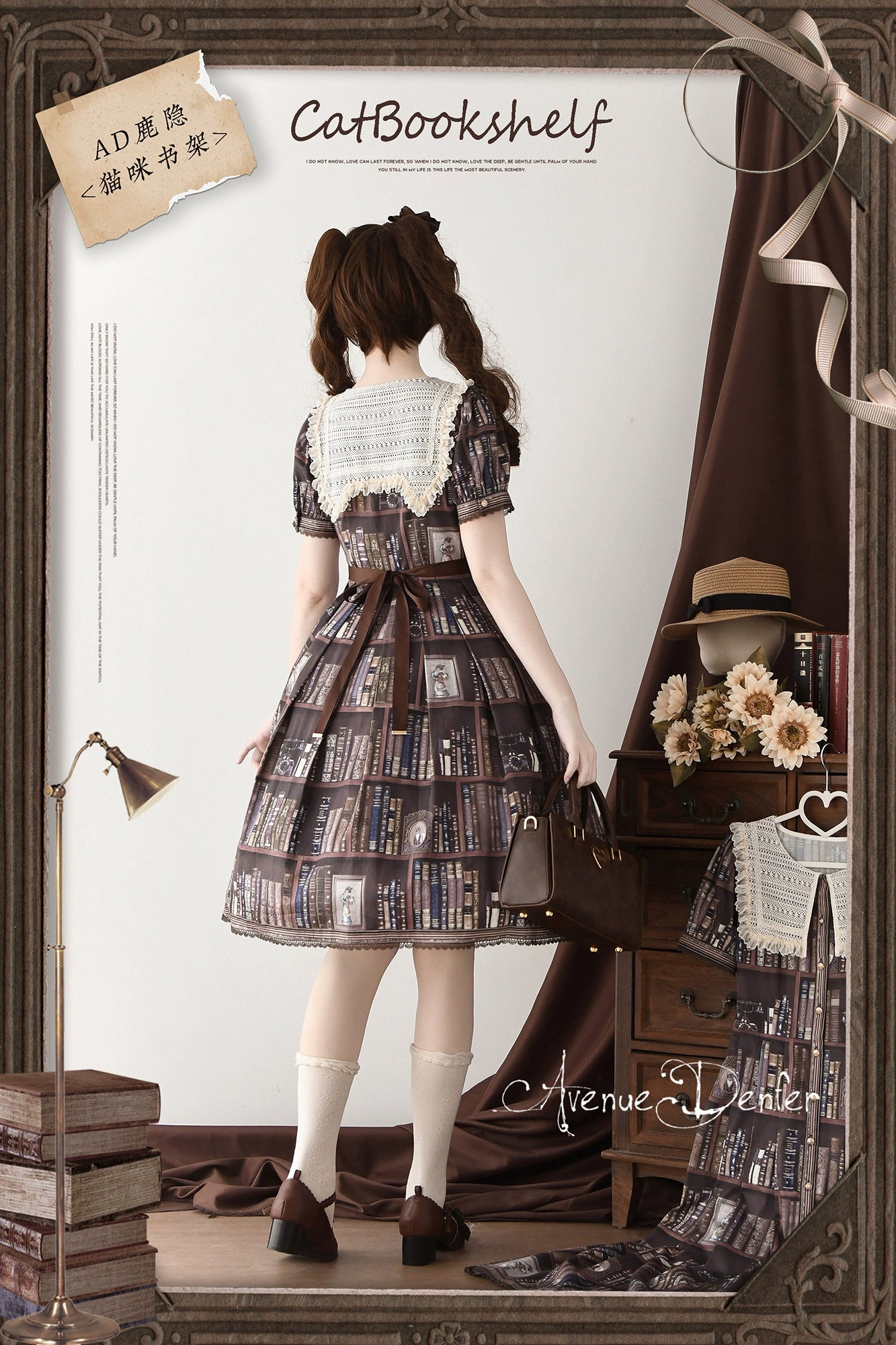 こげ茶色の本棚の中にはいっぱいの本と子猫のフォトフレームが。襟元のレースで可愛らしさををプラスしたクラシカルなワンピースです。