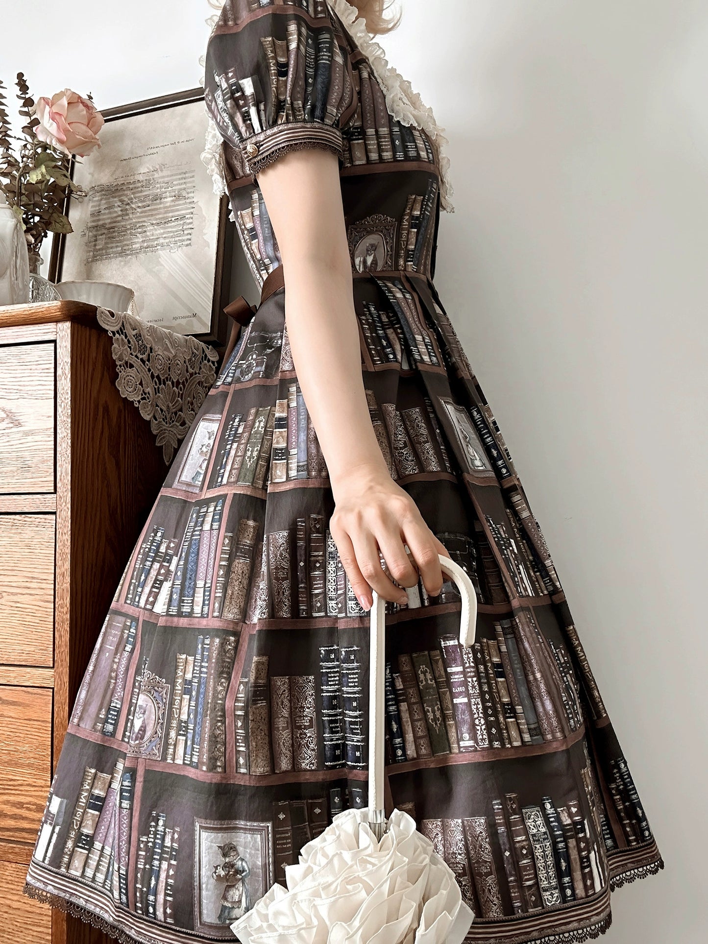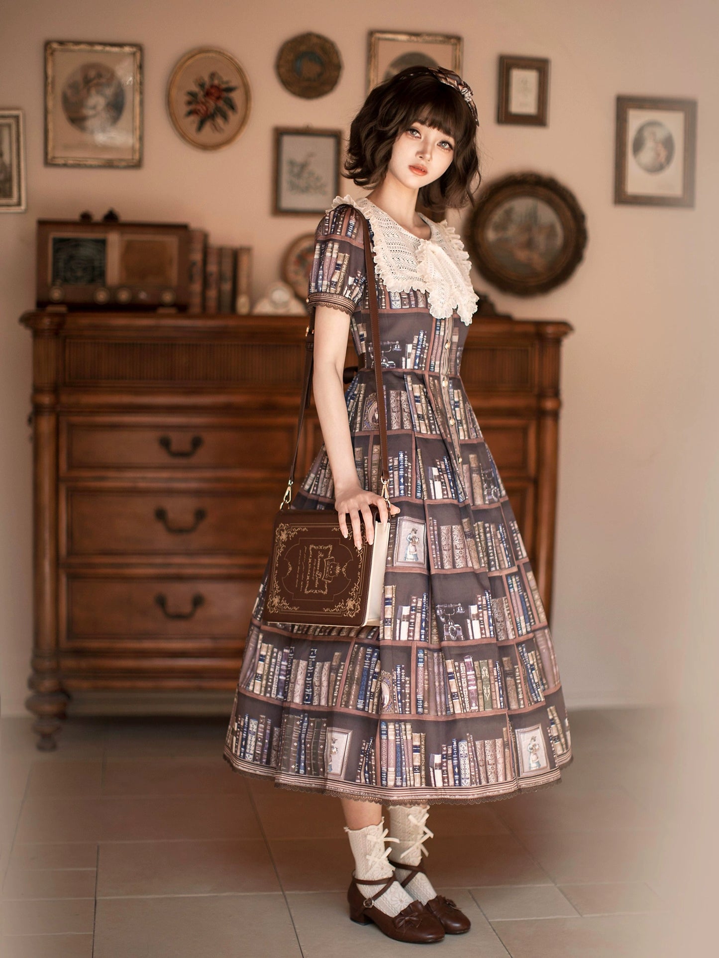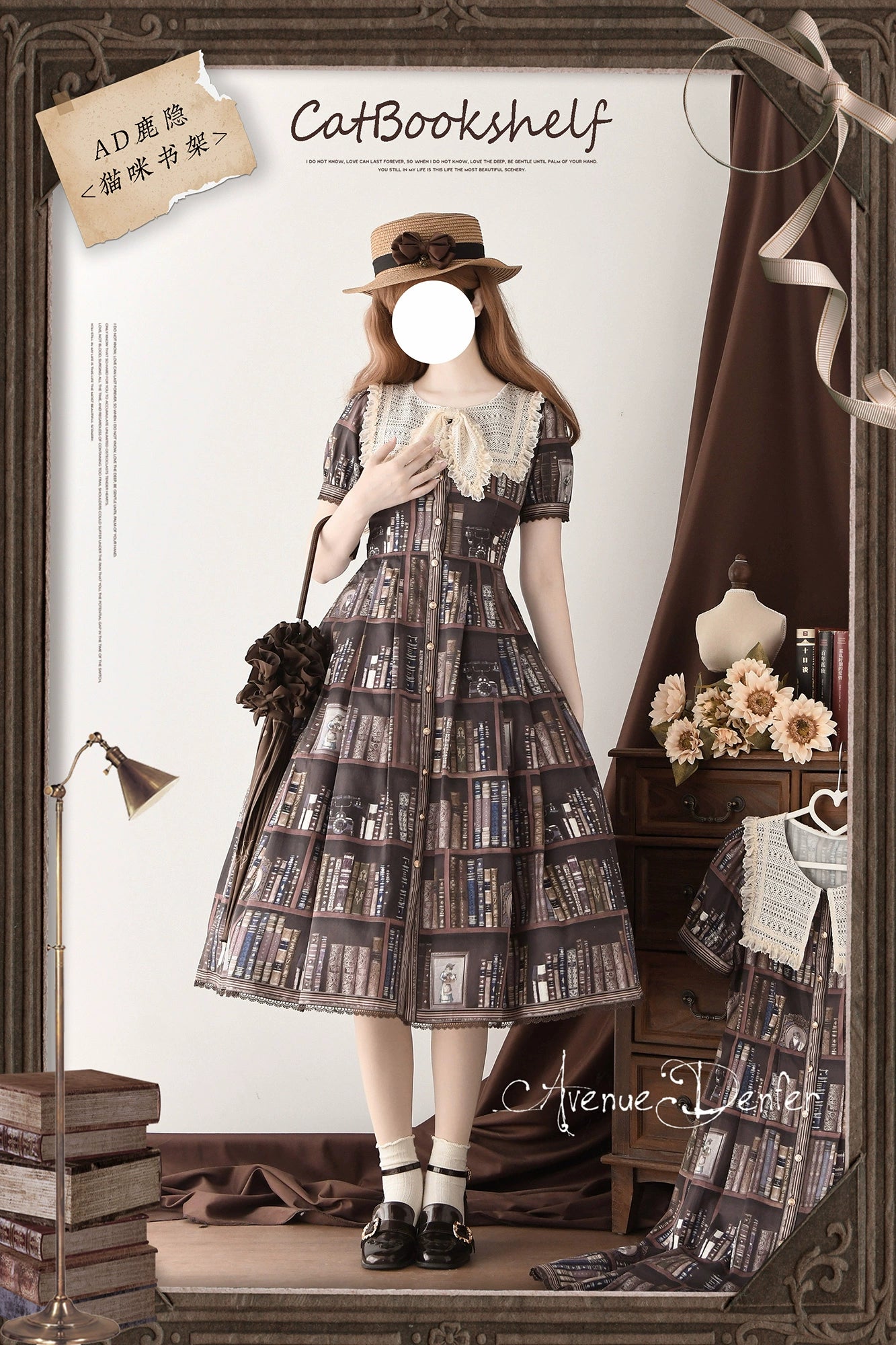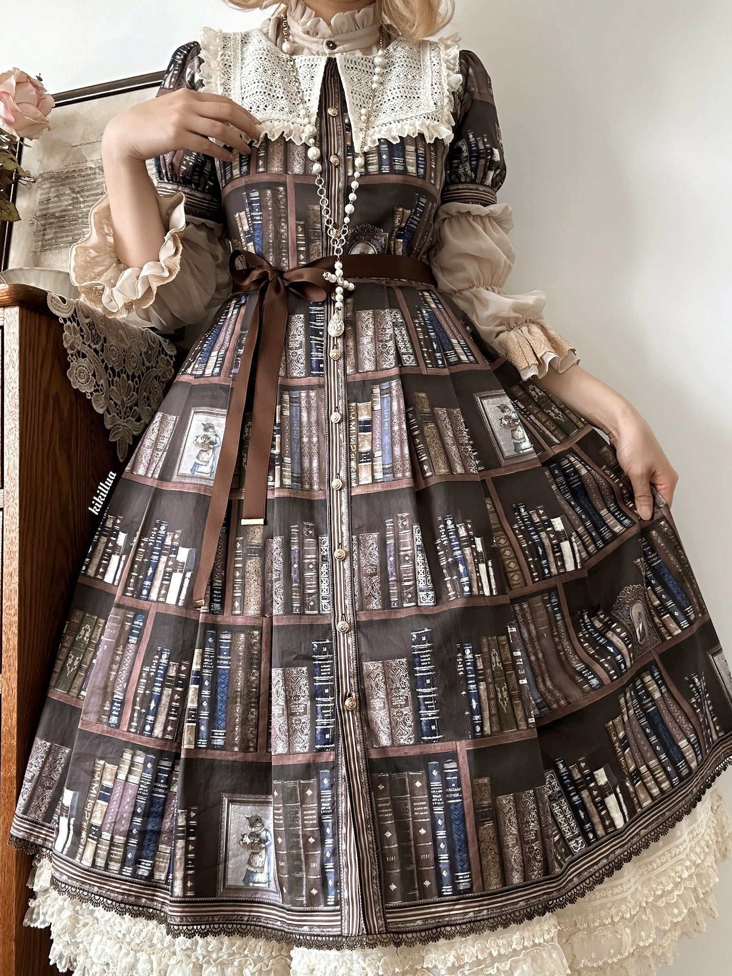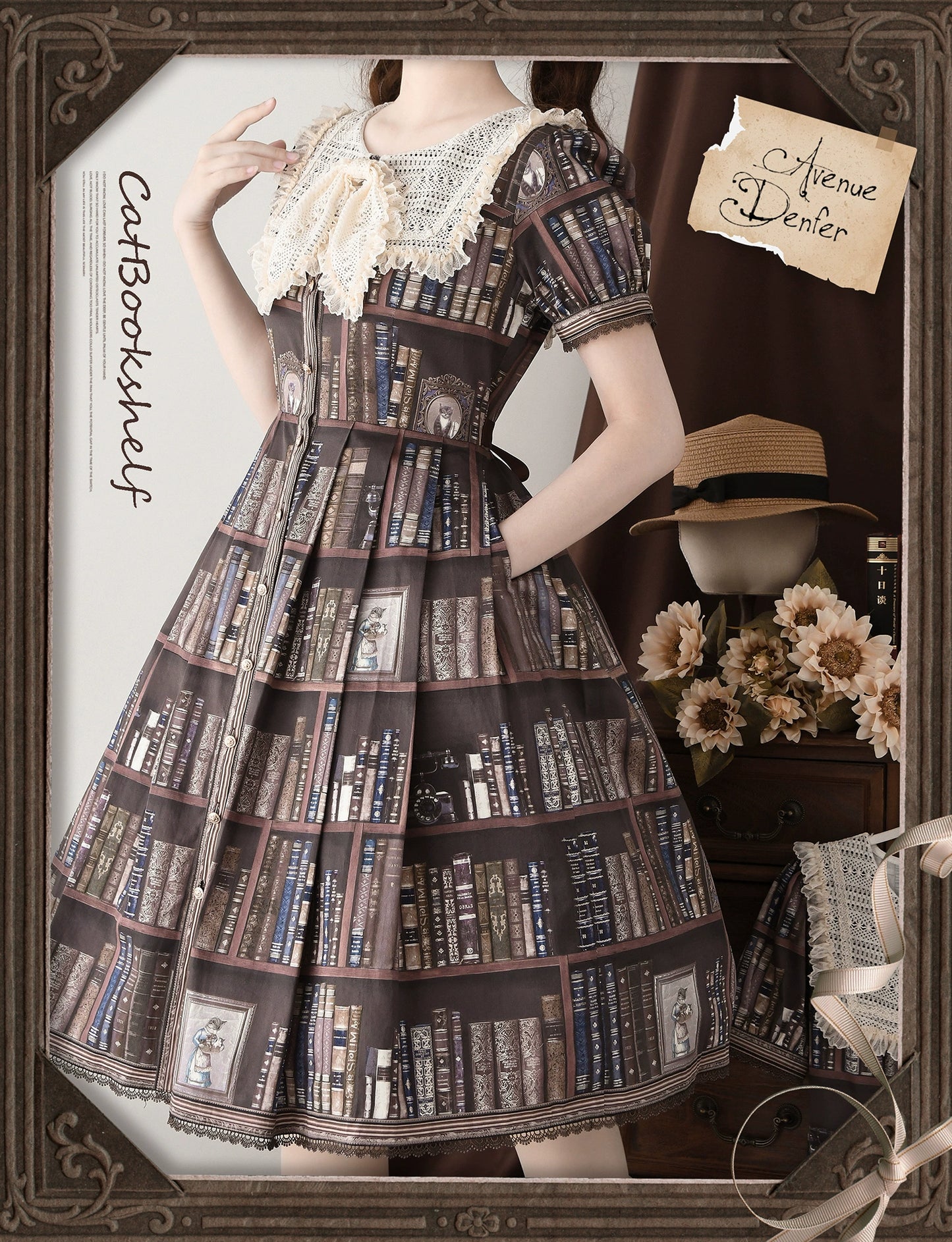 こげ茶色の本棚の中にはいっぱいの本と子猫のフォトフレームが。襟元のレースで可愛らしさををプラスしたクラシカルなワンピースです。