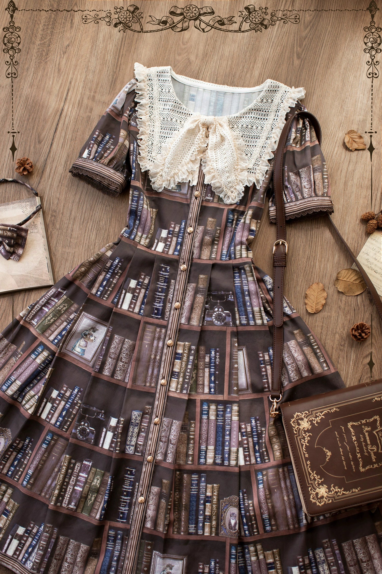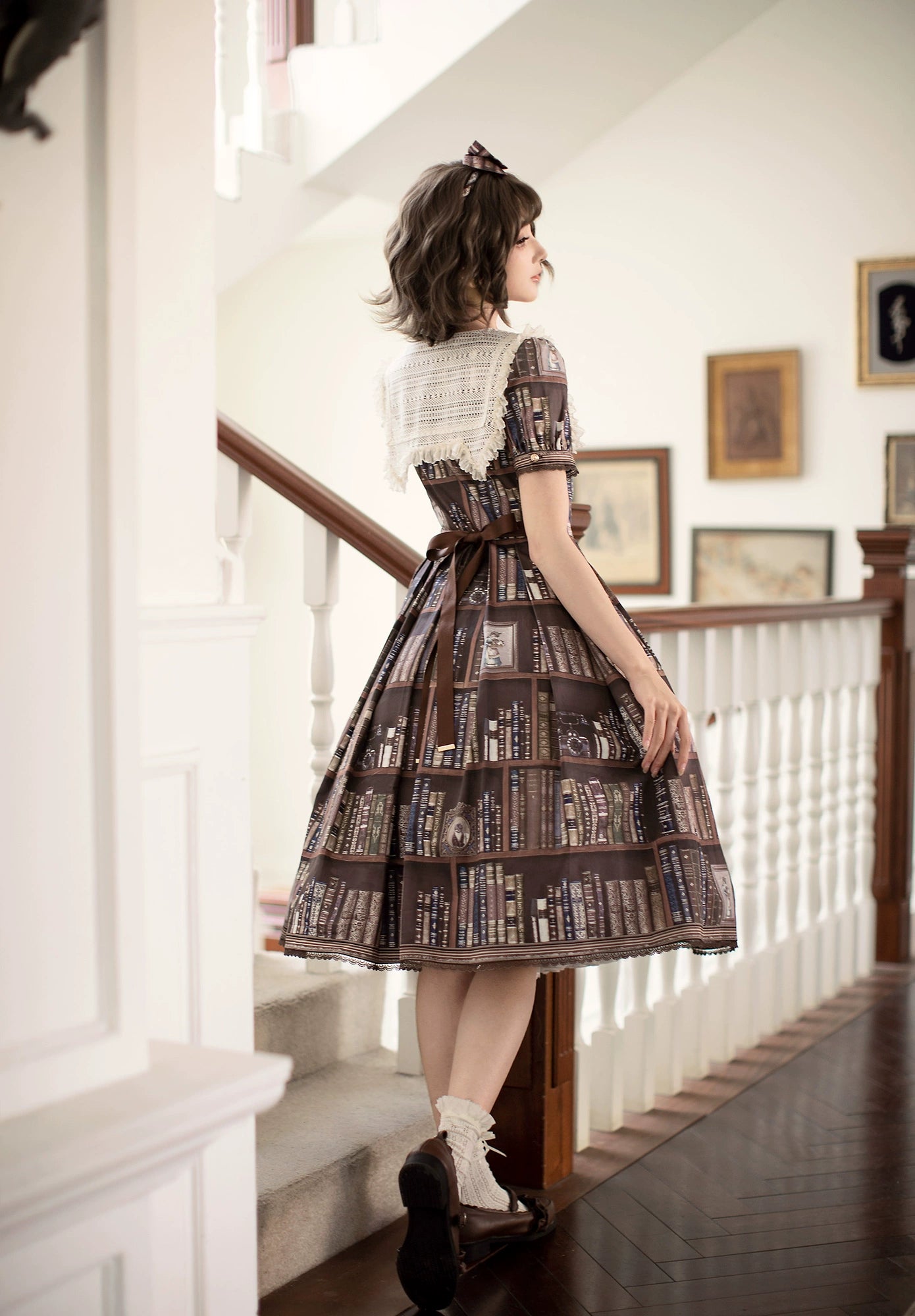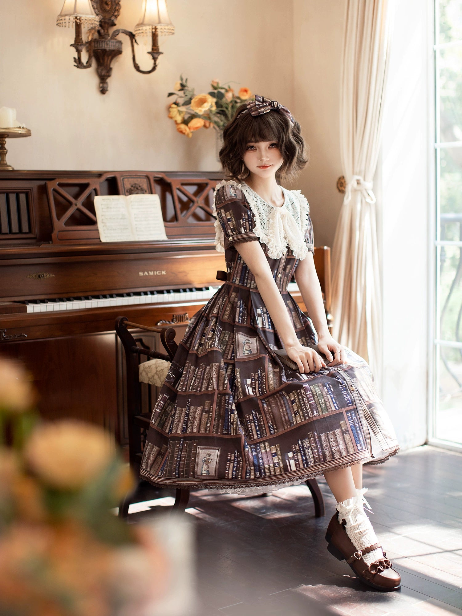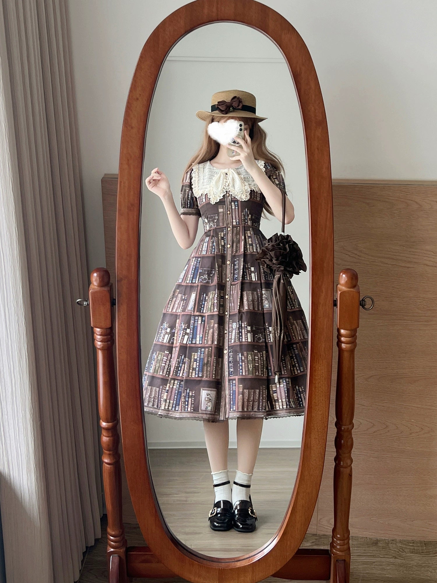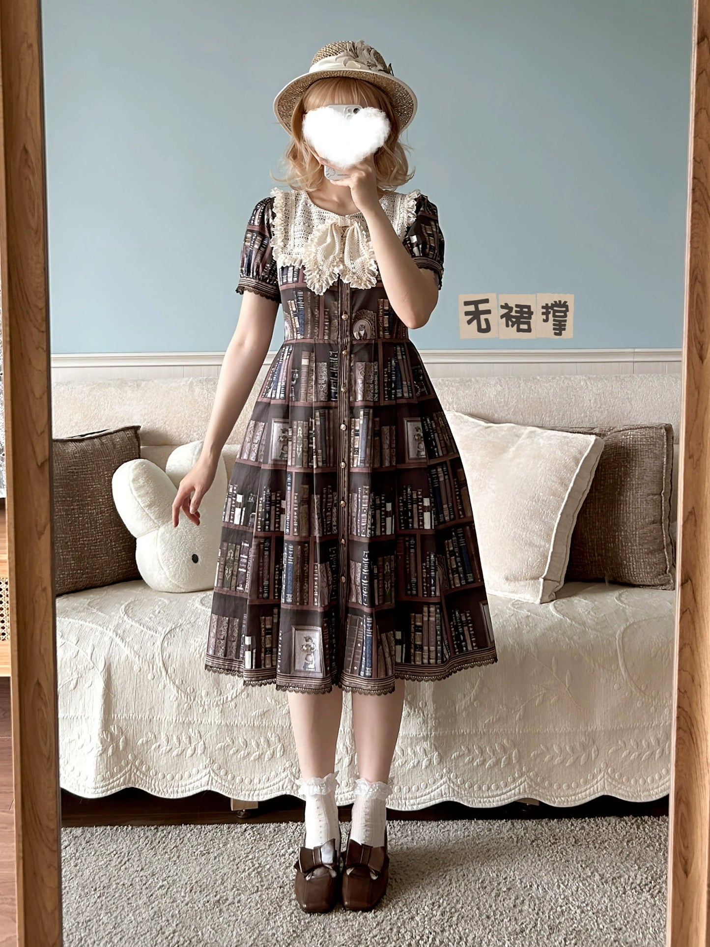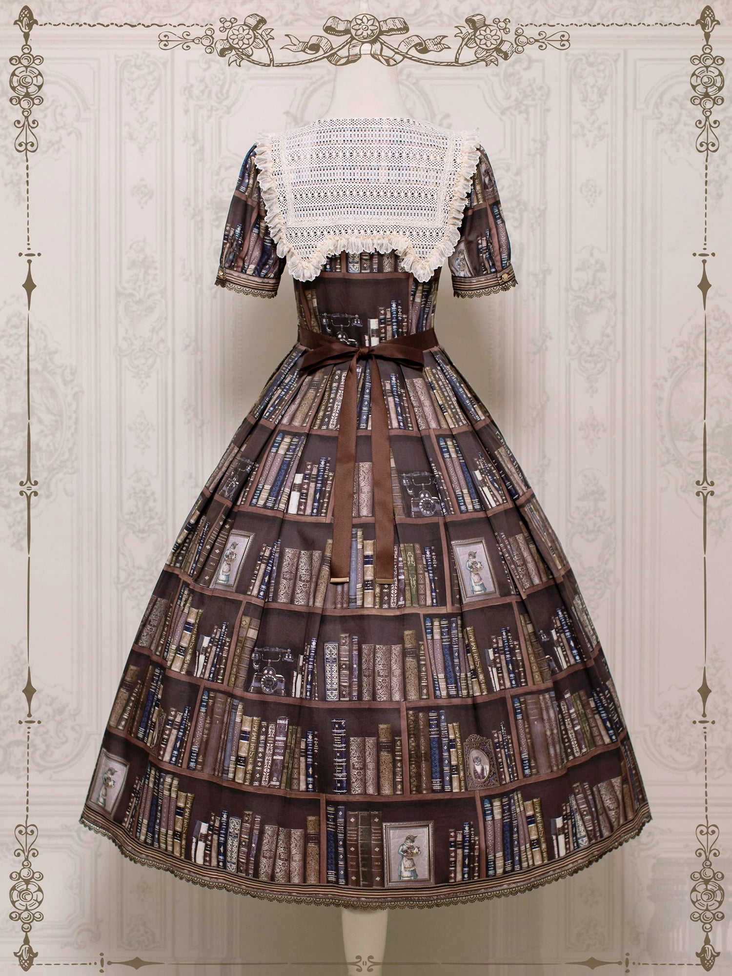 こげ茶色の本棚の中にはいっぱいの本と子猫のフォトフレームが。襟元のレースで可愛らしさををプラスしたクラシカルなワンピースです。
