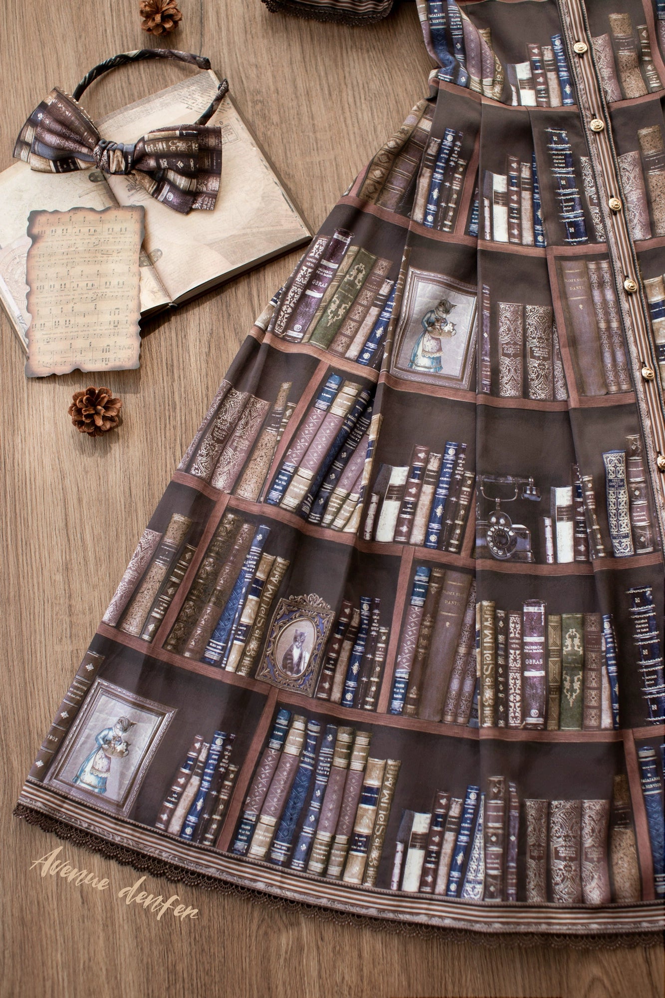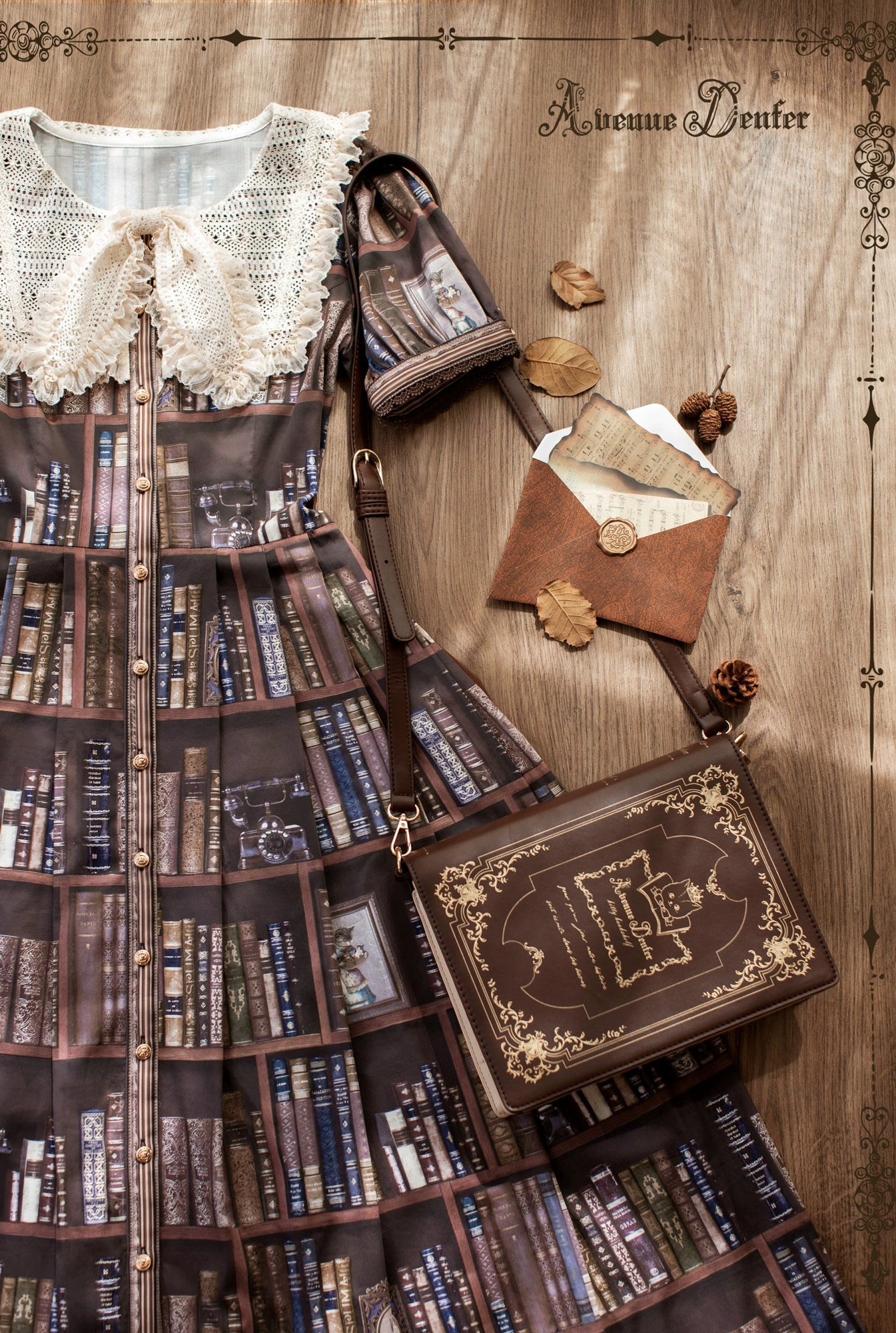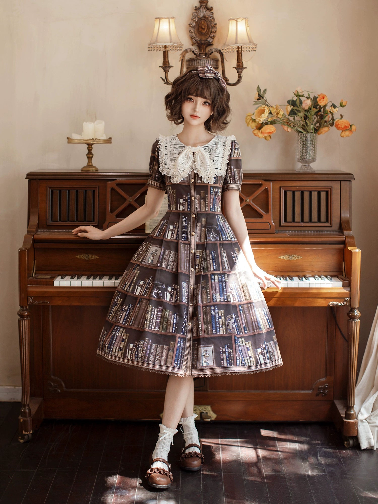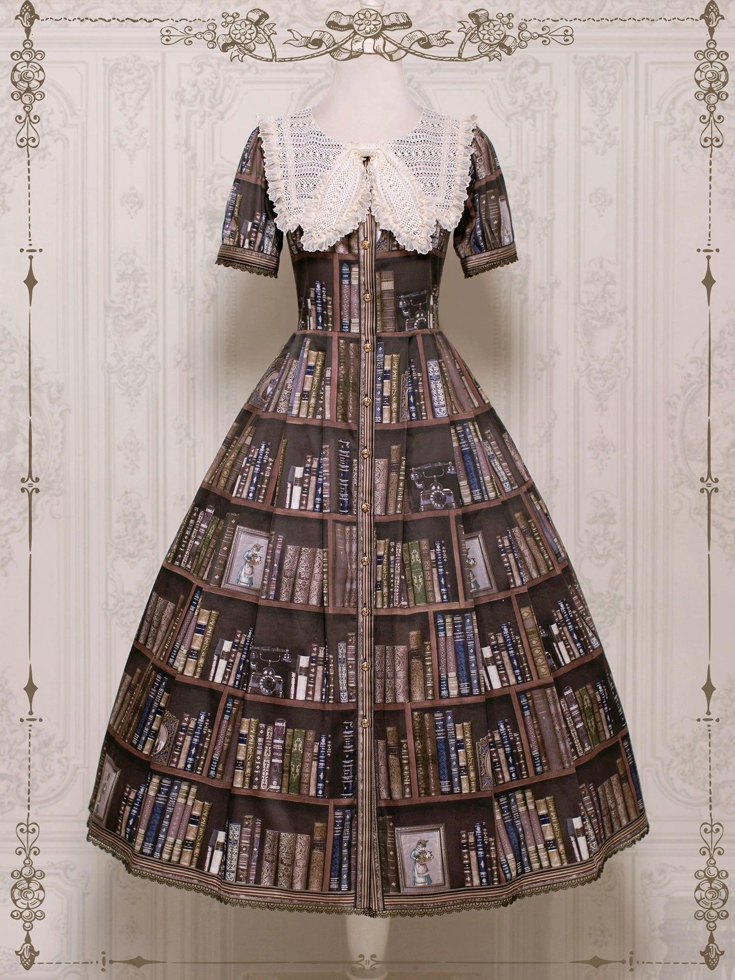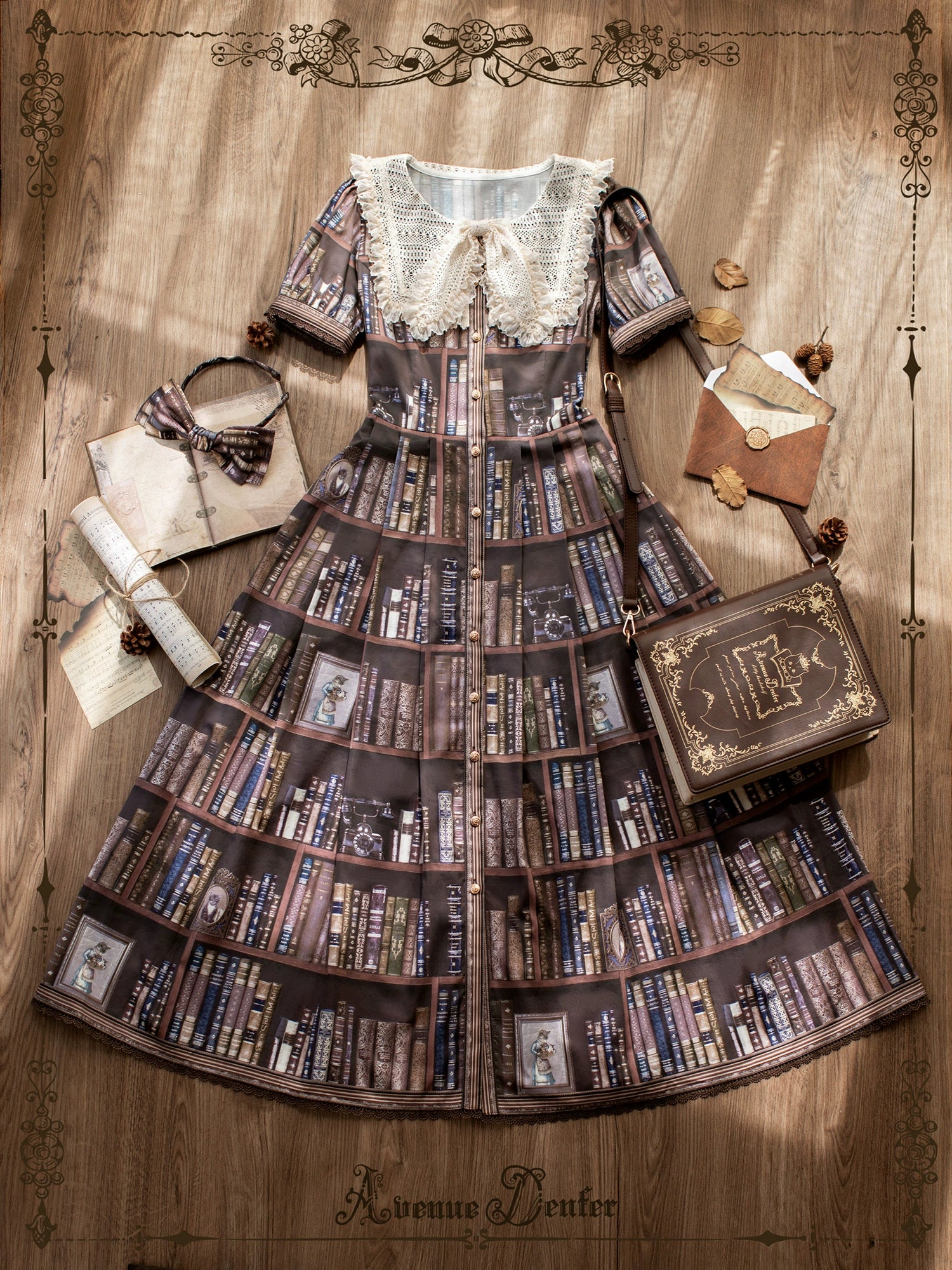 こげ茶色の本棚の中にはいっぱいの本と子猫のフォトフレームが。襟元のレースで可愛らしさををプラスしたクラシカルなワンピースです。
