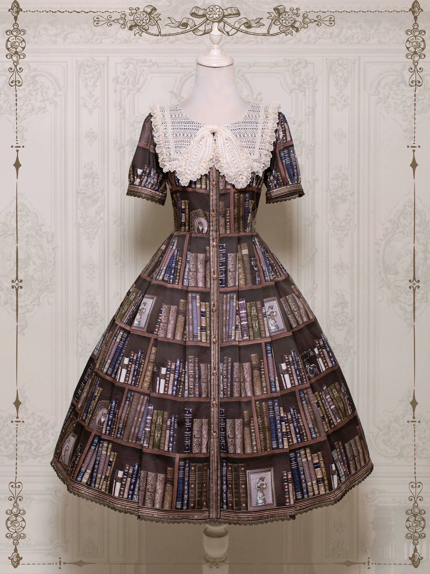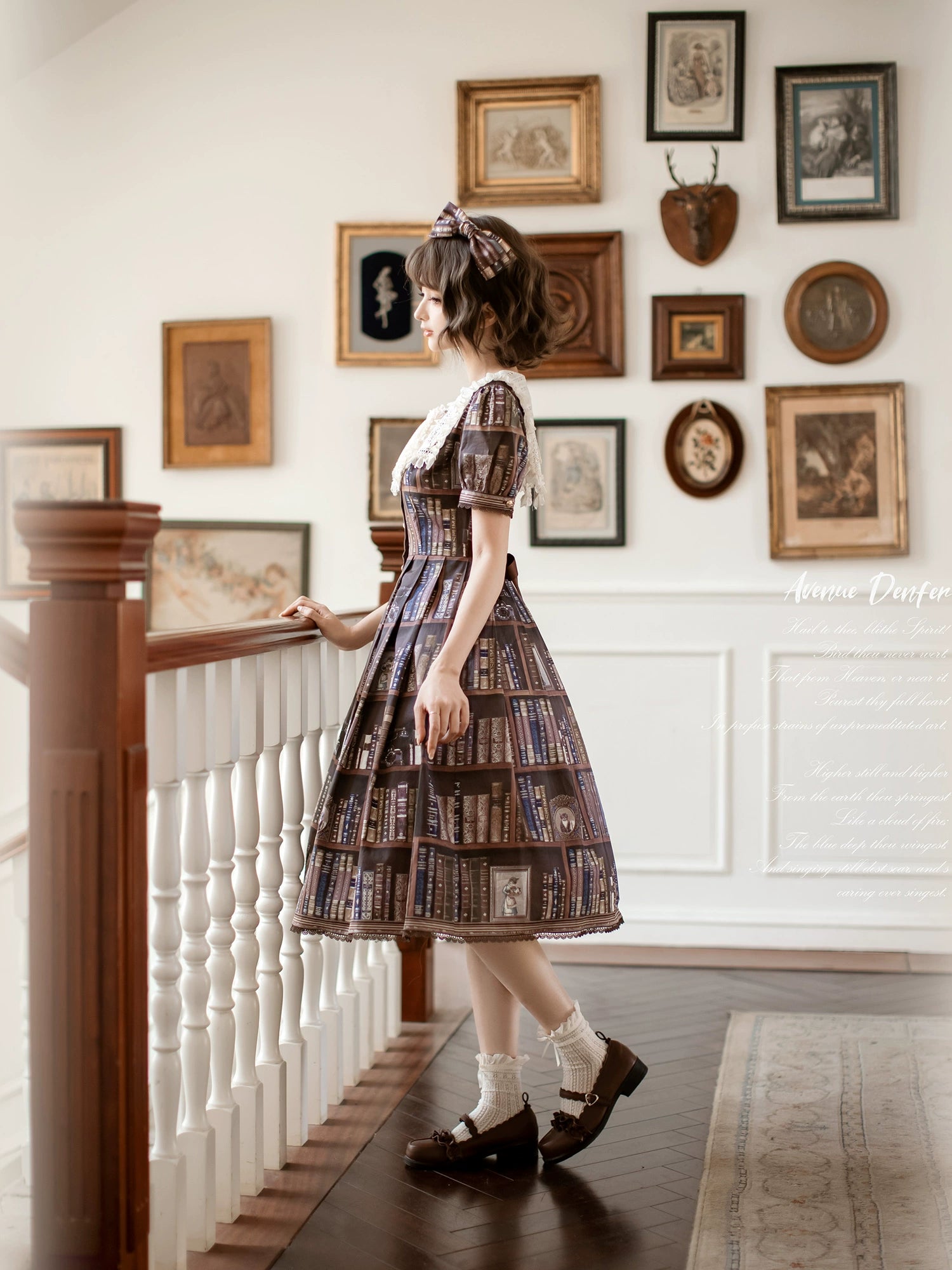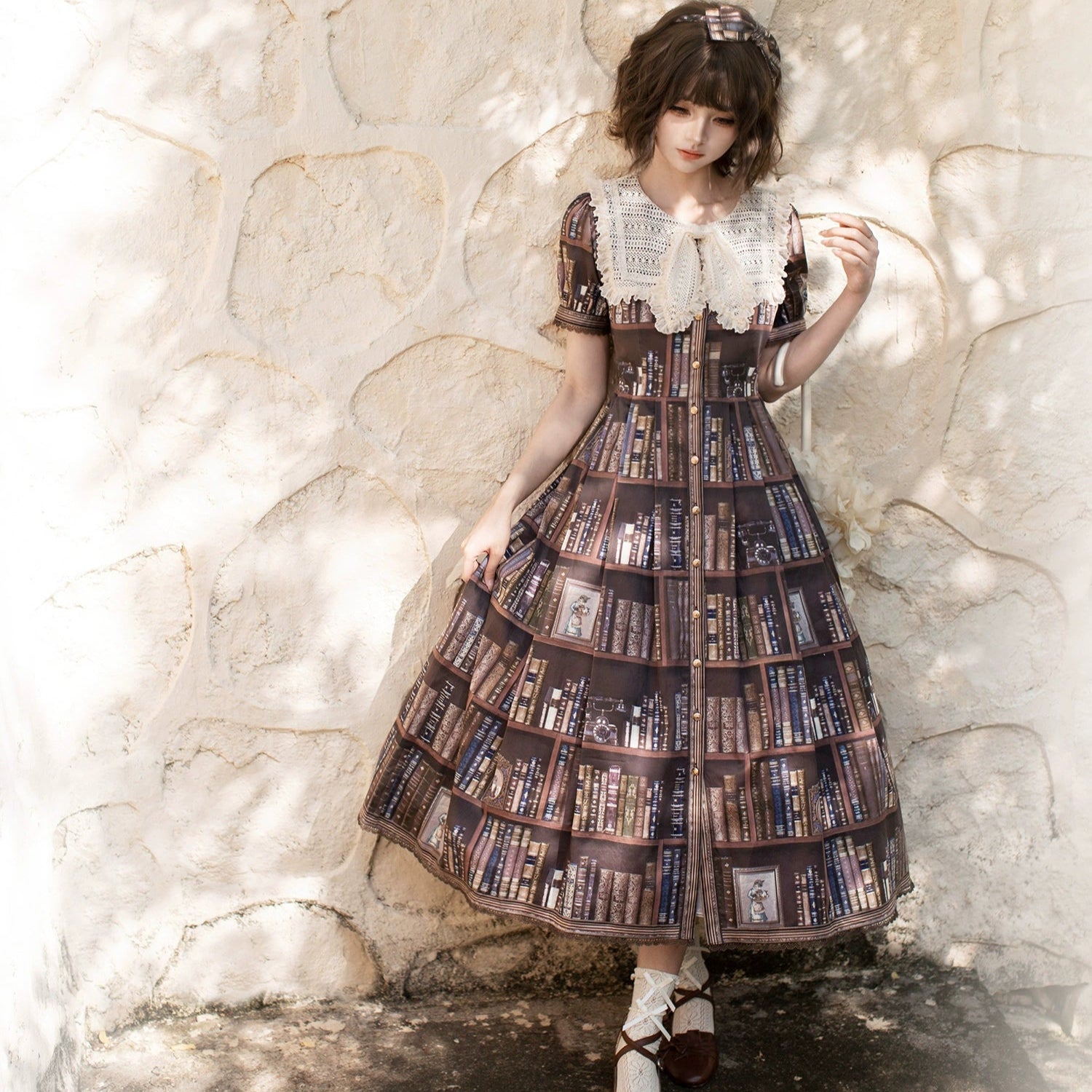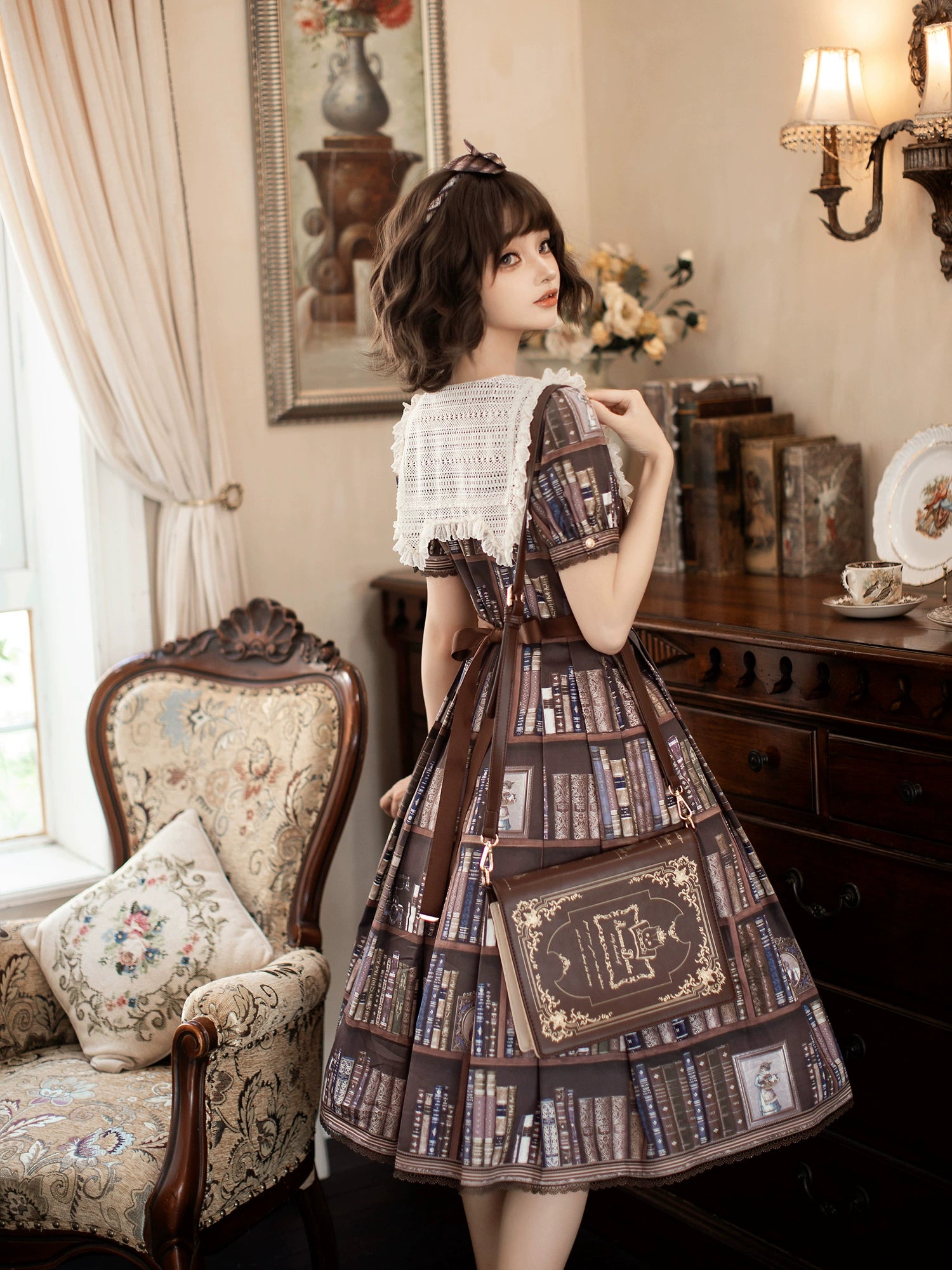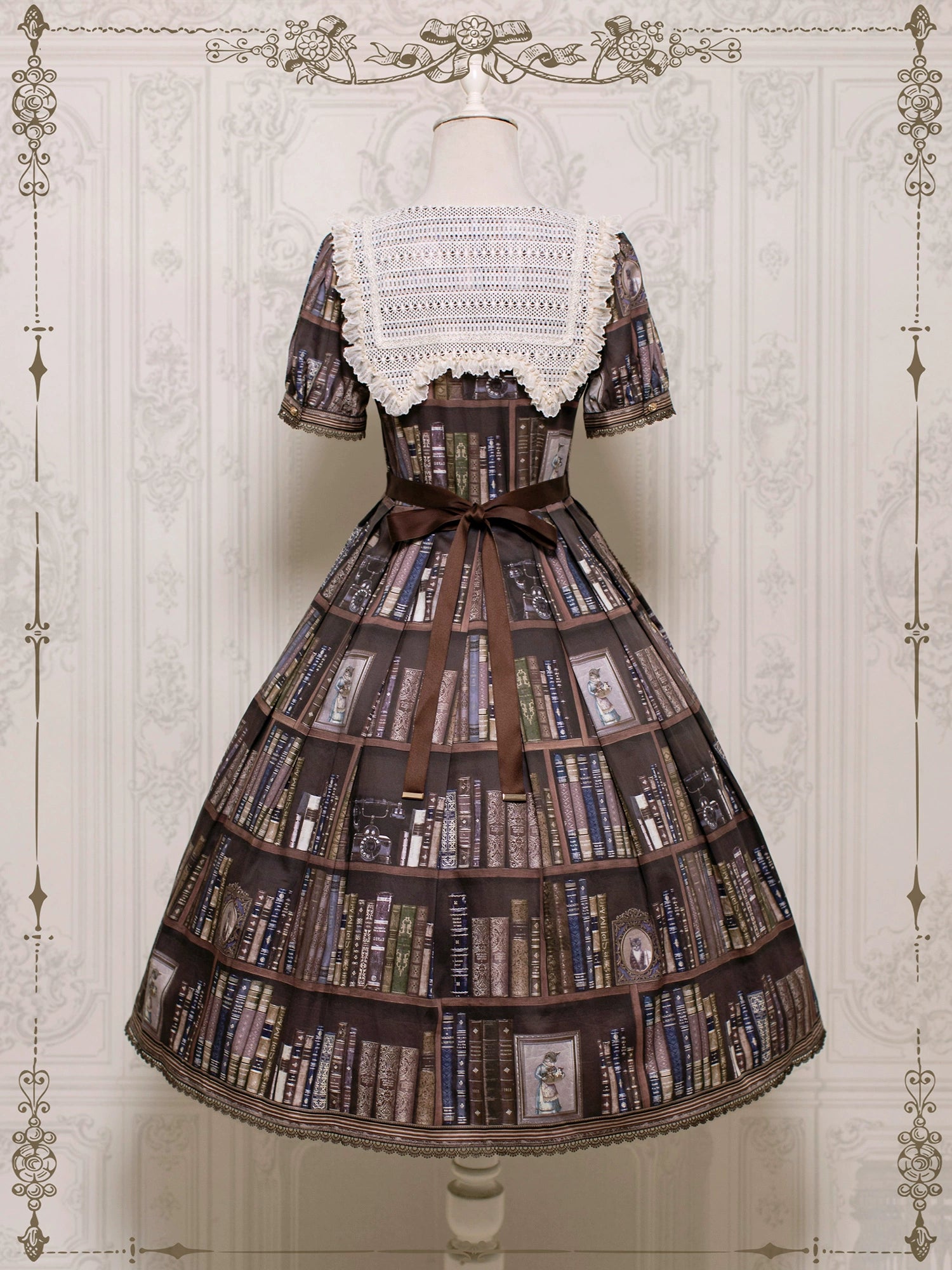 こげ茶色の本棚の中にはいっぱいの本と子猫のフォトフレームが。襟元のレースで可愛らしさををプラスしたクラシカルなワンピースです。