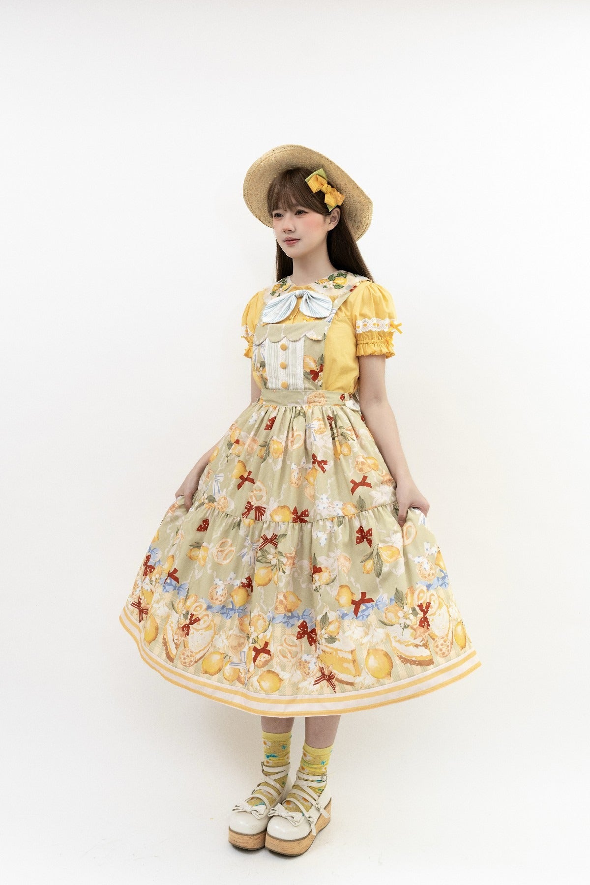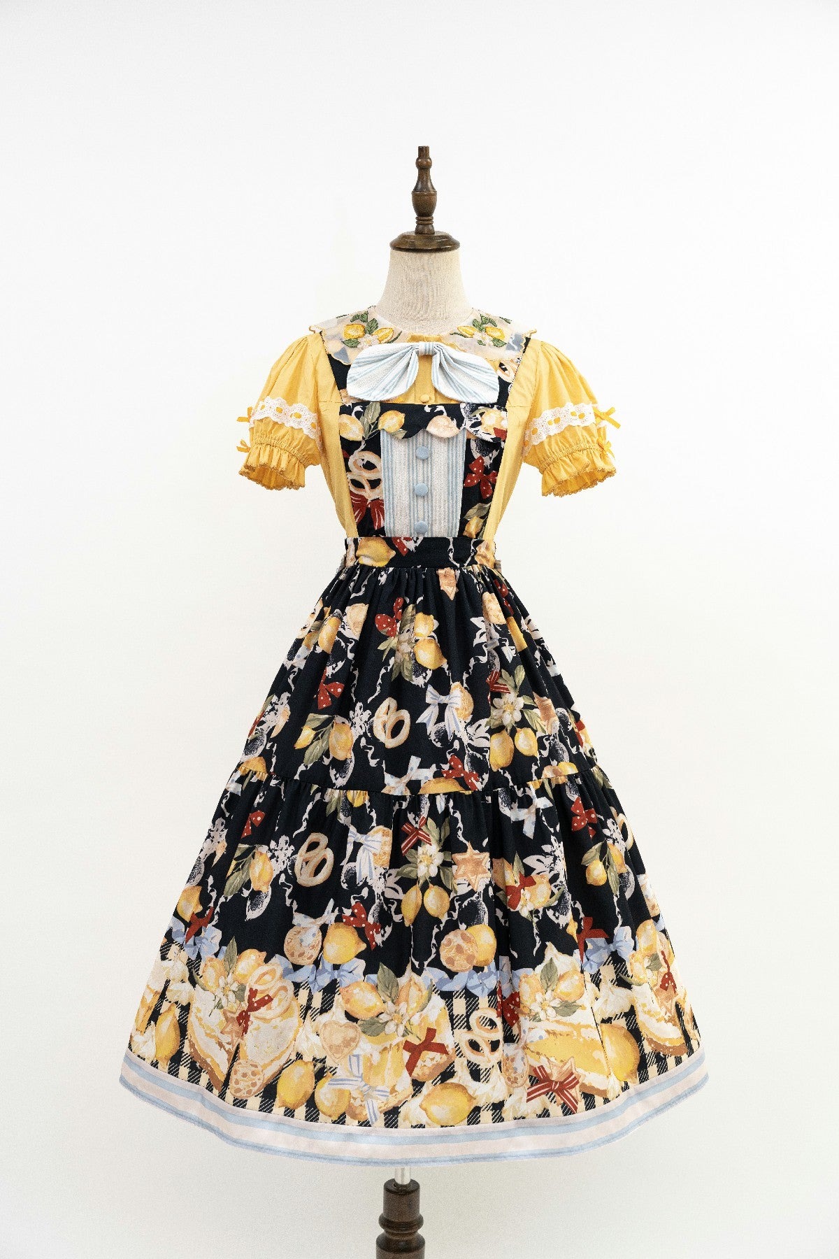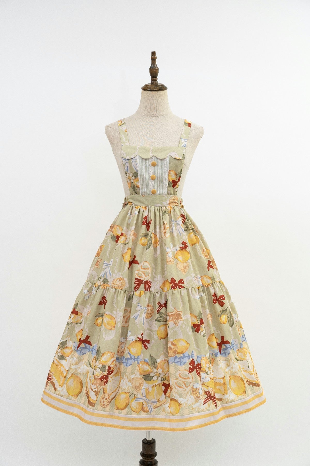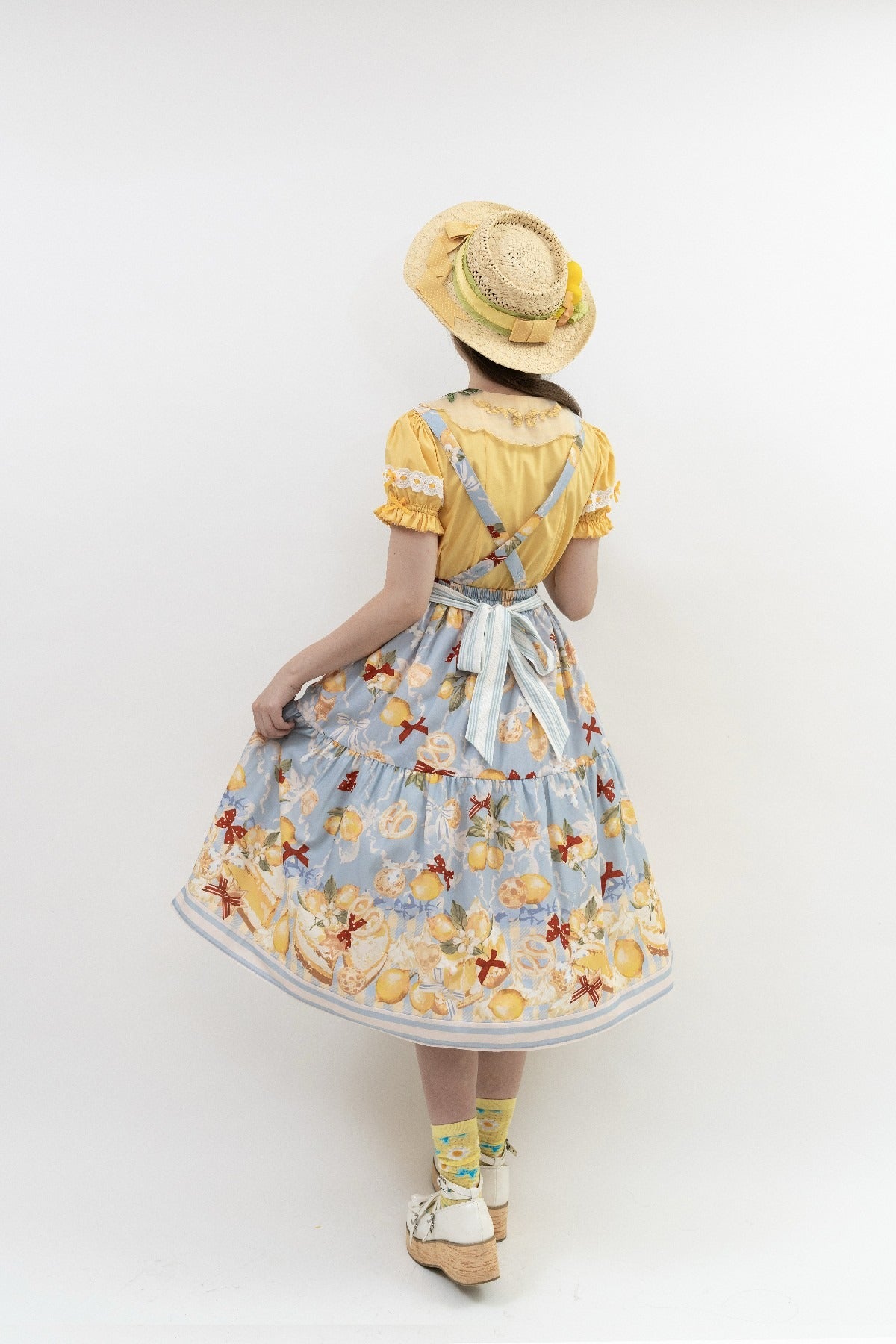 レモンとスイーツのプリントに、イエローのリボンが可愛いサスペンダースカート。
