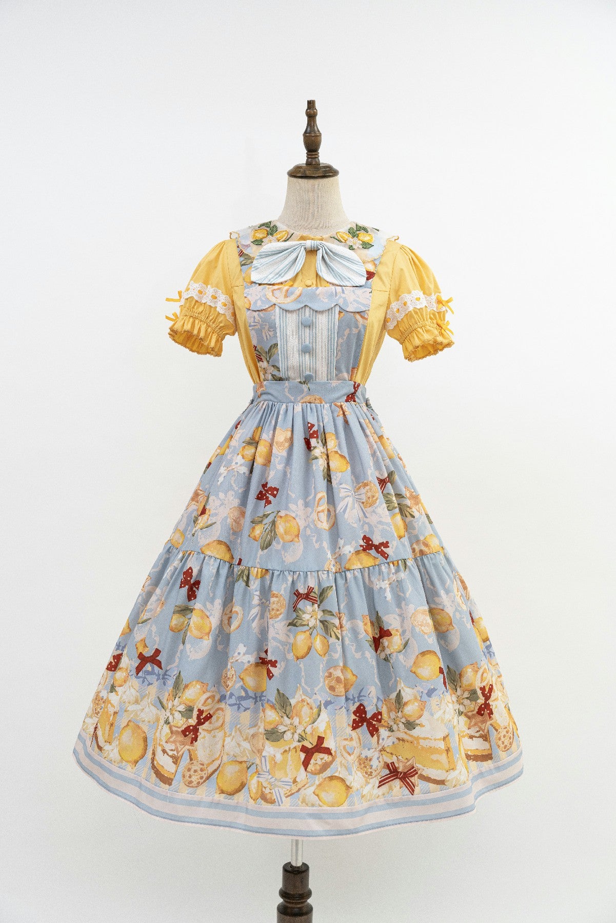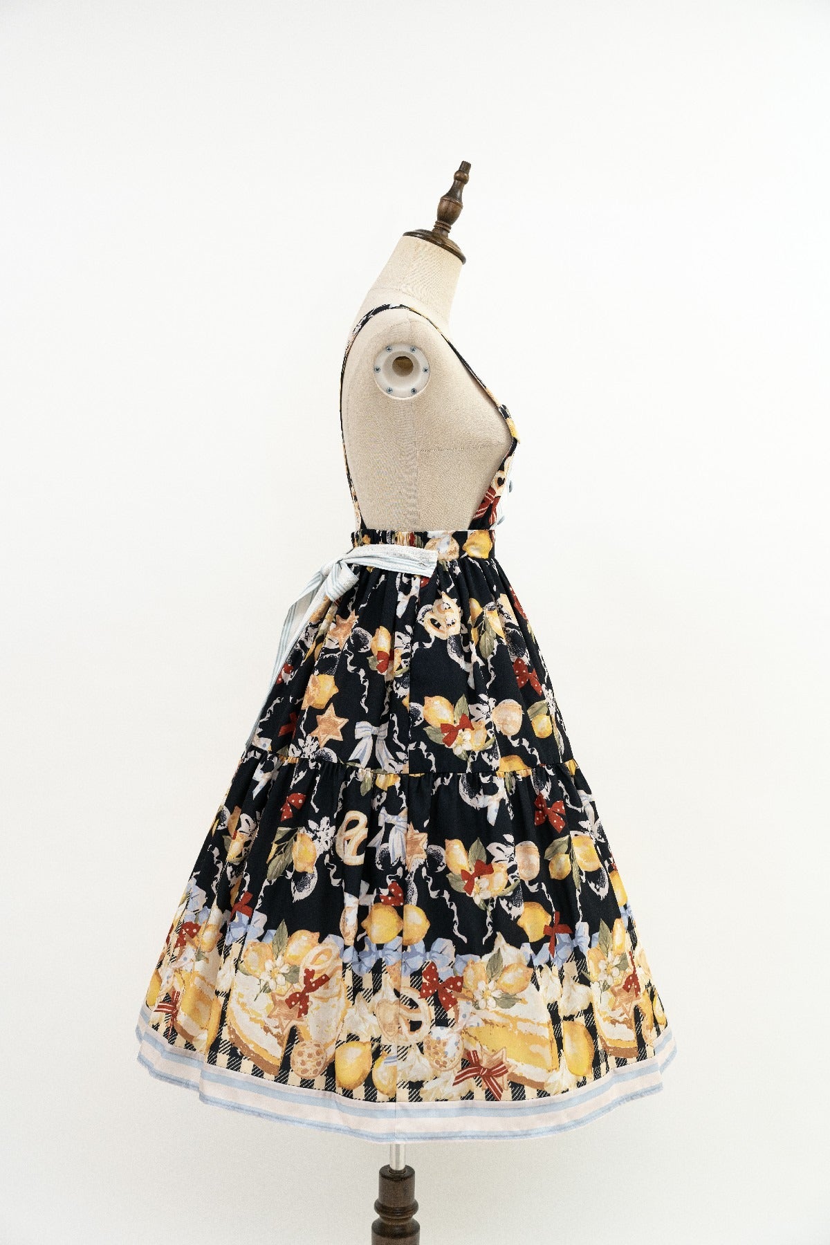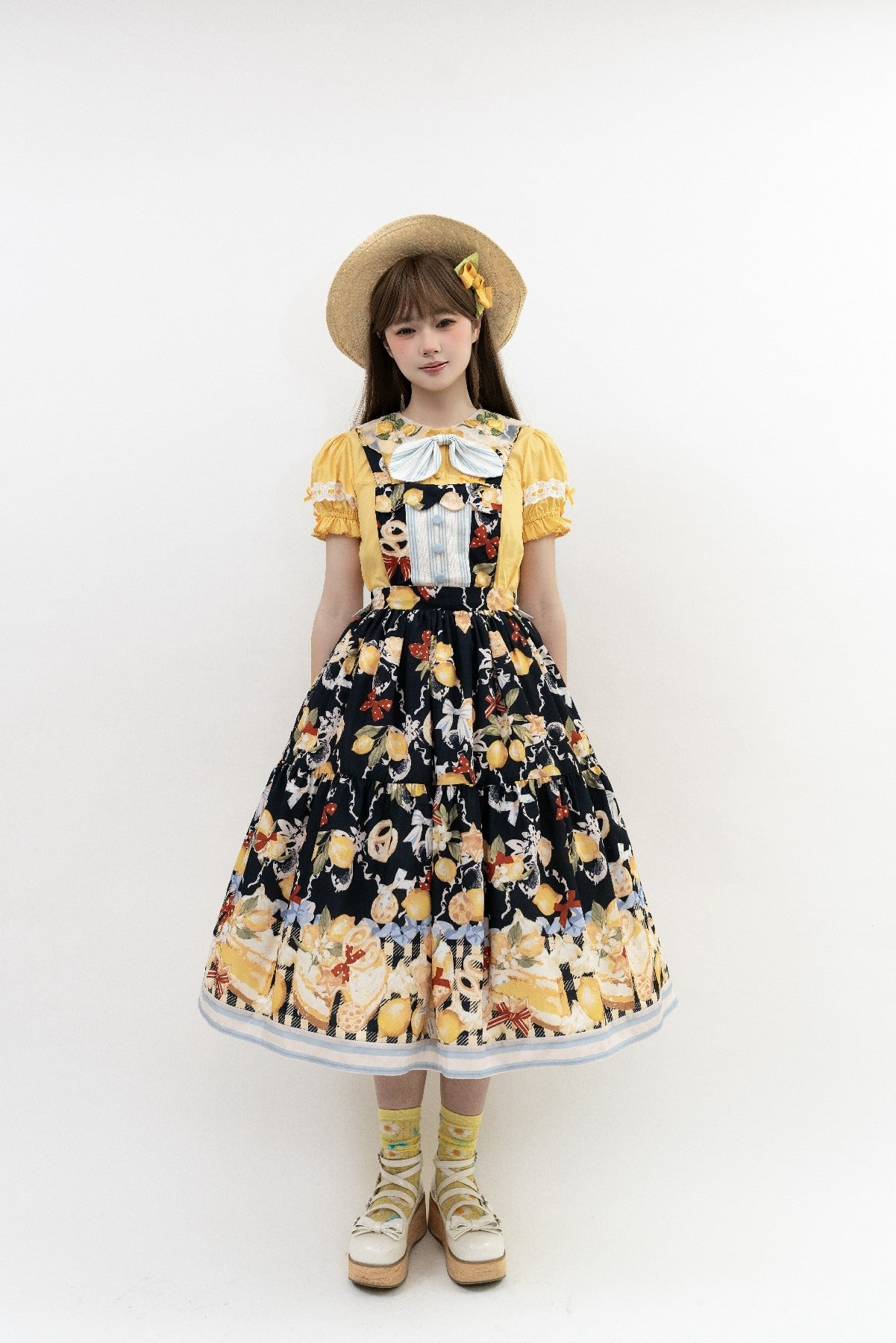 レモンとスイーツのプリントに、イエローのリボンが可愛いサスペンダースカート。