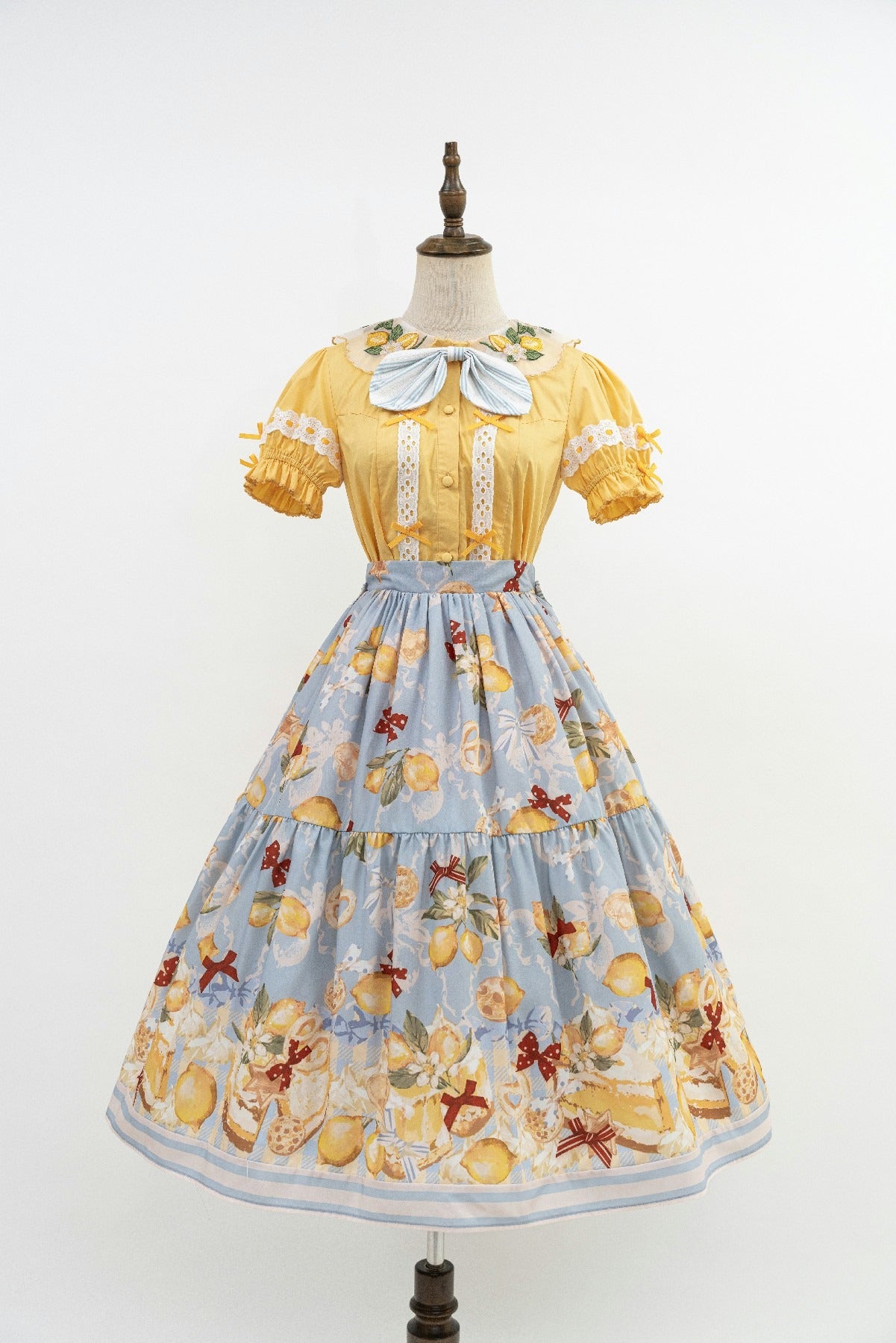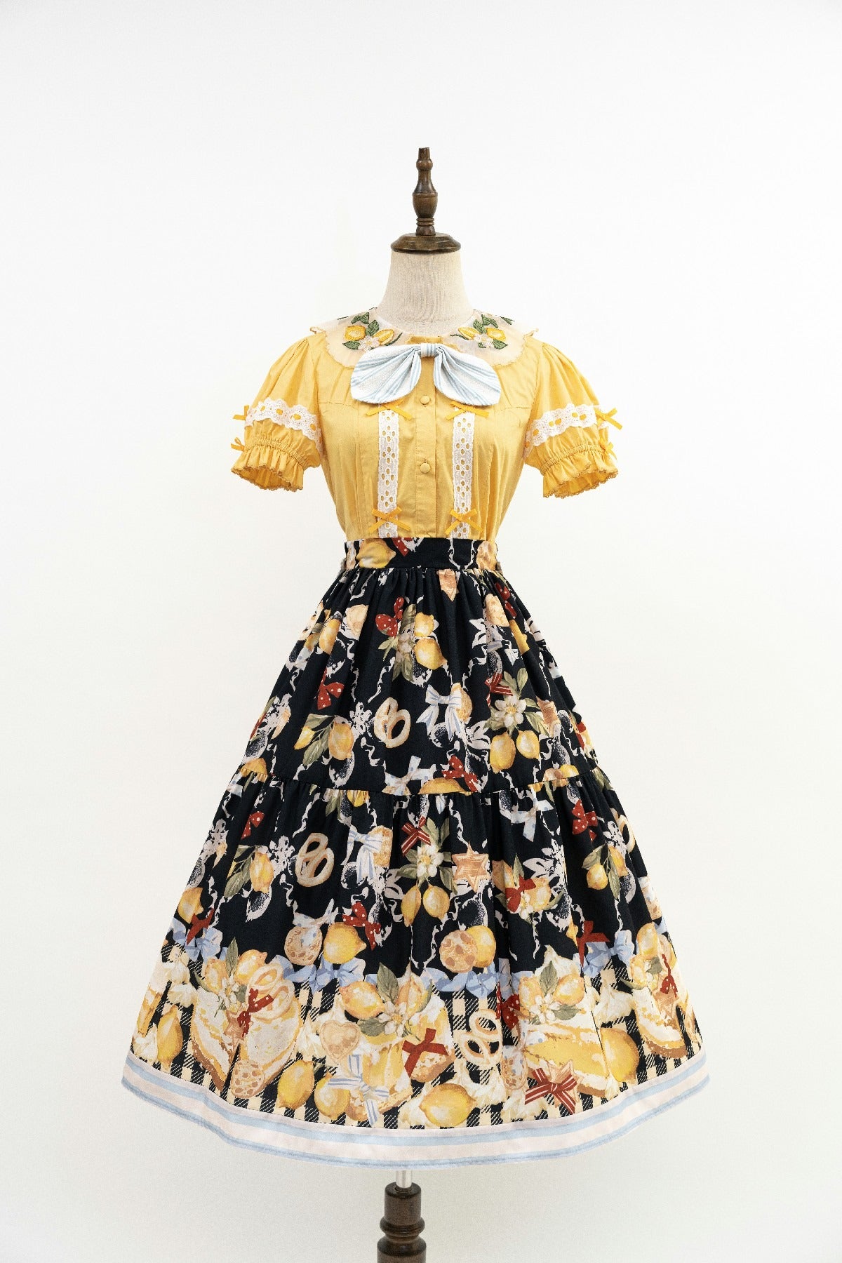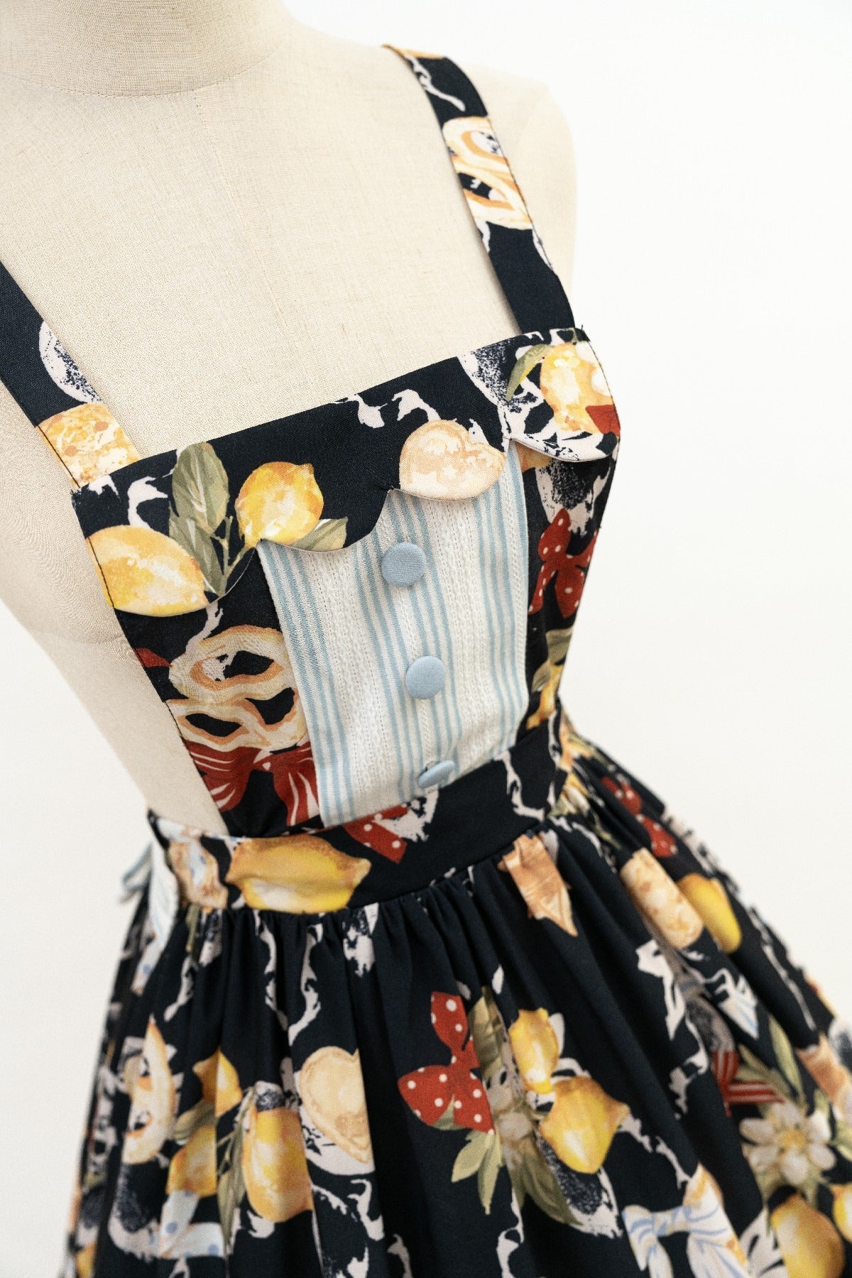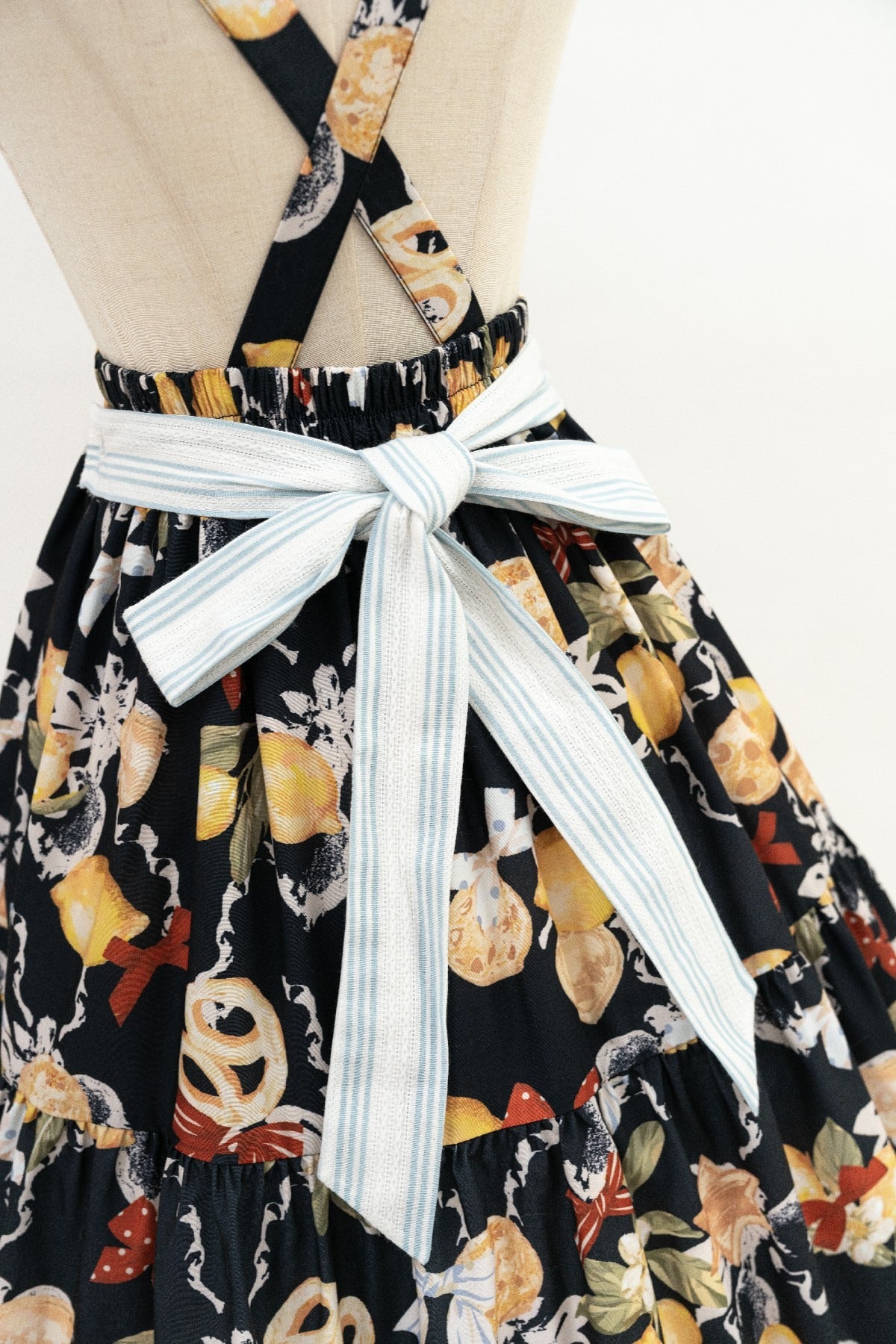 レモンとスイーツのプリントに、イエローのリボンが可愛いサスペンダースカート。