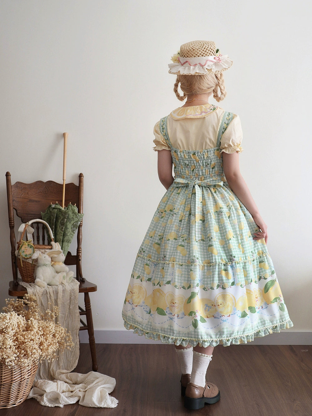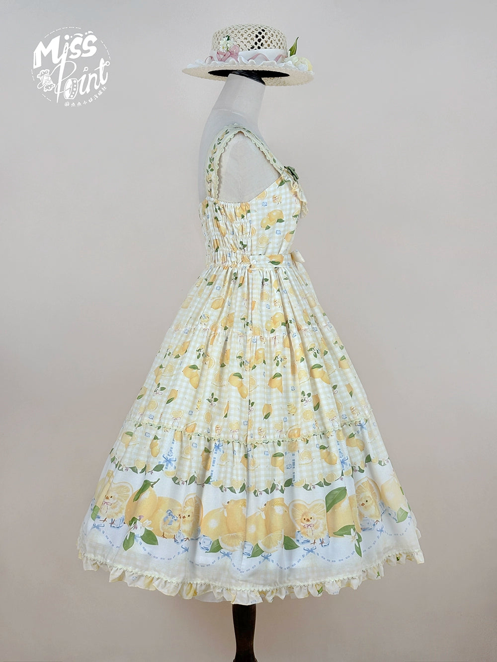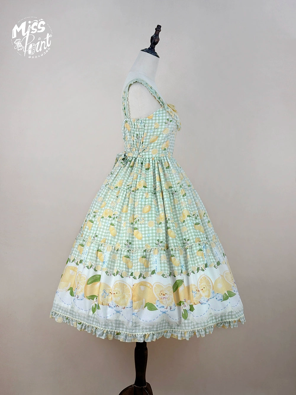 ギンガムチェックにレモンプリントがさわやかなジャンパースカート。