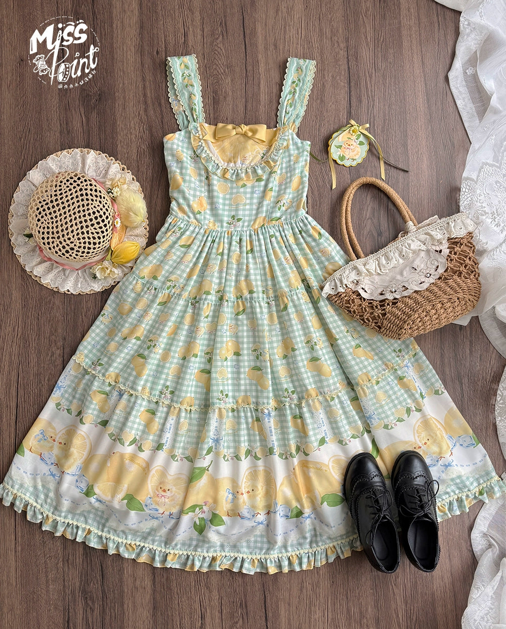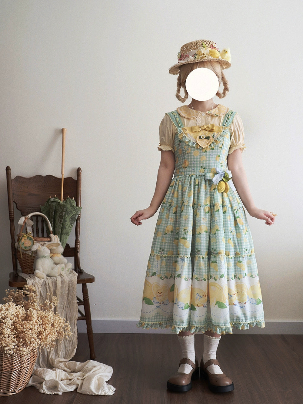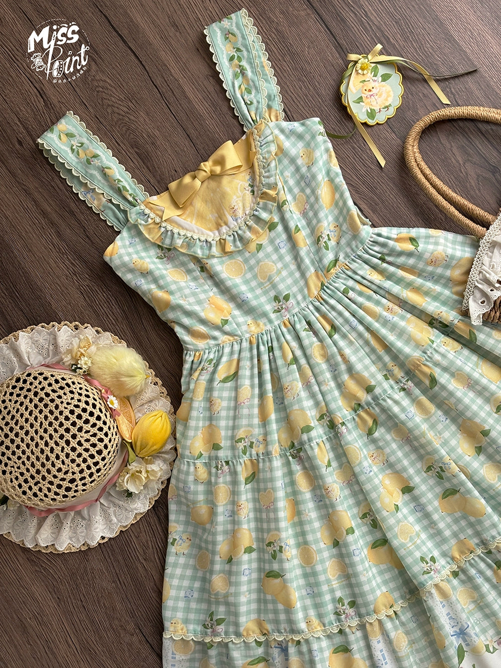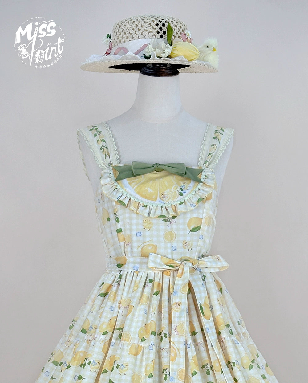 ギンガムチェックにレモンプリントがさわやかなジャンパースカート。
