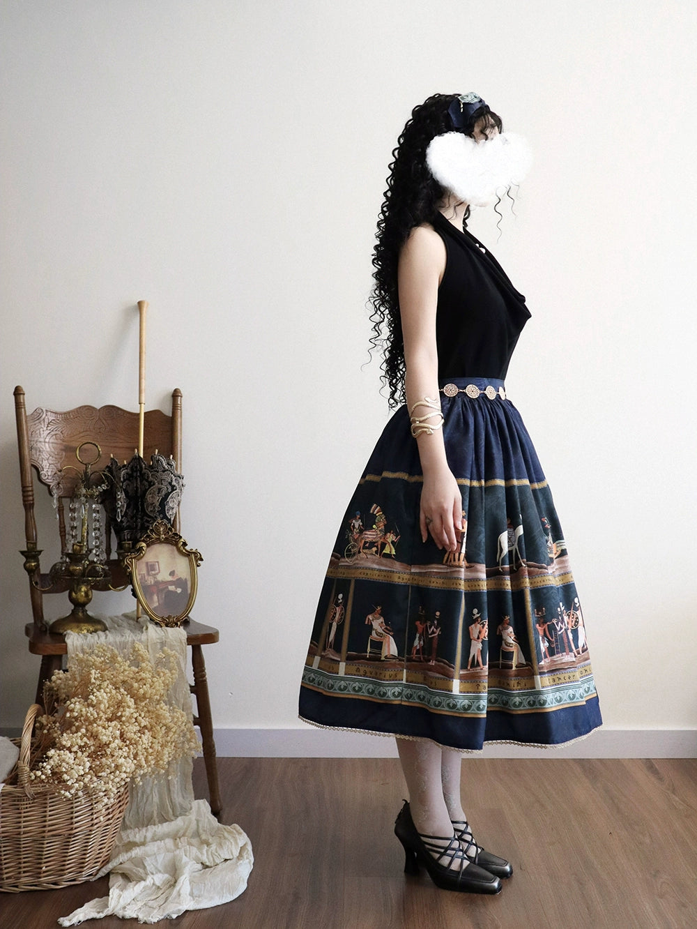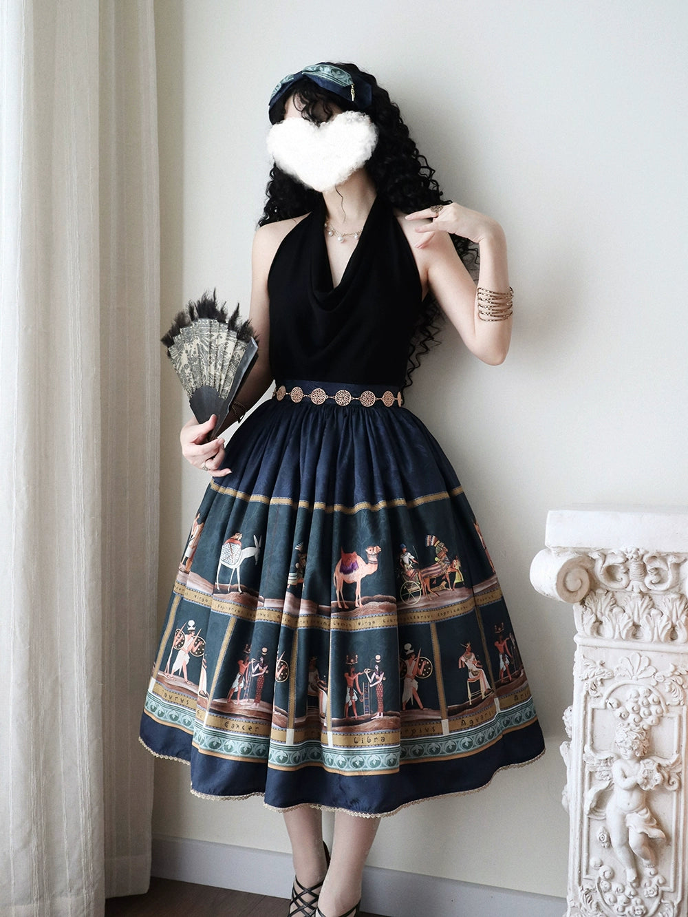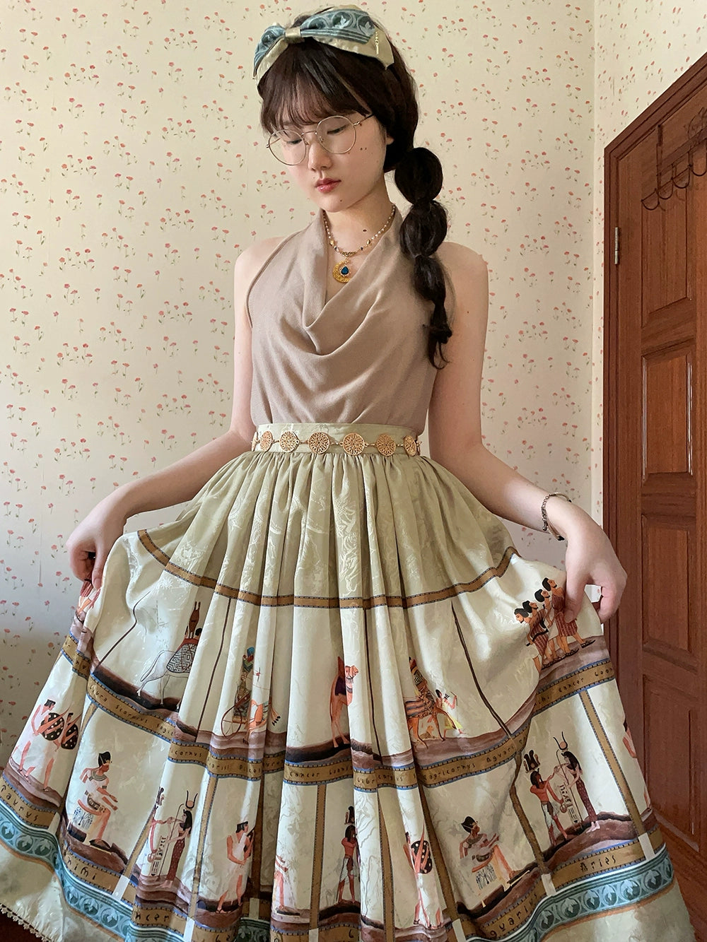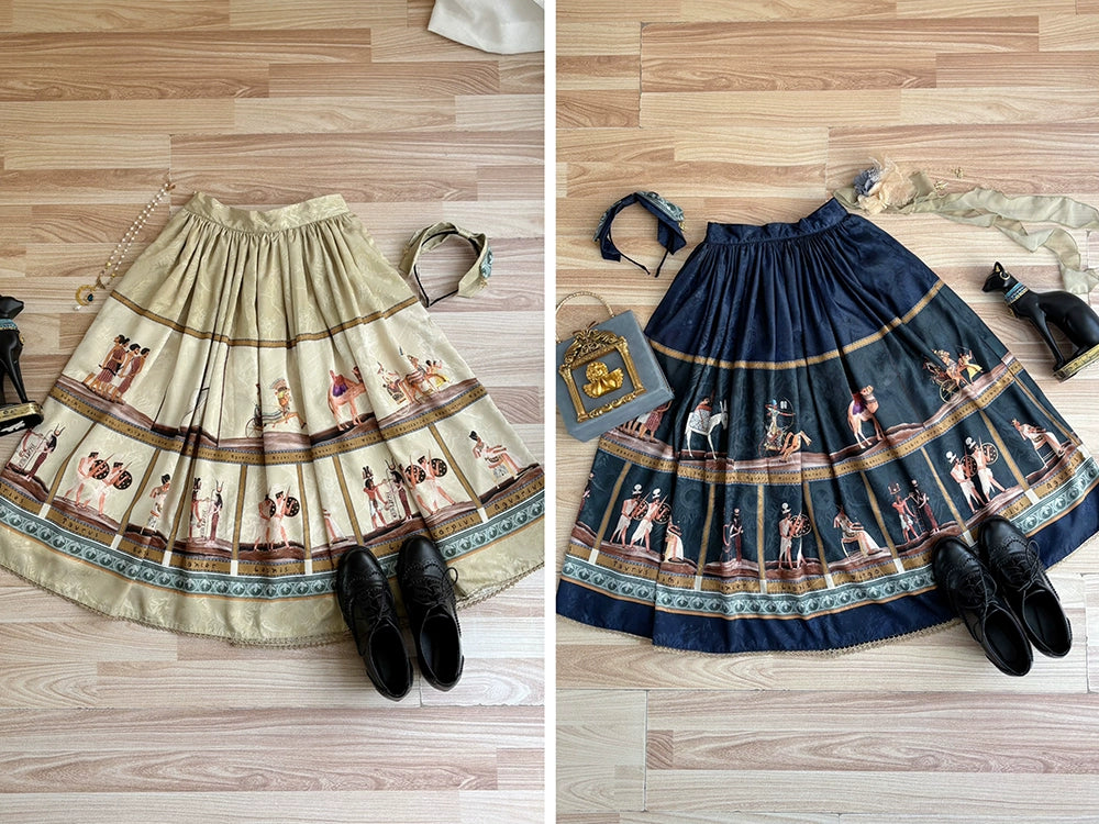 エジプト風のプリントが個性的なスカート。シンプルなデザインで日常使いにも。