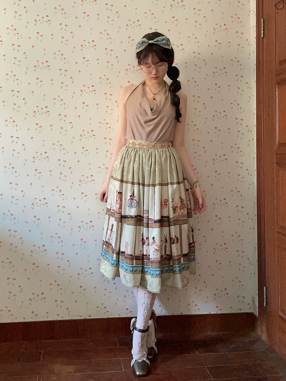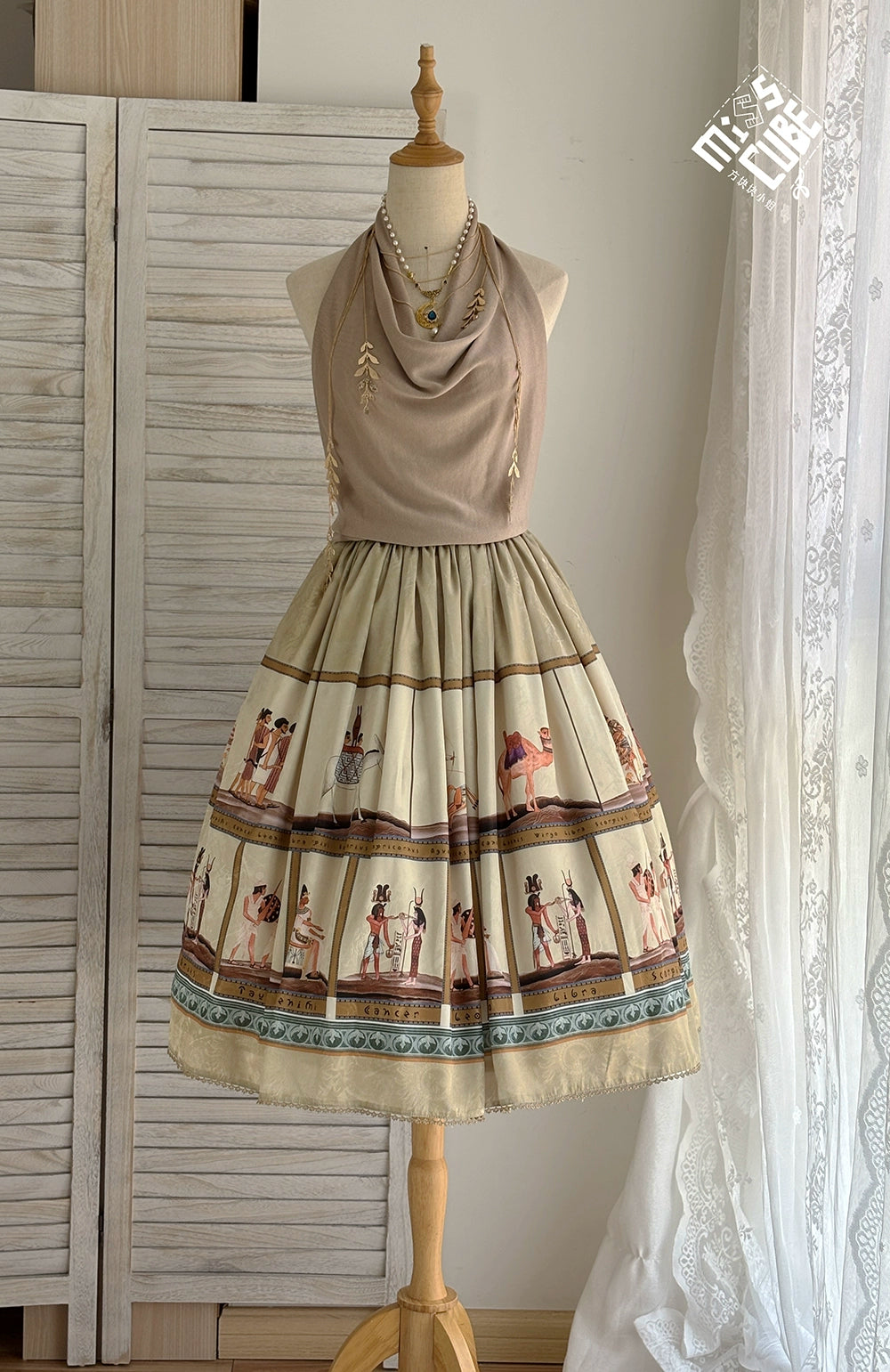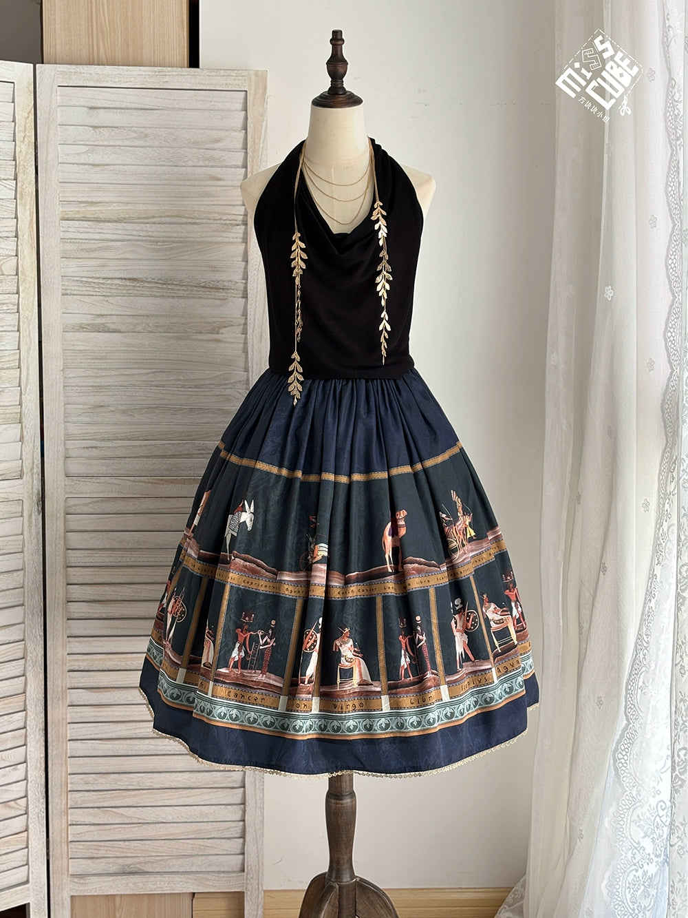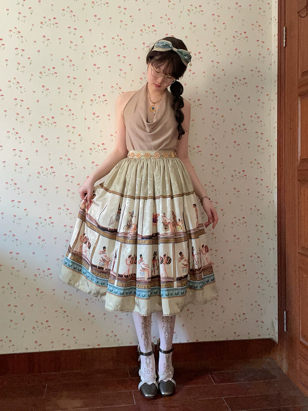 エジプト風のプリントが個性的なスカート。シンプルなデザインで日常使いにも。